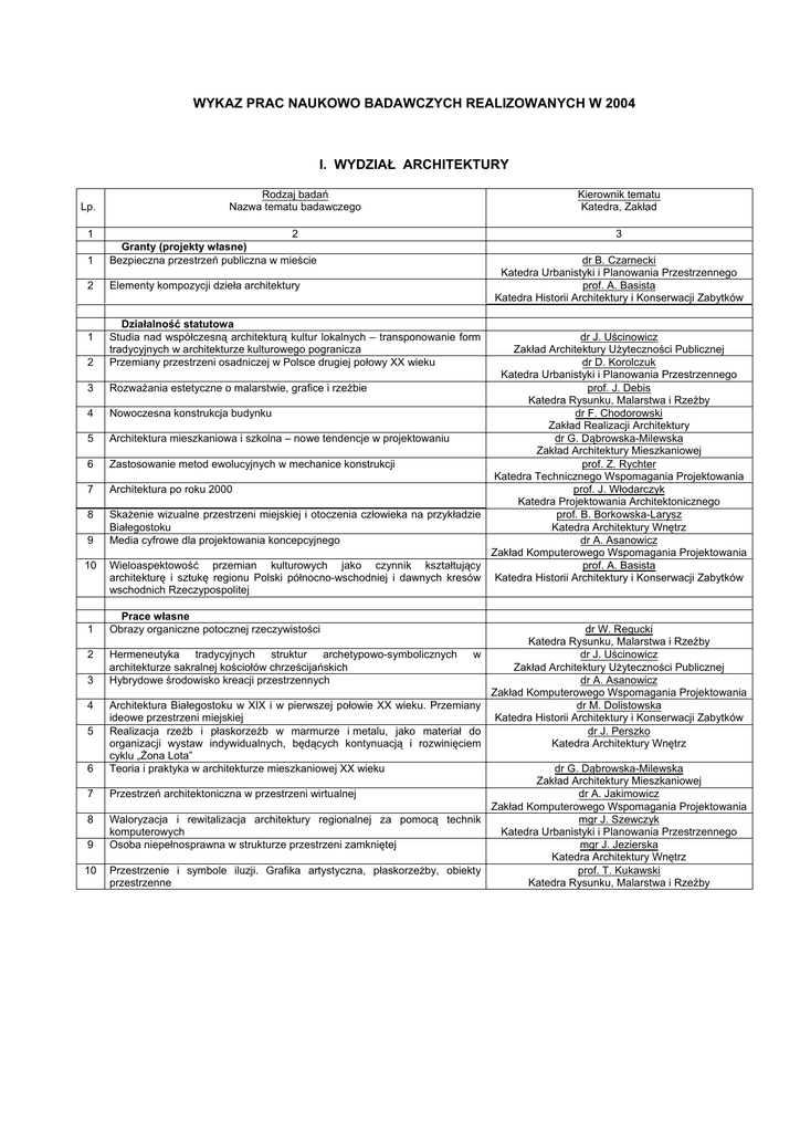 wykaz prac naukowo badawczych realizowanych w 2004 i. wydział