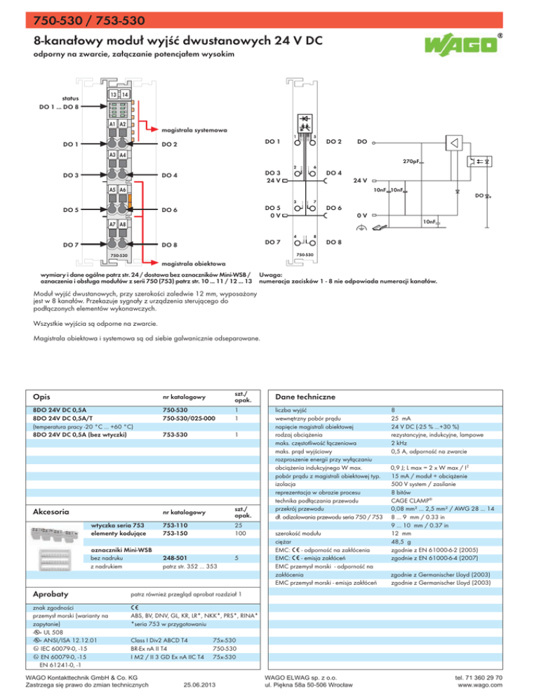 750-530 / 753-530 1 206 8-kanałowy moduł wyjść dwustanowych 24 V DC odporny na zwarcie, załączanie potencjałem wysokim 13 14 status DO 1 ... DO 8 A B C D E F G H A1 A2 magistrala systemowa DO 1 DO 2 DO 1 DO 2 DO 4 DO 3 24 V DO 4 DO A3 A4 270pF DO 3 24 V A5 A6 10nF 10nF DO DO 5 DO 5 0V DO 6 DO 6 0V 10nF A7 A8 DO 7 DO 7 DO 8 DO 8 750-530 magistrala obiektowa wymiary i dane ogólne patrz str. 24 / dostawa bez oznaczników Mini-WSB / oznaczenia i obsługa modułów z serii 750 (753) patrz str. 10 ... 11 / 12 ... 13 Uwaga: numeracja zacisków 1 - 8 nie odpowiada numeracji kanałów. Moduł wyjść dwustanowych, przy szerokości zaledwie 12 mm, wyposażony jest w 8 kanałów. Przekazuje sygnały z urządzenia sterującego do podłączonych elementów wykonawczych. Wszystkie wyjścia są odporne na zwarcie. Magistrala obiektowa i systemowa są od siebie galwanicznie odseparowane. Opis nr katalogowy szt./ opak. Dane techniczne 8DO 24V DC 0,5A 8DO 24V DC 0,5A/T (temperatura pracy -20 °C ... +60 °C) 8DO 24V DC 0,5A (bez wtyczki) 750-530 750-530/025-000 1 1 753-530 1 liczba wyjść wewnętrzny pobór prądu napięcie magistrali obiektowej rodzaj obciążenia maks. częstotliwość łączeniowa maks. prąd wyjściowy rozproszenie energii przy wyłączaniu obciążenia indukcyjnego W max. pobór prądu z magistrali obiektowej typ. izolacja reprezentacja w obrazie procesu technika podłączania przewodu przekrój przewodu dł. odizolowania przewodu seria 750 / 753 nr katalogowy szt./ opak. wtyczka seria 753 elementy kodujące 753-110 753-150 25 100 oznaczniki Mini-WSB bez nadruku z nadrukiem 248-501 patrz str. 352 ... 353 5 Akcesoria Aprobaty patrz również przegląd aprobat rozdział 1 znak zgodności przemysł morski (warianty na zapytanie) r UL 508 r ANSI/ISA 12.12.01 4 IEC 60079-0, -15 4 EN 60079-0, -15 EN 61241-0, -1 1 ABS, BV, DNV, GL, KR, LR*, NKK*, PRS*, RINA* *seria 753 w przygotowaniu Class I Div2 ABCD T4 BR-Ex nA II T4 I M2 / II 3 GD Ex nA IIC T4 szerokość modułu ciężar EMC: 1 - odporność na zakłócenia EMC: 1 - emisja zakłóceń EMC przemysł morski - odporność na zakłócenia EMC przemysł morski - emisja zakłóceń 8 25 mA 24 V DC (-25 % ...+30 %) rezystancyjne, indukcyjne, lampowe 2 kHz 0,5 A, odporność na zwarcie 0,9 J; L max = 2 x W max / I2 15 mA / moduł + obciążenie 500 V system / zasilanie 8 bitów CAGE CLAMP® 0,08 mm² ... 2,5 mm² / AWG 28 ... 14 8 ... 9 mm / 0.33 in 9 ... 10 mm / 0.37 in 12 mm 48,5 g zgodnie z EN 61000-6-2 (2005) zgodnie z EN 61000-6-4 (2007) zgodnie z Germanischer Lloyd (2003) zgodnie z Germanischer Lloyd (2003) 75x-530 750-530 75x-530 :$*2.RQWDNWWHFKQLN*PE+&R.* :$*2(/:$*VS]RR =DVWU]HJDVLĊSUDZRGR]PLDQWHFKQLF]Q\FK XO3LĊNQDD:URFáDZ WHO ZZZZDJRFRP