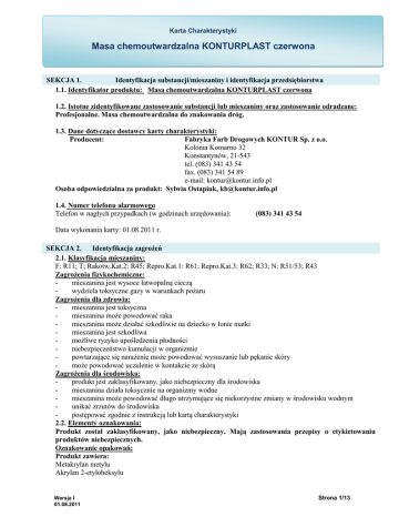 Karta Charakterystyki Masa chemoutwardzalna KONTURPLAST czerwona SEKCJA 1. Identyfikacja substancji/mieszaniny i identyfikacja przedsiębiorstwa 1.1. Identyfikator produktu: Masa chemoutwardzalna KONTURPLAST czerwona 1.2. Istotne zidentyfikowane zastosowanie substancji lub mieszaniny oraz zastosowanie odradzane: Profesjonalne. Masa chemoutwardzalna do znakowania dróg. 1.3. Dane dotyczące dostawcy karty charakterystyki: Producent: Fabryka Farb Drogowych KONTUR Sp. z o.o. Kolonia Komarno 32 Konstantynów, 21-543 tel. (083) 341 43 54 fax. (083) 341 54 89 e-mail: [email protected] Osoba odpowiedzialna za produkt: Sylwia Ostapiuk, [email protected] 1.4. Numer telefonu alarmowego Telefon w nagłych przypadkach (w godzinach urzędowania): (083) 341 43 54 Data wykonania karty: 01.08.2011 r. SEKCJA 2. Identyfikacja zagrożeń 2.1. Klasyfikacja mieszaniny: F: R11; T; Rakotw.Kat.2: R45; Repro.Kat.1: R61; Repro.Kat.3: R62; R33; N: R51/53; R43 Zagrożenia fizykochemiczne: mieszanina jest wysoce łatwopalną cieczą wydziela toksyczne gazy w warunkach pożaru Zagrożenia dla zdrowia: mieszanina jest toksyczna mieszanina może powodować raka mieszanina może działać szkodliwie na dziecko w łonie matki mieszanina jest szkodliwa możliwe ryzyko upośledzenia płodności niebezpieczeństwo kumulacji w organizmie powtarzające się narażenie może powodować wysuszanie lub pękanie skóry może powodować uczulenie w kontakcie ze skórą Zagrożenia dla środowiska: produkt jest zaklasyfikowany, jako niebezpieczny dla środowiska mieszanina działa toksycznie na organizmy wodne mieszanina może powodować długo utrzymujące się niekorzystne zmiany w środowisku wodnym unikać zrzutów do środowiska postępować zgodnie z instrukcją lub kartą charakterystyki 2.2. Elementy oznakowania: Produkt został zaklasyfikowany, jako niebezpieczny. Mają zastosowania przepisy o etykietowaniu produktów niebezpiecznych. Oznakowanie opakowań: Produkt zawiera: Metakrylan metylu Akrylan 2-etyloheksylu Wersja I 01.08.2011 Strona 1/13 Karta Charakterystyki Masa chemoutwardzalna KONTURPLAST czerwona C.I. Pigment Red 104 Może powodować uczulenie w kontakcie ze skórą Znaki ostrzegawcze: F Produkt wysoce łatwopalny T Produkt toksyczny N Produkt niebezpieczny dla środowiska Zwroty zagrożenia: R33 Niebezpieczeństwo kumulacji w organizmie R43 Może powodować uczulenie w kontakcie ze skórą R45 Może powodować raka R51/53 Działa toksycznie na organizmy wodne; może powodować długo utrzymujące się niekorzystne zmiany w środowisku wodnym R61 Może działać szkodliwie na dziecko w łonie matki R62 Możliwe ryzyko upośledzenia płodności Zwroty określające warunki bezpiecznego stosowania: S16 Nie przechowywać w pobliżu źródeł zapłonu - nie palić tytoniu S24 Unikać zanieczyszczenia skóry S36/37 Nosić odpowiednią odzież ochronną i odpowiednie rękawice ochronne S45 W przypadku awarii lub, jeżeli źle się poczujesz, niezwłocznie zasięgnij porady lekarza - jeżeli to możliwe, pokaż etykietę S53 Unikać narażenia - przed użyciem zapoznać się z instrukcją S60 Produkt i opakowanie usuwać jako odpad niebezpieczny S61 Unikać zrzutów do środowiska. Postępować zgodnie z instrukcją lub kartą charakterystyki Uwagi: Produkt wyłącznie do użytku profesjonalnego. UN: 1263 2.3 Inne zagrożenia: Brak. SEKCJA 3. Skład/informacja o składnikach 3.2. Mieszaniny: Klasyfikację substancji zawartych w produkcie podano zgodnie z tabelą 3.1 oraz 3.2 załącznika VI do Rozporządzenia Parlamentu Europejskiego i Rady (WE) nr 1272/2008 (rozporządzenie GHS) z uwzględnieniem 30 i 31 ATP do 67/548/EEC oraz na podstawie danych dostarczonych przez producenta. Nazwa niebezpiecznej substancji Wersja I 01.08.2011 Nr rejestracyjny REACH Zakres stężeń Numer CAS Numer indeksowy Numer WE Symbole niebezpieczeństwa Strona 2/13 Karta Charakterystyki Masa chemoutwardzalna KONTURPLAST czerwona F: R11 Xi: R37/38; R43 Metakrylan metylu C.I. Pigment Red 104; Pigment czerwony 104 (Colour Index C.I. 77605); Czerwony chromian molibdenian siarczan ołowiu Nie jest dostępny Nie jest dostępny 6-12% 5,4-6,0 % 80-62-6 12656-858 607-035-00-6 082-010-00-5 201-297-1 235-759-9 GHS02; GHS07 Niebezpieczeństwo FlamLiq2: H225 STOT SE3: H335 SkinIrrit2: H315 SkinSens1: H317 T Rakotw.Kat.2: R45; Repro.Kat.1: R61; Repro.Kat.3: R62; R33; N: R50/53 GHS08; GHS09 Niebezpieczeństwo Carc. 1B:H350 Repr. 1A: H360Df STOT RE 2:H373 Aquatic Acute1:H400 AquaticChronic1:410 Xi: R37/38; R43 Akrylan 2-etyloheksylu Trimetakrylan trimetylopropanu N,N-dimetylo-ptoluidyna Wersja I 01.08.2011 Nie jest dostępny 2,657,30 % 141-78-6 607-107-00-7 203-080-7 Nie jest dostępny <1 % 3290-92-4 brak 221-950-4 GHS07 Uwaga STOT SE3: H335 SkinIrrit2: H315 SkinSens1: H317 N: R51/53 Nie jest dostępny 0,02-0,2 % 99-97-8 612-056-00-9 202-508-4 GHS09 AquaticChro ic2:411 T: R23/24/25; R33; R52/53 GHS06; GHS08 Niebezpieczeństwo AcuteTox3: H301 AcuteTox3: H311 AcuteTox3: H331 STOT RE 2:H373 AquaticChronic3:412 Strona 3/13 Karta Charakterystyki Masa chemoutwardzalna KONTURPLAST czerwona T: R25; R52/53 N,N-bis-(2hydroksypropylo)-ptoluidyna Nie jest dostępny 0,02-01 % 38668-483 brak 254-075-1 GHS06 Niebezpieczeństwo AcuteTox3: H301 Aquatic Chronic3:412 Brzmienie użytych zwrotów – patrz p. 16. SEKCJA 4. Środki pierwszej pomocy 4.1. Opis środków pierwszej pomocy: 4.1.1 Wytyczne dotyczące pierwszej pomocy wg istotnych dróg narażenia: Kartę Charakterystyki okazać lekarzowi udzielającemu pomocy. W przypadku narażenia na pary i aerozole produktu osobę poszkodowaną przenieść do dobrze wentylowanego pomieszczenia zwrócić się o pomoc lekarską a) drogi oddechowe: osobę poszkodowaną natychmiast przenieść do dobrze wentylowanego pomieszczenia; osobę poszkodowaną umieścić w pozycji półleżącej, rozluźnić ubranie, upewnić się czy w ustach osoby poszkodowanej nie zalegają przedmioty lub wydzielina utrudniające oddychanie; jeżeli poszko