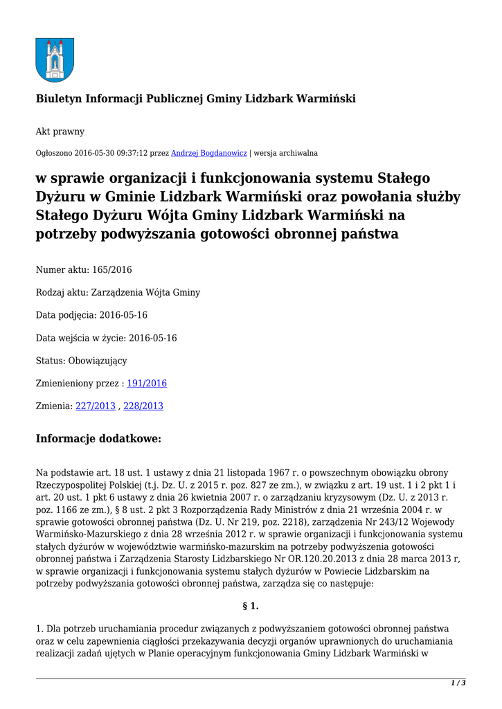 Biuletyn Informacji Publicznej Gminy Lidzbark Warmiński Akt prawny Ogłoszono 2016-05-30 09:37:12 przez Andrzej Bogdanowicz | wersja archiwalna w sprawie organizacji i funkcjonowania systemu Stałego Dyżuru w Gminie Lidzbark Warmiński oraz powołania służby Stałego Dyżuru Wójta Gminy Lidzbark Warmiński na potrzeby podwyższania gotowości obronnej państwa Numer aktu: 165/2016 Rodzaj aktu: Zarządzenia Wójta Gminy Data podjęcia: 2016-05-16 Data wejścia w życie: 2016-05-16 Status: Obowiązujący Zmienieniony przez : 191/2016 Zmienia: 227/2013 , 228/2013 Informacje dodatkowe: Na podstawie art. 18 ust. 1 ustawy z dnia 21 listopada 1967 r. o powszechnym obowiązku obrony Rzeczypospolitej Polskiej (t.j. Dz. U. z 2015 r. poz. 827 ze zm.), w związku z art. 19 ust. 1 i 2 pkt 1 i art. 20 ust. 1 pkt 6 ustawy z dnia 26 kwietnia 2007 r. o zarządzaniu kryzysowym (Dz. U. z 2013 r. poz. 1166 ze zm.), § 8 ust. 2 pkt 3 Rozporządzenia Rady Ministrów z dnia 21 września 2004 r. w sprawie gotowości obronnej państwa (Dz. U. Nr 219, poz. 2218), zarządzenia Nr 243/12 Wojewody Warmińsko-Mazurskiego z dnia 28 września 2012 r. w sprawie organizacji i funkcjonowania systemu stałych dyżurów w województwie warmińsko-mazurskim na potrzeby podwyższenia gotowości obronnej państwa i Zarządzenia Starosty Lidzbarskiego Nr OR.120.20.2013 z dnia 28 marca 2013 r, w sprawie organizacji i funkcjonowania systemu stałych dyżurów w Powiecie Lidzbarskim na potrzeby podwyższania gotowości obronnej państwa, zarządza się co następuje: § 1. 1. Dla potrzeb uruchamiania procedur związanych z podwyższaniem gotowości obronnej państwa oraz w celu zapewnienia ciągłości przekazywania decyzji organów uprawnionych do uruchamiania realizacji zadań ujętych w Planie operacyjnym funkcjonowania Gminy Lidzbark Warmiński w 1/3 warunkach wystąpienia zewnętrznego zagrożenia bezpieczeństwa państwa i w czasie wojny, organizuje się w gminie Lidzbark Warmiński system stałych dyżurów: 2. W skład systemu wchodzą: 1) stały dyżur Wójta Gminy Lidzbark Warmiński, 2) stały dyżur Dyrektora Zespołu Szkół w Rogożu, 3. Wszystkie ogniwa stałego dyżuru zobowiązane są do pełnej gotowości do pracy, sprawnego funkcjonowania i realizacji powierzonych zadań oraz współdziałania z innymi komórkami systemu, 4. Stałe dyżury o których mowa w pkt 2 organizuje się przy wykorzystaniu pracowników i bazy lokalowo-sprzętowej jednostki. 5. Stały Dyżur Wójta Gminy w Lidzbarku Warmińskim pełniony będzie w systemie dwuzmianowym, w składzie dwóch osób na zmianę, z zachowaniem przepisów działu VI ustawy z dnia 26 czerwca 1974 roku – Kodeks Pracy. 6. W terminie do 30 lipca 2016 r zobowiązuję Dyrektora Zespołu Szkół w Rogóżu w porozumieniu z Wójtem Gminy do aktualizacji dokumentacji określającej zasady działania i organizacji stałego dyżuru oraz skład osobowy. § 2. Do pełnienia służby Stałego Dyżuru Wójta Gminy Lidzbark Warmiński wyznaczam następujący skład osobowy: Zmiana I 1/ starszy dyżurny - Skonieczna Kamila 2/ dyżurny – Pastuch Izabela Zmiana II 1/ starszy dyżurny - Mikulak Agnieszka 2/ dyżurny - Buczyńska Iwona Zmiana rezerwowa 1/ starszy dyżurny - Mazuro Marta 2/ dyżurny – Apanowicz Joanna § 3. Na miejsce pełnienia służby Stałego Dyżuru wyznacza się pomieszczenie sekretariatu Urzędu Gminy Lidzbark Warmiński, przeznaczając dla potrzeb dyżuru sprzęt łączności i teletransmisji będący na wyposażeniu sekretariatu. § 4. 1. Dla potrzeb służby Stałego Dyżuru przydzielam środek transportu – samochód Urzędu Gminy – Volkswagen NLI 30EC wraz z kierowcą. 2. Uruchamiając służbę Stałego Dyżuru Urzędu Gminy należy przewidzieć możliwość wykorzystania prywatnych środków transportu pracowników z zachowaniem przepisów regulujących zwrot kosztów używania do celów służbowych samochodów osobowych, motocykli i motorowerów niebędących własnością pracodawcy. § 5. Zasady organizacji, uruchamiania i funkcjonowania systemu stałego dyżuru Wójta Gminy Lidzbark Warmiński określa Instrukcja Działania Stałego Dyżuru stanowiąca niepublikowany załącznik do niniejszego zarządzenia. 2/3 § 6. Za organizację, zabezpieczenie oraz funkcjonowanie Stałego Dyżuru Wójta Gminy Lidzbark Warm. czynię odpowiedzialnym: 1) Sekretarza Gminy Lidzbark Warmiński: a) za przygotowanie pomieszczenia i wyposażenie Stałego Dyżuru w niezbędny sprzęt i urządzenia, w tym środki łączności i środki transportowe, b) bieżącej koordynacji przedsięwzięć związanych z organizacją Systemu Stałego Dyżuru tj. trybu i zasad szkolenia osób wyznaczonych do pełnienia dyżurów oraz nadzoru i kontroli ich gotowości; c) wszechstronnego zabezpieczenia i sprawnego funkcjonowania Stałego Dyżuru Wójta Gminy Lidzbark Warmiński. d) okresowe przeszkolenie osób wchodzących w skład stałego dyżuru. e) udzielanie instruktażu poprzez sprawdzanie znajomości szczegółowej instrukcji i przeprowadzanie ćwiczeń. 2) Pracownika do spraw obronnych do: a) opracowania Instrukcji Działania Stałego Dyżuru Wójta Gminy Lidzbark Warmiński, b) zorganizowania, przygotowania i funkcjonowania Stałego Dyżuru Wójta Gminy zgodnie z zasadami określonymi w Instrukcji Działania Stałego Dyżuru, c) zapewnienia sprawnego przepływu informacji od Wójta Gminy Lidzbark Warmiński do Starosty Lidzbarskiego oraz operatywnego przekazywania decyzji i informacji od Wójta Gminy do komórek organizacyjnych Urzędu Gminy Lidzbark Warmiński i innych jednostek organizacyjnych realizujących zadania obronne. § 7. Zobowiązuje się Sekretarza Gminy Lidzbark Warmiński do sprawowania nadzoru nad całokształtem spraw związanych z organizacją stałego dyżuru oraz ćwiczebnego sprawowania gotowości funkcjonowania §8. Wykonanie zarządzenia powierza się Sekretarzowi Gminy. § 9. Traci moc Zarządzenie Nr 227/2013 Wójta Gminy Lidzbark Warmiński 