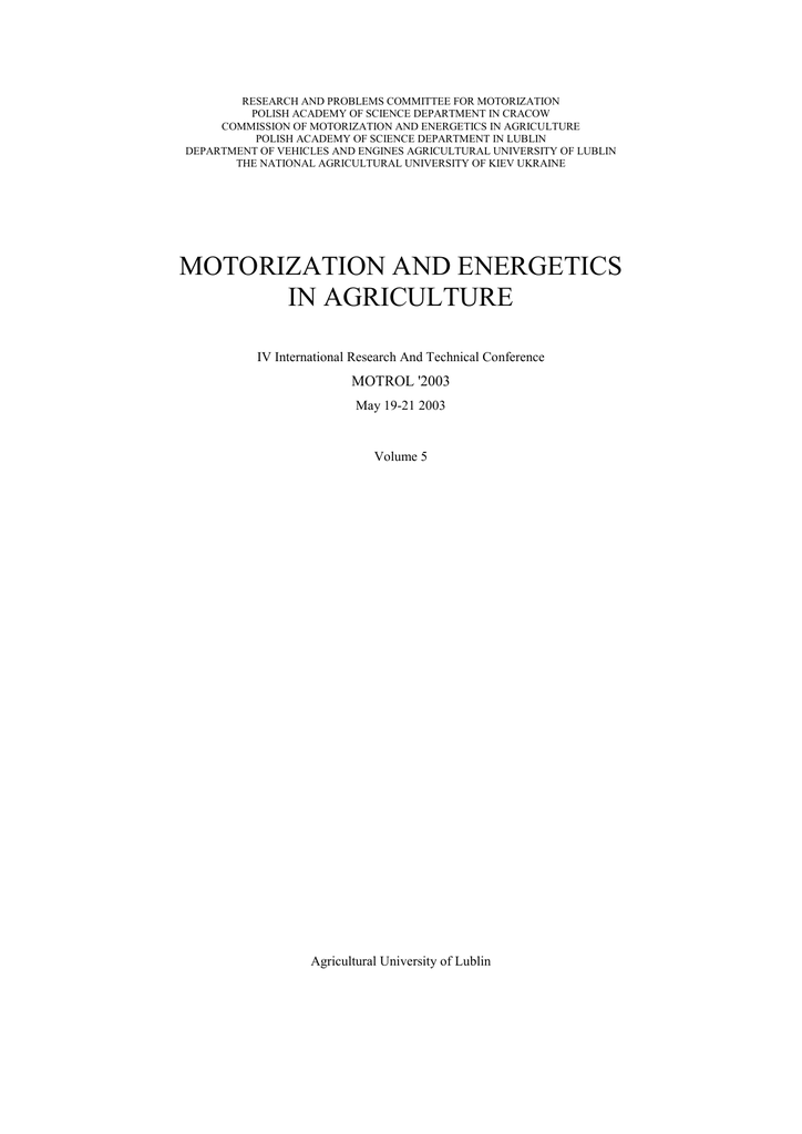 RESEARCH AND PROBLEMS COMMITTEE FOR MOTORIZATION POLISH ACADEMY OF SCIENCE DEPARTMENT IN CRACOW COMMISSION OF MOTORIZATION AND ENERGETICS IN AGRICULTURE POLISH ACADEMY OF SCIENCE DEPARTMENT IN LUBLIN DEPARTMENT OF VEHICLES AND ENGINES AGRICULTURAL UNIVERSITY OF LUBLIN THE NATIONAL AGRICULTURAL UNIVERSITY OF KIEV UKRAINE MOTORIZATION AND ENERGETICS IN AGRICULTURE IV International Research And Technical Conference MOTROL '2003 May 19-21 2003 Volume 5 Agricultural University of Lublin KOMISJA NAUKOWO-PROBLEMOWA MOTORYZACJI PAN, ODDZIAŁ W KRAKOWIE KOMISJA MOTORYZACJI I ENERGETYKI ROLNICTWA PAN, ODDZIAŁ W LUBLINIE KATEDRA POJAZDÓW I SILNIKÓW AKADEMII ROLNICZEJ W LUBLINIE NARODOWY UNIWERSYTET ROLNICZY W KIJOWIE MOTORYZACJA I ENERGETYKA ROLNICTWA IV Międzynarodowa Konferencja Naukowo–Techniczna MOTROL’2003 19-21 maja 2003 Tom 5 Agricultural University of Lublin Wydawnictwo Komitet redakcyjny Andrzej Ambrozik, Cezary Bocheński, Wołodymyr Bułgakow, Eugeniusz Krasowski – przewodniczący, Ryszard Michalski, Janusz Mysłowski, Wiesław Piekarski – sekretarz, Andrzej Roszkowski, Bogdan śółtowski Komitet naukowy Andrzej Ambrozik, Cezary Bocheński, Wołodymyr Bułgakow, Karol Cupiał, Henryk Dajniak, Edward Dreszczyk, Kazimierz Dreszer, Anatolij Z. Filippow, Wiesław Grzesikiewicz, Janusz Haman, Anatolij N. Jakowenko, Janusz Kaczorowski, Eugeniusz Kamiński, Zdzisław Kośmicki, Eugeniusz Krasowski – przewodniczący, Adam Krysztofiak, Andrzej Kusz, Andrzej Kwieciński, Kazimierz Lejda, Adam Łuksa, Mikołaj Miatluk, Ryszard Michalski, Kazimierz Mielec, Andrzej Mruk, Janusz Mysłowski, Stanisław Niziński, Jan Pawlak, Wiesław Piekarski, Simion Popescu, Andrzej Roszkowski, Alojzy Skrobacki, Bolesław Stolarski, Zygmunt Szlachta, Mieczysław Szpryngiel, Georgii F. Tajanowski, Piotr Tarkowski, Jan A. Wajand, Dmytro Wojtiuk, Marian Zabłocki, Bogdan śółtowski – wiceprzewodniczący Komitet organizacyjny Cezary Bocheński – wiceprzewodniczący, Wołodymyr Bułgakow – wiceprzewodniczący, Zbigniew Burski, Hanna Krasowska, Eugeniusz Krasowski – przewodniczący, Wiesław Piekarski, Krzysztof Plizga, Jacek Wasilewski, Grzegorz Zając – sekretarz, Jan Zalewski Recenzenci Cezary Bocheński, Wołodymyr Bułgakov, Zbigniew Burski, Kazimierz Dreszer, Anatolij Filippow, Roman Koper, Eugeniusz Krasowski, Andrzej Kusz, Andrzej Kwieciński, Janusz Laskowski, Kazimierz Lejda, Ryszard Michalski, Janusz Mysłowski, Stanisław Niziński, Wiesław Piekarski, Andrzej Roszkowski, Alojzy Skrobacki, Zygmunt Szlachta, Mieczysław Szpryngiel, Piotr Tarkowski, Jan A. Wajand, Dmytro Wojtiuk, Zdzisław Wójcicki, Marian Zabłocki, Anatolij Zacharow, Bogdan śółtowski Opracowanie redakcyjne: Ewa Rózycka Lektor języka angielskiego: Małgorzata Wojcieszuk Skład i łamanie: Grzegorz Zając Projekt okładki: Barbara Jarosik Wydanie publikacji dofinansowane przez Komitet Badań Naukowych ISBN 83-7259-058-3 WYDAWNICTWO Nakład 150 + 16 egz. Ark. druk. 23,87. Zam. nr ..../2003 Pracownia Poligraficzna AR w Lublinie