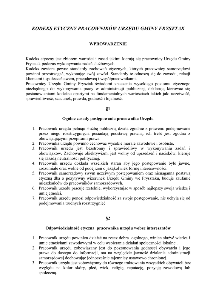 KODEKS ETYCZNY PRACOWNIKÓW URZĘDU GMINY FRYSZTAK WPROWADZENIE Kodeks etyczny jest zbiorem wartości i zasad jakimi kierują się pracownicy Urzędu Gminy Frysztak podczas wykonywania zadań służbowych. Kodeks zawiera pewne standardy zachowań etycznych, których pracownicy samorządowi powinni przestrzegać, wykonując swój zawód. Standardy te odnoszą się do zawodu, relacji klientami i społeczeństwem, pracodawcą i współpracownikami. Pracownicy Urzędu Gminy Frysztak świadomi znaczenia wysokiego poziomu etycznego niezbędnego do wykonywania pracy w administracji publicznej, deklarują kierować się postanowieniami kodeksu opartymi na fundamentalnych wartościach takich jak: uczciwość, sprawiedliwość, szacunek, prawda, godność i lojalność. §1 Ogólne zasady postępowania pracownika Urzędu 1. Pracownik urzędu pełniąc służbę publiczną działa zgodnie z prawem: podejmowane przez niego rozstrzygnięcia posiadają podstawę prawną, ich treść jest zgodna z obowiązującymi przepisami prawa. 2. Pracownika urzędu powinno cechować wysokie morale zawodowe i osobiste. 3. Pracownik urzędu jest bezstronny i sprawiedliwy w wykonywaniu zadań i obowiązków. Zachowuje obiektywizm, jest wolny od uprzedzeń i nacisków, kieruje się zasadą neutralności politycznej. 4. Pracownik urzędu dokłada wszelkich starań aby jego postępowanie było jawne, zrozumiałe oraz wolne od podejrzeń o jakąkolwiek formę interesowności. 5. Pracownik samorządowy swym uczciwym postępowaniem oraz nienaganna postawą etyczną dba o pozytywny wizerunek Urzędu Gminy we Frysztaku, buduje zaufanie mieszkańców do pracowników samorządowych. 6. Pracownik urzędu pracuje rzetelnie, wykorzystując w sposób najlepszy swoją wiedzę i umiejętności. 7. Pracownik urzędu ponosi odpowiedzialność za swoje postępowanie, nie uchyla się od podejmowania trudnych rozstrzygnięć §2 Odpowiedzialność etyczna pracownika urzędu wobec interesantów 1. Pracownik urzędu powinien działać na rzecz dobra ogólnego, winien służyć wiedzą i umiejętnościami zawodowymi w celu wspierania działań społeczności lokalnej. 2. Pracownik urzędu zobowiązany jest do poszanowania godności obywatela i jego prawa do dostępu do informacji, ma na względzie jawność działania administracji samorządowej dochowując jednocześnie tajemnicy ustawowo chronionej. 3. Pracownik urzędu jest zobowiązany do równego traktowania wszystkich obywateli bez względu na kolor skóry, płeć, wiek, religię, reputację, pozycję zawodową lub społeczną. 4. Pracownik urzędu zobowiązany jest do sprawnego organizowania przyjęć klientów i udzielania im pełnej informacji na temat spraw załatwianych w urzędzie, z wrażliwością mającą na względzie wiek, zdolność rozumienia przepisów prawa, ewentualną niepełnosprawność, prywatność itp. 5. W trakcie załatwiania indywidualnych spraw pracownik okazuje szacunek dla klienta, jest uprzejmy, pomocny, w razie konieczności konsultuje sprawę z innymi pracownikami, aby w sposób wyczerpujący i dokładny udzielić informacji bądź podjąć słuszną decyzję. 6. Przy podejmowaniu decyzji pracownik zwraca uwagę, aby stosownie wyważyć dobro konkretnej osoby i ogólnego interesu publicznego. 7. Pracownik dba, aby sprawy załatwiane były sprawnie, szybko, bez zbędnej zwłoki. 8. Pracownik urzędu zobowiązany jest do zachowania w tajemnicy informacji uzyskanych od klienta w trakcie rozpatrywania jego sprawy. §3 Odpowiedzialność etyczna wobec pracodawcy i współpracowników 1. Pracownik jest lojalny wobec zwierzchników. Starannie i sumiennie wypełnia polecenia zgodne z obowiązującym prawem, według najlepszej woli i wiedzy. 2. Pracownik racjonalnie dysponuje gminnym majątkiem i środkami publicznymi przeznaczonymi na realizowanie zadania. 3. Pracownik urzędu dba o własny rozwój, doskonali swą wiedzę zawodową i umiejętności potrzebne do zapewnienia wysokiego poziomy swojej pracy. 4. W kontaktach z współpracownikami pracownik urzędu jest życzliwy, zapobiega konfliktom w pracy, a w razie ich zaistnienia w sposób obiektywny i bez uszczerbku dla obywatela stara się je rozwiązać. 5. Pracownik Urzędu jest otwarty na współpracę, korzysta z doświadczenia i wiedzy współpracowników w celu wykonywania obowiązków służbowych dla dobra interesanta. 6. Pracownik urzędu winien uczynić wszystko, aby przygotować nowych pracowników, stażystów czy praktykantów do wykonywania zawodu, przekazując im wiedzę, doświadczenie oraz kształtując ich podstawy etyczne. §4 Postanowienia końcowe 1. Niniejszy kodeks po podpisaniu przez wszystkich pracowników zostanie podany do publicznej wiadomości w celu poinformowania mieszkańców Frysztaka o standardach zachowań jakimi kierują się pracownicy Urzędu Gminy Frysztak. 2. W celu stałego podnoszenia jakości usług świadczonych w urzędzie, Kodeks Etyczny Pracowników Urzędu Gminy Frysztak okresowo poddawany będzie dyskusji wewnętrznej, a wnioski będą wykorzystywane przy jego aktualizacji. 3. Nowo zatrudnieni pracownicy mają obowiązek zapoznania się kodeksem, a w razie ewentualnych uwag kodeks poddawany jest ponownej dyskusji. Frysztak 26.09.2005 rok