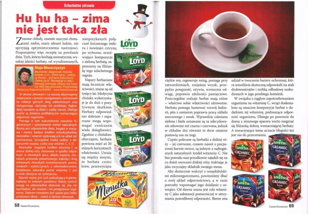 l Szlachetne zdrowie Hu hu ha - zima nie jest taka Z imowe chłody, zasnute szarymi chmurami niebo, szaro ubrani ludzie, nie sprzyjają optymistycznemu nastrojowi. Proponujemy więc receptę na powitanie dnia. Tych, którzy kochają aromatyczne, wysokiej jakości herbaty, od wyrafinowanych, zła niespotykanych połą czeń korzennego imbiru i świeżości cytryny, po wyborne, orzeź wiające kompozycje z zieloną herbatą, zapraszamy na filiżan kę tego szlachetnego napoju. Napary herbaciane mają lecznicze wła ściwości, znane są od tysięcy lat. Medycyna chińska wykorzystuje je do dziś z pozytywnym skutkiem. Herbaty odpowied- , nio dobrane i zaparzane mogą wspomagać zwalczanie wielu dolegliwości. Zgodnie z chińskim obyczajem, herbata powinna mieć aż 20 różnych korzystnych właściwości. Uważa się między innymi, że herbata czyści krew, przezwycięża 68 Gazeta Kuracjusza ciężkie sny, regeneruje mózg, pornaga przy udział w tworzeniu bariery ochronnej, któzatwardzeniach, rozjaśnia wzrok, prze- ra umożliwia skuteczną odpowiedź na atak pędza posępność, ożywia, wzmacnia od- drobnoustrojów i szybką odbudowę uszkodzonych w jego przebiegu komórek. wagę, poprawia zdolności pamięciowe. W związku z ciągłym zapotrzebowaniem Poszczególne rodzaje herbat mają różne - właściwe sobie właściwości zdrowotne. organizmu na witaminę C, wciąż doskonaHerbata pornaga hamować rozwój bakte- lone są smaczne kompozycje herbat z dorii, pita z umiarem poprawia pracę układu datkiem tej witaminy, podnoszące odpormoczowego i nerek. Wprawdzie odmiana ność organizmu. Dlatego po powrocie do zielona i biała uznawane są za zdecydowa- domu z zimowego spaceru warto rozgrzać nie zdrowsze niż czarna i czerwona, jednak się filiżanką dobrej, wzmacniającej herbaty. w chłodne dni również te dwie ostatnie A towarzyszące ternu uczucie błogości też postawią nas na nogi. jest nie do przecenienia. Często polecane są herbatki z dzikiej róży - jej czerwone, czasem nawet o purpurowej barwie owoce, są jednym z najbogatszych naturalnych źródeł witaminy C. Nie bez powodu nasi przodkowie zajadali się na co dzień owocarni dzikiej róży, traktując je jako zwyczajny składnik swojego menu. Aby skutecznie walczyć z wszędobylski mi mikroorganizmami, powinniśmy dbać o swój układ odpornościowy, a w razie potrzeby wspomagać jego działanie z zewnątrz. Od dawna znana jest rola witaminy C jako substancji pomocniczej w utrzymaniu prawidłowej odporności. Bierze ona Gazeta Kuracjusza 69