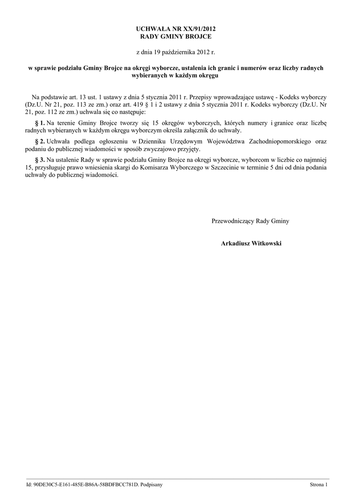 UCHWAŁA NR XX/91/2012 RADY GMINY BROJCE z dnia 19 października 2012 r. w sprawie podziału Gminy Brojce na okręgi wyborcze, ustalenia ich granic i numerów oraz liczby radnych wybieranych w każdym okręgu Na podstawie art. 13 ust. 1 ustawy z dnia 5 stycznia 2011 r. Przepisy wprowadzające ustawę - Kodeks wyborczy (Dz.U. Nr 21, poz. 113 ze zm.) oraz art. 419 § 1 i 2 ustawy z dnia 5 stycznia 2011 r. Kodeks wyborczy (Dz.U. Nr 21, poz. 112 ze zm.) uchwala się co następuje: § 1. Na terenie Gminy Brojce tworzy się 15 okręgów wyborczych, których numery i granice oraz liczbę radnych wybieranych w każdym okręgu wyborczym określa załącznik do uchwały. § 2. Uchwała podlega ogłoszeniu w Dzienniku Urzędowym Województwa Zachodniopomorskiego oraz podaniu do publicznej wiadomości w sposób zwyczajowo przyjęty. § 3. Na ustalenie Rady w sprawie podziału Gminy Brojce na okręgi wyborcze, wyborcom w liczbie co najmniej 15, przysługuje prawo wniesienia skargi do Komisarza Wyborczego w Szczecinie w terminie 5 dni od dnia podania uchwały do publicznej wiadomości. Przewodniczący Rady Gminy Arkadiusz Witkowski ————————————————————————————————————————————————————————— Id: 90DE30C5-E161-485E-B86A-58BDFBCC781D. Podpisany Strona 1 Załącznik Nr 1 do Uchwały Nr XX/91/2012 Rady Gminy Brojce z dnia 19 października 2012 r. PODZIAŁ GMINY BROJCE NA OKRĘGI WYBORCZE, USTALENIE ICH NUMERÓW I GRANIC ORAZ LICZBY RADNYCH WYBIERANYCH W KAŻDYM OKRĘGU numer okręgu 1 2 3 4 5 6 7 8 9 10 11 12 13 14 15 granice okręgu wyborczego ilość radnych Sołectwo Bielikowo Część sołectwa Brojce - obejmująca część ul. Brzozowej od bloku nr 1 do bloku nr 6 Część sołectwa Brojce - obejmująca część ul. Brzozowej nr 7, 8, 9 (bloki) i od nr domu 10 do numeru 36 Część sołectwa Brojce obejmująca ul. Łąkową, Młyńską, Sosnową, Wrzosową, część ulicy Długiej nr 47, 49, 50, 51, 52, 53, 55, 56 Część sołectwa Brojce obejmująca Karwin, Kolonię Trójka, Kolonię Szóstka, Kolonię Dziewiątka, część ul. Długiej nr 19, 20, 21, 22, 22A, 23, 24, 25, 26, 27, 32, 32A, 33, 34, 35, 36, 37, 38 Część sołectwa Brojce obejmująca część ul. Długiej nr 1, 2, 3, 4, 5, 6, 7, 8, 9, 9A, 10, 11, 12A, 13, 14, 15, 16, 17, 18, 39, 40, 41, 42, 42A, 43, 44, 45, 54, 57, ul. Parkowa Część sołectwa Dargosław obejmująca miejscowość Dargosław i Łatno Sołectwo Darżewo oraz część sołectwa Dargosław obejmująca miejscowość Uniestowo Część sołectwa Kiełpino obejmująca miejscowości Kiełpino, Raciborów Sołectwo Mołstowo obejmujące miejscowości Mołstowo, Mołstówko i Cieszyce Sołectwo Pruszcz Sołectwo Przybiernowo Sołectwo Strzykocin obejmujące miejscowości Strzykocin, Grąd oraz część sołectwa Kiełpino obejmująca miejscowość Smokęcino Sołectwo Tąpadły obejmujące miejscowość Tąpadły, Stołąż Sołectwo Żukowo 1 1 1 1 1 1 1 1 1 1 1 1 1 1 1 ————————————————————————————————————————————————————————— Id: 90DE30C5-E161-485E-B86A-58BDFBCC781D. Podpisany Strona 1