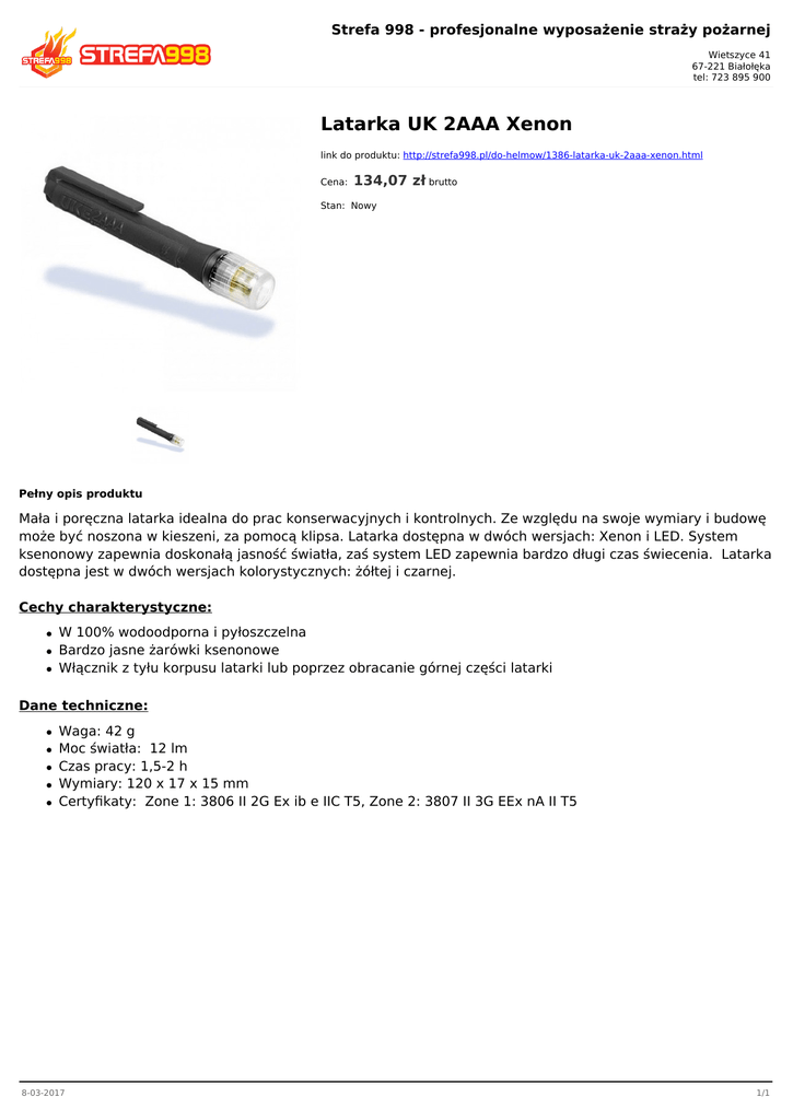 Strefa 998 - profesjonalne wyposażenie straży pożarnej Wietszyce 41 67-221 Białołęka tel: 723 895 900 Latarka UK 2AAA Xenon link do produktu: http://strefa998.pl/do-helmow/1386-latarka-uk-2aaa-xenon.html Cena: 134,07 zł brutto Stan: Nowy Pełny opis produktu Mała i poręczna latarka idealna do prac konserwacyjnych i kontrolnych. Ze względu na swoje wymiary i budowę może być noszona w kieszeni, za pomocą klipsa. Latarka dostępna w dwóch wersjach: Xenon i LED. System ksenonowy zapewnia doskonałą jasność światła, zaś system LED zapewnia bardzo długi czas świecenia. Latarka dostępna jest w dwóch wersjach kolorystycznych: żółtej i czarnej. Cechy charakterystyczne: W 100% wodoodporna i pyłoszczelna Bardzo jasne żarówki ksenonowe Włącznik z tyłu korpusu latarki lub poprzez obracanie górnej części latarki Dane techniczne: Waga: 42 g Moc światła: 12 lm Czas pracy: 1,5-2 h Wymiary: 120 x 17 x 15 mm Certyfikaty: Zone 1: 3806 II 2G Ex ib e IIC T5, Zone 2: 3807 II 3G EEx nA II T5 8-03-2017 1/1