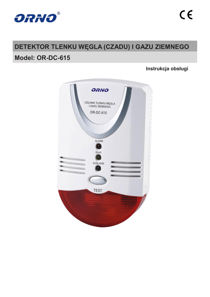 DETEKTOR TLENKU WĘGLA (CZADU) I GAZU ZIEMNEGO Model: OR-DC-615 Instrukcja obsługi Przed podłączeniem i użytkowaniem urządzenia prosimy o dokładne zapoznanie się z niniejszą instrukcją obsługi i zachowanie jej dopóki produkt jest używany. Zawiera ona ważne informacje na temat działania oraz instalacji detektora. Instrukcję należy traktować jako niezbędną część produktu. W razie jakichkolwiek problemów ze zrozumieniem jej treści prosimy o skontaktowanie się ze sprzedawcą urządzenia. Producent nie odpowiada za uszkodzenia mogące wyniknąć z nieprawidłowego montażu czy eksploatacji urządzenia. Dokonywanie samodzielnych napraw i modyfikacji skutkuje utratą gwarancji. Wygląd, cechy, funkcje i dane techniczne urządzenia mogą ulec zmianie bez wiedzy użytkownika. Wszelkie prawa do tłumaczenia/interpretowania oraz prawa autorskie niniejszej instrukcji są zastrzeżone. Urządzenie musi być zainstalowane przez osobę kompetentną zgodnie z poniższą instrukcją obsługi. 1. Nie używaj urządzenia niezgodnie z jego przeznaczeniem. 2. Nie zanurzaj urządzenia w wodzie i innych płynach. 3. Nie obsługuj urządzenia gdy uszkodzona jest obudowa. 4. Nie rozkręcaj urządzenia i nie dokonuj samodzielnych napraw. UWAGA Gwarancja 24-miesięczna obejmuje produkt wyposażony w fabryczną plombę, której nie należy zrywać! OSTRZEŻENIE Niniejsze urządzenie jest przeznaczone do zapewnienia ochrony przed poważnymi skutkami narażenia na działanie tlenku węgla i gazu ziemnego. Nie zapewnia ono całkowitego bezpieczeństwa osobom o szczególnych uwarunkowaniach zdrowotnych. W razie wątpliwości, należy skonsultować się z lekarzem. Gaz ziemny jest gazem bezbarwnym o słabym zapachu i jest lżejszy od powietrza, gromadzi się w górnych partiach pomieszczeń. W połączeniu z tlenem w powietrzu tworzy mieszaninę palną i wybuchową. Największe zagrożenie występuje podczas nieszczelności np. kuchenki gazowej. Zapłon może nastąpić od urządzeń znajdujących się powyżej jak np. włącznik światła. Przyczyny wycieku gazu ziemnego: Niewłaściwy zapłon. Zgaszenie płomienia gazu podczas gotowania wywołane podmuchem wiatru. Zgaszenie płomienia gazu podczas gotowania wywołane zmianą ciśnienia gazu. Zawór gazowy nie został dokładnie zamknięty. Niewłaściwe wykorzystanie narządzi kuchennych. Uszkodzenie węża doprowadzającego gaz. Inne przyczyny. Tlenek węgla (CO) jest bezbarwnym, bezwonnym i silnie trującym gazem. Obecność tlenku węgla w krwiobiegu zaburza możliwość transportowania tlenu przez krew, co prowadzi do uszkodzenia serca i mózgu na skutek niedotlenienia. Tlenek węgla powstaje w wyniku niecałkowitego spalania paliw, takich jak: gaz ziemny, propan, benzyna, węgiel czy olej opałowy. Do emisji tlenku węgla może dojść w każdej instalacji uzyskującej energię poprzez spalanie. Nie istnieje jednak ściśle określona wartość niebezpiecznego stężenia tlenku węgla. Jest ona uzależniona od czasu przebywania człowieka w otoczeniu tego gazu. Urządzenia będące źródłem tlenku węgla: kocioł na paliwo ciekłe lub gazowe (olej opałowy, mazut, gaz ziemny itp.), kocioł na paliwo stałe (drewno, węgiel, koks, torf itp.), gazowy podgrzewacz wody (np. piecyk łazienkowy), kominek, przenośny piecyk gazowy, piec kaflowy, kuchenka gazowa itp. Możliwe przyczyny wysokiego stężenia tlenku węgla w budynku mieszkalnym: Nieprawidłowe lub niestaranne zainstalowanie urządzenia spalającego paliwa. Niedrożne lub popękane kominy. Instrukcja obsługi OR-DC-615 Strona 2 Niedrożne kanały wentylacyjne lub szczelne zabezpieczenia przed przeciągami. Silniki spalinowe samochodów, kosiarek itd. uruchomione i pozostawione w pomieszczeniach zamkniętych. Przenośne podgrzewacze parafinowe lub gazowe w źle wentylowanych pomieszczeniach. Objawy zatrucia tlenkiem węgla Stężenie CO Czas wdychania (przybliżony) i rozwój objawów w powietrzu ppm* 50 Maksymalne dopuszczalne stężenie przy ciągłym narażeniu przez okres 8 godz. 150 Lekki ból głowy po 1,5 godz. 200 Lekki ból głowy, zmęczenie, zawroty głowy, nudności po 2-3 godz. 400 Ból z przodu głowy w ciągu 1-2 godz. Zagrożenie życia po 3 godz. 800 Zawroty głowy, nudności i konwulsje w ciągu 45 min. Utrata przytomności w ciągu 2 godz. Śmierć w ciągu 2-3 godz.. 1600 Ból głowy, zawroty głowy i nudności w ciągu 20 min. Śmierć w ciągu 1 godz. 3200 Ból głowy, zawroty głowy i nudności w ciągu 5-10 min. Śmierć w ciągu 25-30 min. 6400 Ból głowy, zawroty głowy i nudności w ciągu 1-2 min. Śmierć w ciągu 10-15 min. 12800 Śmierć w ciągu 1-3 min. Jednostka ppm określa stężenie (trującego) gazu. CHARAKTERYSTYKA: FUNKCJE: Czujnik OR-DC-615 jest nowoczesnym Czujnik OR-DC-615 posiada: urządzeniem alarmowym 2 oddzielne wysokiej jakości czujniki, zaprojektowanym do ciągłego powiadomienie optyczne i dźwiękowe, monitoringu stężenia tlenku węgla CO przycisk TEST, który pozwala sprawdzić poprawność działania czujnika, (czadu) i gazu ziemnego do zastosowania wewnątrz pomieszczeń. sygnalizację za pomocą diod (czerwona, zielona, żółta), W urządzeniu zastosowano 2 dodatkowe wyjście przekaźnikowe umożliwiające przekazanie impulsu do innego urządzenia przy przekroczonym stężeni oddzielne, wysokiej jakości czujniki: alarmowym (np. wentylator, syrena alarmowa, dialer elektrochemiczny i półprzewodnikowy telefoniczny, elektromagnetyczny zawór gazu) oraz elektroniczny układ sterujący, funkcja zamykania zaworu odcinającego dopływ gazu do pozwalające na osiągnięcie instalacji wysokiego wskaźnika wykrywalności. SPECYFIKACJA TECHNICZNA: Tlenek węgla CO Gaz ziemny AC230V, 50Hz Zasilanie: ≤3W Pobór mocy: 0 0 0 C~55 C Temperatura: 0 Wilgotność: <95 C Rodzaj sensora: elektrochemiczny półprzewodnikowy Poziom alarmowy: 150 ppm<15 minut 10% LEL* ≤30s automatyczne wznawianie pracy błąd: ±3% LEL Poziom głośności: W