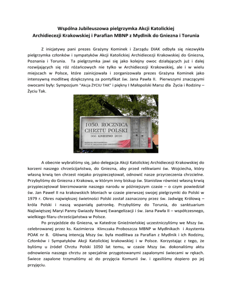 Wspólna Jubileuszowa pielgrzymka Akcji Katolickiej Archidiecezji Krakowskiej i Parafian MBNP z Mydlnik do Gniezna i Torunia Z inicjatywy pani prezes Grażyny Kominek i Zarządu DIAK odbyła się niezwykła pielgrzymka członków i sympatyków Akcji Katolickiej Archidiecezji Krakowskiej do Gniezna, Poznania i Torunia. Ta pielgrzymka jawi się jako kolejny owoc działających już i dalej rozwijających się róż różańcowych nie tylko w Archidiecezji Krakowskiej, ale i w wielu miejscach w Polsce, które zainicjowała i zorganizowała prezes Grażyna Kominek jako intensywną modlitwę dziękczynną za pontyfikat św. Jana Pawła II. Pierwszymi znaczącymi owocami były: Sympozjum "Akcja ŻYCIU TAK” i piękny I Małopolski Marsz dla Życia i Rodziny – Życiu Tak. A obecnie wybraliśmy się, jako delegacja Akcji Katolickiej Archidiecezji Krakowskiej do korzeni naszego chrześcijaństwa, do Gniezna, aby przed relikwiami św. Wojciecha, który własną krwią ten chrzest niejako przypieczętował, odnowić nasze przyrzeczenia chrzcielne. Przybyliśmy do Gniezna z Krakowa, w którym inny biskup św. Stanisław również własną krwią przypieczętował bierzmowanie naszego narodu w późniejszym czasie – o czym powiedział św. Jan Paweł II na krakowskich błoniach w czasie pierwszej swojej pielgrzymki do Polski w 1979 r. Okres największej świetności Polski został zaznaczony przez św. Jadwigę Królową – króla Polski i naszą wspaniałą patronkę. Przybyliśmy do Torunia, do sanktuarium Najświętszej Maryi Panny Gwiazdy Nowej Ewangelizacji i św. Jana Pawła II – współczesnego, wielkiego filaru chrześcijaństwa w Polsce. Po przyjeździe do Gniezna, w Katedrze Gnieźnieńskiej uczestniczyliśmy we Mszy św. celebrowanej przez ks. Kazimierza Klimczaka Proboszcza MBNP w Mydlnikach i Asystenta POAK nr 8. Główną intencją Mszy św. była modlitwa za Parafian z Mydlnik i ich Rodziny, Członków i Sympatyków Akcji Katolickiej krakowskiej i w Polsce. Korzystając z tego, że byliśmy u źródeł Chrztu Polski 1050 lat temu, w czasie Mszy św. dokonaliśmy aktu odnowienia naszego chrztu ze specjalnie przygotowanymi zapalonymi świecami w rękach. Świece zapalone trzymaliśmy aż do przyjęcia Komunii św. i zgasiliśmy dopiero po jej przyjęciu. Ks. Kazimierz – Asystent POAK nr 8 w swojej homilii uczulał nas, że wiara nie jest nam dana na zawsze. Cytując legata papieskiego Pietro Parolina, który przemawiał podczas uroczystości jubileuszowych z okazji 1050-lecia chrztu Polski w Poznaniu potwierdził tę tezę. Powiedział wtedy m.in. „zachęcam was, abyście nigdy nie traktowali niczego, jako osiągnięcie raz na zawsze, tak jakby, na przykład, poświęcenie, wiara i odwaga minionych pokoleń wystarczyły, żeby iść dalej pewnie i uchronić się od wszelkich niebezpieczeństw.” Kardynał podkreślał też, że chrzest oznacza radykalny przełom mentalności i kultury. Jest to droga rozjaśniona światłem Chrystusa. Mówca przywołał też wypowiedziane w Gnieźnie słowa św. Jana Pawła II oraz słowa Ruchu Lednickiego. To dotknięcie korzeni chrześcijaństwa polskiego zespolonego z państwem polskim wywarło na uczestnikach niezapomniane, budujące wrażenie. Następnie, z przewodnikami zwiedziliśmy Gnieźnieńską Katedrę. Wśród licznych zabytków podziwialiśmy słynne Drzwi Gnieźnieńskie zawierające kolejno ważne etapy z życia św. Wojciecha, pomnik Sł. B. kard. Stefana Wyszyńskiego okolonego odlanymi rzeźbami przedstawiające kolejne, ważne etapy z życia Prymasa Tysiąclecia na wzór rzeźb na Drzwiach Gnieźnieńskich i przede wszystkim sarkofag św. Wojciecha umieszczony przed głównym ołtarzem. Po zjedzeniu obiadu przy pięknie zastawionych stołach w sąsiadującej restauracji, przejechaliśmy do Poznania i nawiedziliśmy Katedrę na Ostrowie Tumskim. Na nocleg dojechaliśmy nad piękne jezioro Białe, gdzie w hotelu o tej samej nazwie nocowaliśmy. Po śniadaniu udaliśmy się w drogę do Torunia. Tam o godz. 12: 00 uczestniczyliśmy w głównej Mszy św. pierwszego odpustu nowo wybudowanej świątyni – Sanktuarium Najświętszej Maryi Panny Gwiazdy Nowej Ewangelizacji i św. Jana Pawła II. Sanktuarium zostało zbudowane jako wotum za pontyfikat Jana Pawła II i było uroczyście konsekrowane w maju br. przez legata papieskiego kard. Zenona Grocholewskiego i współkonsekrowane przez kard. Stanisława Dziwisza oraz bpa Andrzeja Suskiego. Świątynia została zbudowana w rekordowo krótkim czasie niespełna czterech lat i stanowi perłę architektoniczną, której w pełni nie byliśmy w stanie podziwiać ze względu na szczupłość czasu. Mszy św. koncelebrowanej przez licznych kapłanów przewodniczył bp Wiesław Szlachetka z Gdańska, a homilię wygłosił założyciel, inicjator wszystkich dzieł związanych z Radiem Maryja ojciec Tadeusz Rydzyk. W czasie Mszy Św. dokonano inicjacji Bractwa św. Jana Pawła i imatrykulacji studentów Wyższej Szkoły Kultury Społecznej i Medialnej. W koncelebrze brał również udział Nasz ks. Kazimierz Klimczak z intencją za Parafian i Akcję Katolicką. We Mszy św. wzięli udział przedstawiciele władz państwowych i lokalnych oraz liczne grono wykładowców, studentów i ponad 50 członków powstałego Bractwa św. JP II. Następnie udaliśmy się na krótkie zwiedzanie Starego Miasta Torunia za przewodnictwem kuzynki naszych parafian – Państwa Kowalskich. Oprócz Katedry do chluby Torunia – XIII wiecznej, gotyckiej świątyni pw. Wniebowzięcia NMP wprowadzili nas tak jak 52 lata temu, aby ślubować sobie TAK: Liliana i Stefan Kowalscy. Przy okazji wielu uczestników zaopatrzyło się w różnorodne toruńskie pierniki. Toruńskie pierniki różnorodnością smaków pokrzepiły większość pielgrzymów. Niektórzy zaopatrzyli się w większe ich ilości, żeby podzielić się ze swoimi bliskimi – choć pierniki wcale nie były tanie… W drodze powrotnej mieliśmy wst