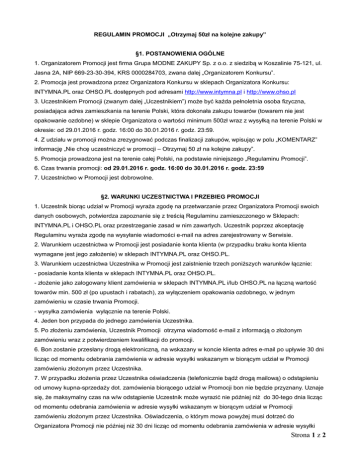 REGULAMIN PROMOCJI „Otrzymaj 50zł na kolejne zakupy” §1. POSTANOWIENIA OGÓLNE 1. Organizatorem Promocji jest firma Grupa MODNE ZAKUPY Sp. z o.o. z siedzibą w Koszalinie 75-121, ul. Jasna 2A, NIP 669-23-30-394, KRS 0000284703, zwana dalej „Organizatorem Konkursu”. 2. Promocja jest prowadzona przez Organizatora Konkursu w sklepach Organizatora Konkursu: INTYMNA.PL oraz OHSO.PL dostępnych pod adresami http://www.intymna.pl i http://www.ohso.pl 3. Uczestnikiem Promocji (zwanym dalej „Uczestnikiem”) może być każda pełnoletnia osoba fizyczna, posiadająca adres zamieszkania na terenie Polski, która dokonała zakupu towarów (towarem nie jest opakowanie ozdobne) w sklepie Organizatora o wartości minimum 500zł wraz z wysyłką na terenie Polski w okresie: od 29.01.2016 r. godz. 16:00 do 30.01.2016 r. godz. 23:59. 4. Z udziału w promocji można zrezygnować podczas finalizacji zakupów, wpisując w polu „KOMENTARZ” informację „Nie chcę uczestniczyć w promocji – Otrzymaj 50 zł na kolejne zakupy”. 5. Promocja prowadzona jest na terenie całej Polski, na podstawie niniejszego „Regulaminu Promocji”. 6. Czas trwania promocji: od 29.01.2016 r. godz. 16:00 do 30.01.2016 r. godz. 23:59 7. Uczestnictwo w Promocji jest dobrowolne. §2. WARUNKI UCZESTNICTWA I PRZEBIEG PROMOCJI 1. Uczestnik biorąc udział w Promocji wyraża zgodę na przetwarzanie przez Organizatora Promocji swoich danych osobowych, potwierdza zapoznanie się z treścią Regulaminu zamieszczonego w Sklepach: INTYMNA.PL i OHSO.PL oraz przestrzeganie zasad w nim zawartych. Uczestnik poprzez akceptację Regulaminu wyraża zgodę na wysyłanie wiadomości e-mail na adres zarejestrowany w Serwisie. 2. Warunkiem uczestnictwa w Promocji jest posiadanie konta klienta (w przypadku braku konta klienta wymagane jest jego założenie) w sklepach INTYMNA.PL oraz OHSO.PL. 3. Warunkiem uczestnictwa Uczestnika w Promocji jest zaistnienie trzech poniższych warunków łącznie: - posiadanie konta klienta w sklepach INTYMNA.PL oraz OHSO.PL. - złożenie jako zalogowany klient zamówienia w sklepach INTYMNA.PL i/lub OHSO.PL na łączną wartość towarów min. 500 zł (po upustach i rabatach), za wyłączeniem opakowania ozdobnego, w jednym zamówieniu w czasie trwania Promocji. - wysyłka zamówienia wyłącznie na terenie Polski. 4. Jeden bon przypada do jednego zamówienia Uczestnika. 5. Po złożeniu zamówienia, Uczestnik Promocji otrzyma wiadomość e-mail z informacją o złożonym zamówieniu wraz z potwierdzeniem kwalifikacji do promocji. 6. Bon zostanie przesłany drogą elektroniczną, na wskazany w koncie klienta adres e-mail po upływie 30 dni licząc od momentu odebrania zamówienia w adresie wysyłki wskazanym w biorącym udział w Promocji zamówieniu złożonym przez Uczestnika. 7. W przypadku złożenia przez Uczestnika oświadczenia (telefonicznie bądź drogą mailową) o odstąpieniu od umowy kupna-sprzedaży dot. zamówienia biorącego udział w Promocji bon nie będzie przyznany. Uznaje się, że maksymalny czas na w/w odstąpienie Uczestnik może wyrazić nie później niż do 30-tego dnia licząc od momentu odebrania zamówienia w adresie wysyłki wskazanym w biorącym udział w Promocji zamówieniu złożonym przez Uczestnika. Oświadczenia, o którym mowa powyżej musi dotrzeć do Organizatora Promocji nie później niż 30 dni licząc od momentu odebrania zamówienia w adresie wysyłki Strona 1 z 2 wskazanym w biorącym udział w Promocji zamówieniu złożonym przez Uczestnika. 8. W przypadku zwrotu przez Uczestnika całości bądź części zamówienia skutkującego pomniejszeniem wartości zamówienia poniżej 500zł bon nie będzie przyznany. 9. W przypadku zwrotu jakichkolwiek towarów przez Uczestnika, warunkiem otrzymania bonu jest dokupienie bądź wymiana na inne towary, których równowartość w PLN będzie odpowiadać zwracanym towarom (po dokonaniu zmian w zamówieniu, łączna wartość towarów musi być nadal równa bądź większa niż 500 zł). 10. Do Promocji wliczane są aktualne ceny towarów w sklepach: INTYMNA.PL oraz OHSO.PL, po ewentualnych wszelkich rabatach pomniejszających ich wartość. 11. Promocja nie łączy się z innymi promocjami bądź konkursami organizowanymi przez Organizatora Promocji. 12. Uczestnik biorąc udział w Promocji potwierdza zapoznanie się i zaakceptowanie postanowień niniejszego Regulaminu Promocji oraz Regulaminu Bonów (Kart Podarunkowych). §3 BONY 1. W ramach Promocji każdy Uczestnik Promocji spełniający warunki określone w §2 otrzyma: - jedną e-kartę podarunkową o wartości 50 zł do realizacji w multisklepie INTYMNA.PL /OHSO.PL. 2. Organizator Promocji zastrzega sobie prawo do zmiany bonifikaty w czasie trwania Promocji na inną, bez podawania przyczyn dokonanych zmian, jednakże z zastrzeżeniem, że zmiana taka nie wpłynie na pogorszenie warunków uczestnictwa w Promocji. 3. Nie ma możliwości spieniężenia bonu (e-karty podarunkowej). 4. Jedna e-karta podarunkowa przypada na jedno zamówienie spełniające warunki określone w §2. 5. Zasady korzystania z Bonów (e-kart podarunkowych) określa REGULAMIN BONÓW (KART PODARUNKOWYCH), którego pełna treść dostępna jest pod adresem: http://www.intymna.pl/pomoc/regulamin_bonow_intymnapl.pdf §4. POSTĘPOWANIE REKLAMACYJNE 1. Wszelkie reklamacje z tytułu organizowanej Promocji, które mogą być wnoszone przez jego Uczestników, powinny być składane Organizatorowi Promocji na piśmie, pod adresem wskazanym w §1 ust. 1 niezwłocznie po stwierdzeniu niezgodności. 2. Organizator Promocji, w terminie 30 (trzydzieści) dni od otrzymania reklamacji, rozpatrzy zgłoszoną reklamację i pisemnie poinformuje zgłaszającego o zajętym stanowisku. §5. POSTANOWIENIA KOŃCOWE 1. Organizator Promocji zastrzega sobie prawo do wcześniejszego zakończenia Promocji, bądź przedłużenia czasu jego trwania bez podawania przyczyny. 2. Organizator Promocji i nie ponosi odpowiedz
