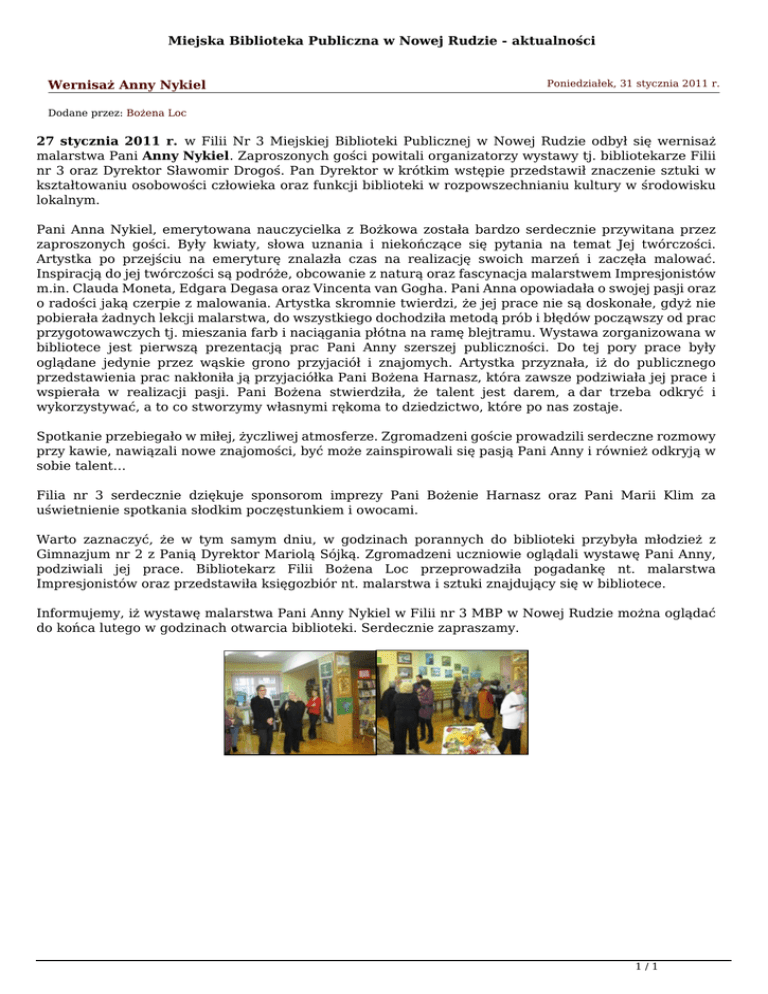 Miejska Biblioteka Publiczna w Nowej Rudzie - aktualności Wernisaż Anny Nykiel Poniedziałek, 31 stycznia 2011 r. Dodane przez: Bożena Loc stycznia 2011 r. w Filii Nr 3 Miejskiej Biblioteki Publicznej w Nowej Rudzie odbył się wernisaż 27 malarstwa Pani Anny Nykiel. Zaproszonych gości powitali organizatorzy wystawy tj. bibliotekarze Filii nr 3 oraz Dyrektor Sławomir Drogoś. Pan Dyrektor w krótkim wstępie przedstawił znaczenie sztuki w kształtowaniu osobowości człowieka oraz funkcji biblioteki w rozpowszechnianiu kultury w środowisku lokalnym. Pani Anna Nykiel, emerytowana nauczycielka z Bożkowa została bardzo serdecznie przywitana przez zaproszonych gości. Były kwiaty, słowa uznania i niekończące się pytania na temat Jej twórczości. Artystka po przejściu na emeryturę znalazła czas na realizację swoich marzeń i zaczęła malować. Inspiracją do jej twórczości są podróże, obcowanie z naturą oraz fascynacja malarstwem Impresjonistów m.in. Clauda Moneta, Edgara Degasa oraz Vincenta van Gogha. Pani Anna opowiadała o swojej pasji oraz o radości jaką czerpie z malowania. Artystka skromnie twierdzi, że jej prace nie są doskonałe, gdyż nie pobierała żadnych lekcji malarstwa, do wszystkiego dochodziła metodą prób i błędów począwszy od prac przygotowawczych tj. mieszania farb i naciągania płótna na ramę blejtramu. Wystawa zorganizowana w bibliotece jest pierwszą prezentacją prac Pani Anny szerszej publiczności. Do tej pory prace były oglądane jedynie przez wąskie grono przyjaciół i znajomych. Artystka przyznała, iż do publicznego przedstawienia prac nakłoniła ją przyjaciółka Pani Bożena Harnasz, która zawsze podziwiała jej prace i wspierała w realizacji pasji. Pani Bożena stwierdziła, że talent jest darem, a dar trzeba odkryć i wykorzystywać, a to co stworzymy własnymi rękoma to dziedzictwo, które po nas zostaje. Spotkanie przebiegało w miłej, życzliwej atmosferze. Zgromadzeni goście prowadzili serdeczne rozmowy przy kawie, nawiązali nowe znajomości, być może zainspirowali się pasją Pani Anny i również odkryją w sobie talent… Filia nr 3 serdecznie dziękuje sponsorom imprezy Pani Bożenie Harnasz oraz Pani Marii Klim za uświetnienie spotkania słodkim poczęstunkiem i owocami. Warto zaznaczyć, że w tym samym dniu, w godzinach porannych do biblioteki przybyła młodzież z Gimnazjum nr 2 z Panią Dyrektor Mariolą Sójką. Zgromadzeni uczniowie oglądali wystawę Pani Anny, podziwiali jej prace. Bibliotekarz Filii Bożena Loc przeprowadziła pogadankę nt. malarstwa Impresjonistów oraz przedstawiła księgozbiór nt. malarstwa i sztuki znajdujący się w bibliotece. Informujemy, iż wystawę malarstwa Pani Anny Nykiel w Filii nr 3 MBP w Nowej Rudzie można oglądać do końca lutego w godzinach otwarcia biblioteki. Serdecznie zapraszamy. 1/1