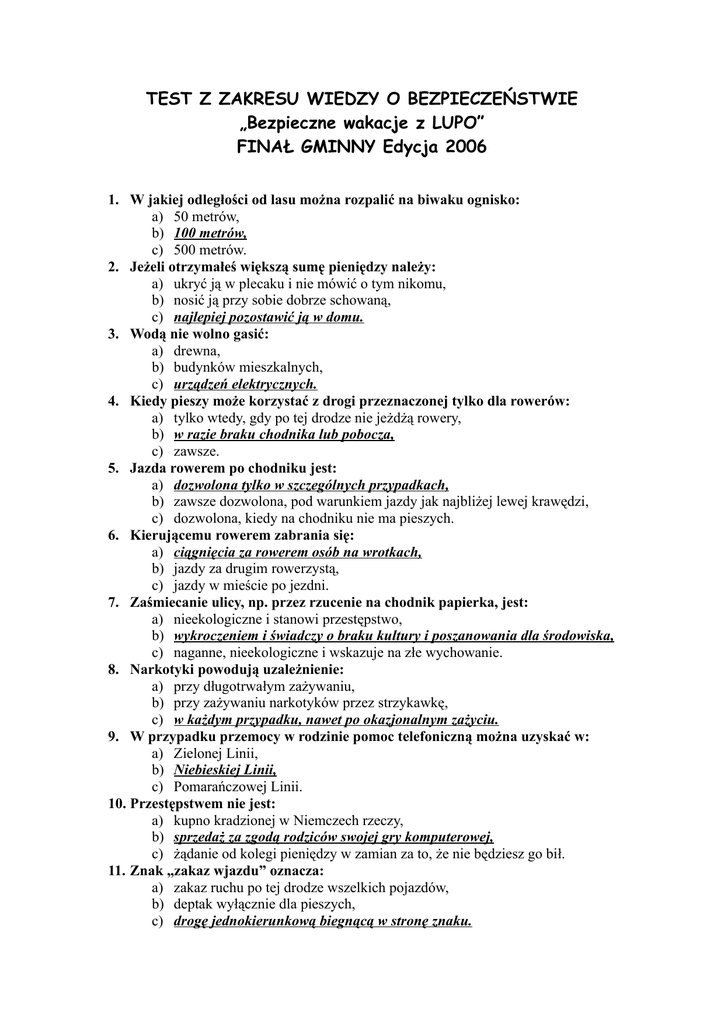 TEST Z ZAKRESU WIEDZY O BEZPIECZEŃSTWIE „Bezpieczne wakacje z LUPO” FINAŁ GMINNY Edycja 2006 1. W jakiej odległości od lasu można rozpalić na biwaku ognisko: a) 50 metrów, b) 100 metrów, c) 500 metrów. 2. Jeżeli otrzymałeś większą sumę pieniędzy należy: a) ukryć ją w plecaku i nie mówić o tym nikomu, b) nosić ją przy sobie dobrze schowaną, c) najlepiej pozostawić ją w domu. 3. Wodą nie wolno gasić: a) drewna, b) budynków mieszkalnych, c) urządzeń elektrycznych. 4. Kiedy pieszy może korzystać z drogi przeznaczonej tylko dla rowerów: a) tylko wtedy, gdy po tej drodze nie jeżdżą rowery, b) w razie braku chodnika lub pobocza, c) zawsze. 5. Jazda rowerem po chodniku jest: a) dozwolona tylko w szczególnych przypadkach, b) zawsze dozwolona, pod warunkiem jazdy jak najbliżej lewej krawędzi, c) dozwolona, kiedy na chodniku nie ma pieszych. 6. Kierującemu rowerem zabrania się: a) ciągnięcia za rowerem osób na wrotkach, b) jazdy za drugim rowerzystą, c) jazdy w mieście po jezdni. 7. Zaśmiecanie ulicy, np. przez rzucenie na chodnik papierka, jest: a) nieekologiczne i stanowi przestępstwo, b) wykroczeniem i świadczy o braku kultury i poszanowania dla środowiska, c) naganne, nieekologiczne i wskazuje na złe wychowanie. 8. Narkotyki powodują uzależnienie: a) przy długotrwałym zażywaniu, b) przy zażywaniu narkotyków przez strzykawkę, c) w każdym przypadku, nawet po okazjonalnym zażyciu. 9. W przypadku przemocy w rodzinie pomoc telefoniczną można uzyskać w: a) Zielonej Linii, b) Niebieskiej Linii, c) Pomarańczowej Linii. 10. Przestępstwem nie jest: a) kupno kradzionej w Niemczech rzeczy, b) sprzedaż za zgodą rodziców swojej gry komputerowej, c) żądanie od kolegi pieniędzy w zamian za to, że nie będziesz go bił. 11. Znak „zakaz wjazdu” oznacza: a) zakaz ruchu po tej drodze wszelkich pojazdów, b) deptak wyłącznie dla pieszych, c) drogę jednokierunkową biegnącą w stronę znaku. 12. Przechodzenie przez jezdnię w miejscu, gdzie chodnik jest oddzielony od jezdni barierką jest: a) dozwolone, ale tylko w przypadku, gdy do najbliższego przejścia jest ponad 100 metrów, b) dozwolone bez żadnych ograniczeń, c) zabronione. 13. Stopień aspiranta oznaczony jest na czapce policyjnej poprzez: a) dwa znaczki V na otoku i pusty daszek, b) dwie gwiazdki na otoku i pusty daszek, c) dwie gwiazdki na otoku i daszek z jednym paskiem. 14. Kogo nie wolno legitymować policjantowi: a) nie ma ograniczeń w tym względzie, policjant może legitymować każdego, b) posłów i senatorów, c) osób do 18-tego roku życia. 15. Podczas wakacji na biwak możesz pojechać: a) nawet bez zgody rodziców, ale tylko razem z większą liczbą kolegów, b) tylko pod opieką osoby dorosłej, zaakceptowanej przez rodziców, c) wyłącznie za zgodą rodziców. 16. W którym miejscu przechodzenie przez jezdnię nie jest zabronione: a) w miejscu o ograniczonej widoczności, b) na skrzyżowaniu, na którym nie jest wyznaczone przejście dla pieszych, c) w miejscu, gdzie barierki oddzielają chodnik od jezdni, ale tylko wtedy, gdy znajdują się po tej stronie ulicy, na którą chcemy przejść. 17. Co należy uczynić, jeżeli stwierdzisz zapach gazu w mieszkaniu: a) otworzyć okna i powiadomić rodziców, b) wyjść z domu i wezwać pogotowie gazowe, c) zamknąć zawór odcinający dopływ gazu, otworzyć okna, wezwać pogotowie gazowe i wyjść z domu. 18. Jadąc samochodem trzeba mieć zapięte pasy bezpieczeństwa: a) na wszystkich siedzeniach zawsze, b) tylko z przodu, c) zawsze z przodu, a z tyłu samochodu podczas wyjazdu poza miasto. 19. Ktoś w szkole proponuje udział w sesji zdjęciowej mody młodzieżowej do magazynu „Bravo”. Co robisz: a) zgadzasz się, bo otwiera to możliwość zrobienia kariery, b) zgadzasz się wyłącznie ze względów finansowych, pieniądze wydasz na swoje potrzeby lub pomożesz rodzicom, c) nie zgadzasz się, a o propozycji informujesz nauczyciela i rodziców. 20. Nieznajomy częstuje cukierkami. Co robisz: a) częstuję się tylko jednym cukierkiem, gdyż rodzice każą ograniczać ilość słodyczy, b) odmawiam, gdyż nie przyjmuję żadnych poczęstunków od nieznajomych, c) biorę klika, skoro są darmowe.