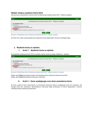 Wybór miejsca wydania Karty DiLO Jako pierwsze wyświetlone zostanie okno (1) Rejestracja wydania karty DiLO – Miejsce wydania. Rysunek 1 Przykładowe okno (1) Rejestracji wydania karty DiLO – Miejsce wydania W kroku tym należy wskazać gdzie jest wydawana karta diagnostyki i leczenia onkologicznego. 1. Wydanie karty w szpitalu I. Krok 1 - Wydanie karty w szpitalu W przypadku wydawania karty DiLO w szpitalu należy zaznaczyć opcję: Wydana w : Szpitalu Rysunek 2 Przykładowe okno (1) Rejestracji wydania karty DiLO – Miejsce wydania w szpitalu Wybór opcji Dalej spowoduje przejście do kolejnego kroku rejestracji wydania karty DiLO. Wybór opcji Anuluj spowoduje anulowanie rejestracji. II. Krok 2 – Dane wydającego oraz dane posiadacza karty W kroku wydanie karty rejestrowane są informacje dotyczące lekarza wydającego kartę oraz pacjenta, dla którego karta jest wydawana. Wprowadzone informacje będą drukowane na Karcie diagnostyki i leczenia onkologicznego wydawanej pacjentowi. Rysunek 3 Przykładowe okno (1) Rejestracji wydania karty DiLO – Wydanie karty w POZ Wszystkie pola oznaczone * (gwiazdką) są polami wymaganymi. AB.1 Lekarz wydający kartę W przypadku, gdy wydanie rejestrowane jest przez lekarza, część Lekarz wydający kartę zostanie uzupełniona na podstawie danych konta dostępowego. W przypadku, gdy wydanie rejestrowane jest przez operatora świadczeniodawcy, część Lekarz wydający kartę należy uzupełnić ręcznie wpisując imię, nazwisko oraz numer prawa wykonywania zawodu lekarza. Lekarz wskazany w rejestracji wydania karty musi być zarejestrowany w bazie OW NFZ oraz wykazany w potencjale świadczeniodawcy do umowy z NFZ, w ramach której nastąpi sprawozdanie wydania karty DiLO. AC. Informacje o posiadaczu karty W części Informacje o posiadaczu katy należy wprowadzić dane pacjenta, dla którego wydawana jest karta. Pola dostępne do uzupełnienia mogą się dynamicznie zmieniać w zależności od wybranych opcji. Dane osobowe pacjenta [AC.1.] Uzupełnienie informacji dla osoby dorosłej, zdolnej do świadomego wyrażania zgody Rejestracja danych pacjenta w części AC.1. wymaga wprowadzenia: o o Nazwiska i imienia pacjenta Typu identyfikatora, którym posługuje się pacjent: 1. PESEL 2. PIN (Personal Identyfication Number) uzupełniany w przypadku uprawnionych do świadczeń na podstawie przepisów o koordynacji 3. Dowód osobisty – seria i numer 4. Paszport – seria i numer 5. Inny dokument – seria i numer pacjentów Jeśli pacjent jest Polakiem i ma nadany numer PESEL należy wybrać PESEL jako typ identyfikatora o Wskazanie typu identyfikatora 2-5 spowoduje uaktywnienie dodatkowych pól do uzupełnienia (data urodzenia, płeć pacjenta) Wartość identyfikatora – w polu tym należy wpisać identyfikator pacjenta, np.: PESEL Wartość identyfikatora pacjenta w wydanej karcie powinna być zgodna z identyfikatorem pacjenta wykazywanym w komunikacie statystycznym z realizacji umowy z NFZ. o Rejestracja danych adresowych - adres miejsca zamieszkania pacjenta W przypadku, gdy pacjent mieszka poza granicami Polski należy zaznaczyć opcję Pacjent nie posiada adresu zamieszkania na terytorium Polski. Zaznaczenie opcji wymaga podania kodu państwa, w którym mieszka pacjent. W danych adresowych należy uzupełnić pola wymagane: kod pocztowy, miejscowości, ulica (jeśli występuje w adresie), numer domu, numer lokalu (jeśli występuje w adresie). Uzupełnienie pola miejscowość (na terytorium Polski) wymaga wprowadzenia przynajmniej trzech pierwszych znaków nazwy miejscowości i wybrania nazwy z wyświetlanego słownika. Im więcej znaków, tym dokładniej podpowiadany jest słownik. Jeśli nazwa nie zostanie wybrana ze słownika i system nie wykryje jednoznacznej zgodności wprowadzonej nazwy z nazwą pozycji słownikowej, pole zostanie oznaczone jako błędnie uzupełnione. Uzupełnienie informacji dla osoby małoletniej, całkowicie ubezwłasnowolnionej lub niezdolnej do świadomego wyrażania zgody W przypadku osób małoletnich uzupełnienie formularza danych osobowych wymaga zaznaczenia opcji Pacjent jest osobą małoletnią, całkowicie ubezwłasnowolnioną lub niezdolną do świadomego wyrażenia zgody. W efekcie zaznaczenia opcji wymaganą do uzupełnienia będzie część Dane przedstawiciela ustawowego albo opiekuna faktycznego (AC.2.). Dane personalne i adresowe uzupełnia się analogicznie do uzupełniania danych dla osoby dorosłej. Uzupełnienie informacji dla noworodka W przypadku noworodków uzupełniając część AC.1. konieczne jest zaznaczenie opcji: o Pacjent jest osobą małoletnią, całkowicie ubezwłasnowolnioną lub niezdolną do świadomego wyrażenia zgody o Wystawiono noworodkowi W efekcie zaznaczenia opcji dodatkowo wymagane do uzupełnienia będą pola: A13. Numer kolejny noworodka, A14. Data urodzenia (pacjenta), A15. Płeć (pacjenta) oraz część Dane przedstawiciela ustawowego albo opiekuna faktycznego (AC.2.). Dane osobowe pacjenta wymagają wprowadzenia: o Imienia i nazwiska pacjenta o Typu identyfikatora oraz wartości identyfikatora opiekuna o Danych adresowych pacjenta Rysunek 4 Przykładowe okno Danych osobowych pacjenta - noworodek AC.2. Dane przedstawiciela ustawowego albo opiekuna faktycznego Część Dane przedstawiciela ustawowego są wymagane w przypadku osób małoletnich, całkowicie ubezwłasnowolnionych lub niezdolnych do samodzielnego udzielenia zgody. Wymagane jest uzupełnienie pól: Imię , Nazwisko oraz sekcji zawierającej dane adresowe przedstawiciela. Rysunek 5 Przykładowe okno Danych przedstawiciela ustawowego Dodatkowe informacje: W przypadku, gdy dane adresowe przedstawiciela są takie same jak dane pacjenta należy zaznaczyć opcję Adres pacjenta oraz przedstawiciela ustawowego lub opiekuna faktycznego są takie same. Jeśli przedstawiciel ustawowy ma adres zamieszkania poza terytorium polski należy zaznaczyć opcję Przedstawiciel ustawowy albo opiekun faktyczny 
