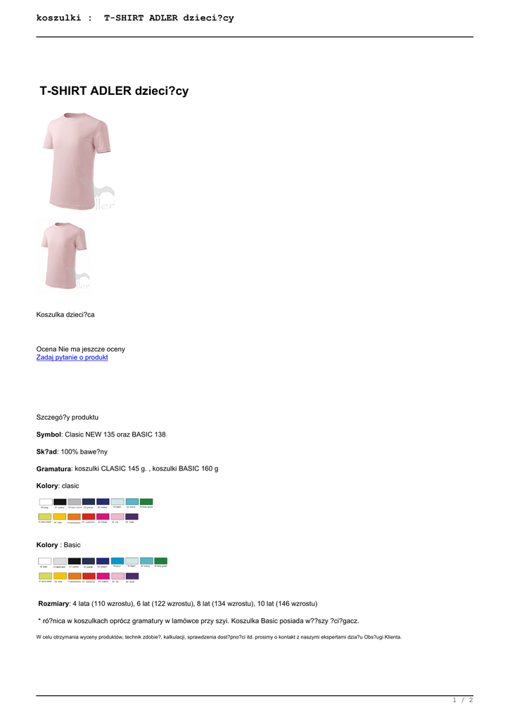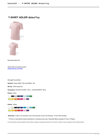 koszulki : T-SHIRT ADLER dzieci?cy T-SHIRT ADLER dzieci?cy Koszulka dzieci?ca Ocena Nie ma jeszcze oceny Zadaj pytanie o produkt Szczegó?y produktu Symbol: Clasic NEW 135 oraz BASIC 138 Sk?ad: 100% bawe?ny Gramatura: koszulki CLASIC 145 g. , koszulki BASIC 160 g Kolory: clasic Kolory : Basic Rozmiary: 4 lata (110 wzrostu), 6 lat (122 wzrostu), 8 lat (134 wzrostu), 10 lat (146 wzrostu) * ró?nica w koszulkach oprócz gramatury w lamówce przy szyi. Koszulka Basic posiada w??szy ?ci?gacz. W celu otrzymania wyceny produktów, technik zdobie?, kalkulacji, sprawdzenia dost?pno?ci itd. prosimy o kontakt z naszymi ekspertami dzia?u Obs?ugi Klienta. 1 / 2 koszulki : T-SHIRT ADLER dzieci?cy 2 / 2 Powered by TCPDF (www.tcpdf.org)