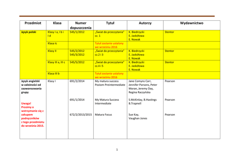 Przedmiot Język polski Klasa Klasy I a, I b i Id Numer dopuszczenia 545/1/2012 Klasa Ic Klasy II 545/2/2012 545/3/2012 Klasy III a, III c 545/5/2012 Klasa III b Język angielski w zależności od zaawansowania grupy Uwaga! Prosimy o wstrzymanie się z zakupem podręczników z tego przedmiotu do września 2015. Klasy I 691/2/2014 Tytuł Autorzy „Świat do przeczytania” cz. 1 Tytuł zostanie ustalony we wrześniu 2016 „Świat do przeczytania” cz.2 i 3 „Świat do przeczytania” cz.4 i 5 Tytuł zostanie ustalony we wrześniu 2016 My matura success Poziom Preintermediate Wydawnictwo K. Biedrzycki E. Jaskółowa E. Nowak Stentor K. Biedrzycki E. Jaskółowa E. Nowak K. Biedrzycki E. Jaskółowa E. Nowak Stentor Jane Comyns Carr, Jennifer Parsons, Peter Moran, Jeremy Day, Regina Raczyńska Pearson Stentor 691/1/2014 My Matura Success Intermediate S.McKinlay, B.Hastings B.Trapnell Pearson 672/2/2013/2015 Matura Focus Sue Kay, Vaughan Jones Pearson 1 Język angielski w zależności od zaawansowania grupy Uwaga! Prosimy o wstrzymanie się z zakupem podręczników z tego przedmiotu do września 2015. Klasy II Język angielski w zależności od zaawansowania grupy Uwaga! Prosimy o wstrzymanie się z zakupem podręczników z tego przedmiotu do września 2015. Klasy III 691/1/2014 My Matura Success Intermediate S.McKinlay, B.Hastings B.Trapnell Pearson Longman 691/3/2015 My Matura Success Upper Intermediate J.Comyns-Carr, J.Parsons, P.Moran, J.Day Pearson Sue Kay, Vaughan Jones 672/2/2013/2015 Matura Focus Pearson 691/3/2015 My Matura Success: Upper – Intermediate Jane Comyns Carr, Jennifer Parsons, Peter Moran, Jeremy Day, Regina Raczyńska Pearson 691/1/2014 New Matura Success Intermediate S.McKinlay, B.Hastings, R.Raczyńska Pearson 710/2014 Matura 2015. Repetytorium M.Rosińska, L. Edwards MacMillan 696/2014 Longman Repetytorium maturalne Poziom podstawowy M.Umińska, B.Hastings, D.Chandler, R.Ficker, Pearson 723/2014 Longman Repetytorium maturalne Poziom rozszerzony M.Umińska, B.Hastings, D.Chandler, R.Ficker, Pearson 2 Język niemiecki w zależności od zaawansowania grupy Uwaga! Prosimy o wstrzymanie się z zakupem podręczników z tego przedmiotu do września 2015. Język francuski w zależności od zaawansowania grupy Uwaga! Prosimy o wstrzymanie się z zakupem podręczników z tego przedmiotu do września 2015. Matematyka Klasy I a i I b 451/1/2012/2014 Infos 1 Klasy II a i II b 451/3/2012/2015 Infos 2 A Klasy III a i III b 451/3/2012 Infos 2 A 451/4/2012 Infos 2 B C. Serzysko, B. Sekulski, N. Drabich, T. Gajownik C. Serzysko, B. Sekulski, N. Drabich, T. Gajownik C. Serzysko, B. Sekulski, N. Drabich, T. Gajownik Pearson Pearson Pearson C. Serzysko, B. Sekulski, N. Drabich, T. Gajownik Pearson Klasy I 745/1/2015 En Action Celine Himber Hachette Polska Sp. z o.o. Klasy II 141/2/2010 Le Nouveau Taxi! 2 Guy Capelle, Robert Menand Guy Capelle, Robert Menand Hachette Polska Sp. z o.o. Klasy III 141/2/2010 Le Nouveau Taxi! 2 Hachette Polska Sp. z o.o. Guy Capelle, Robert Menand Guy Capelle, Robert Menand Klasa I a 360/1/2011 Klasy I b, I c, Id 378/1/2011 Klasa II a 360/2/2013 Matematyka. Zakres podstawowy i rozszerzony. Podręcznik dla szkół ponadgimnazjalnych „MATeMAtyka 1” Zakres podstawowy „MATeMAtyka 2” – zakres rozszerzony 3 W. Babiański L. Chańko D. Ponczek Nowa Era W. Babiański L. Chańko D. Ponczek W. Babiański L. Chańko Nowa Era Nowa Era Klasy II b, II c, II d Klasa III a Klasy III b i III c Geografia Klasy I Klasa II d Biologia Klasy I Klasy II 378/2/2013 360/3/2014 „MATeMAtyka 3” – zakres rozszerzony 378/3/2014 „MATeMAtyka 3” – zakres podstawowy 433/2012 „Oblicza geografii” – zakres podstawowy 501/1/2012/2015 „Oblicza geografii 2” Zakres rozszerzony 450/2012/2015 „Biologia na czasie” 564/1/2012/ 2015 „Biologia na czasie 1” – zakres rozszerzony 564/2/2103 „Biologia na czasie 2” – zakres rozszerzony „Biologia na czasie 3” – zakres rozszerzony To jest chemia – podst. Podręcznik dla szkół ponadgimnazjalnych. „To jest chemia 1" Maturalne karty pracy 1 „To jest chemia 2" Maturalne karty pracy 2 „Odkryć fizykę”- podst. Klasy III 564/3/2014 Klasy I 438/2012 Klasa II c 528/1/2012 Klasa III c 528/2/2012 Fizyka Klasy I 447/2012 Historia Klasy I 525/2012 Chemia „MATeMAtyka 2” „Poznać przeszłość. Wiek XX” – podst. 4 W. Babiański L. Chańko W. Babiański L. Chańko W. Babiański L. Chańko Radosław Uliszak, Krzysztof Wiedermann R. Malarz M. Więckowski E. Bonar E.Jastrzębska M.Guzik E. Jastrzębska Nowa Era H. Marko-Worłowska R.Kozik F.Dubert Nowa Era Romuald Hassa, Aleksandra Mrzigod, Janusz Mrzigod M.Litwin S. Styka-Wlazło M.Litwin S. Styka-Wlazło M. Braun W. Śliwa S. Roszak J. Kłaczkow Nowa Era Nowa Era Nowa Era Nowa Era Nowa Era Nowa Era Nowa Era Nowa Era Nowa Era Nowa Era Nowa Era Nowa Era Wiedza o Społeczeństwie Klasa II b 642/1/2013 642/2/2013 Klasa III b 642/3/2014 642/4/2015 Klasy I 505/2012 Klasa II b 630/1/2012 Klasa II d 630/1/2012 630/2/2014 Informatyka Klasy I 516/2012 Podstawy przedsiębiorczości Klasy I 467/2012 Edukacja dla bezpieczeństwa Klasy I 426/2012 Wiedza o kulturze Klasy I 449/2012 „Zrozumieć przeszłość” – poziom rozszerzony cz.1, 2 „Zrozumieć przeszłość” – poziom rozszerzony cz. 3, 4 „W centrum uwagi” – zakres podstawowy „W centrum uwagi” – zakres rozszerzony cz.1 „W centrum uwagi” – zakres rozszerzony cz.1 „W centrum uwagi” – zakres rozszerzony cz.2 „Informatyka. Po prostu.” Zakres podstawowy. R. Kulesza, K. Kowalewski Nowa Era R. Kulesza, K. Kowalewski Nowa Era A.Janicki Nowa Era A.Janicki Nowa Era A.Janicki Nowa Era Z. Nowakowski WSiP „Krok w przedsiębiorczość” podręcznik dla szkół ponadgimnazjalnych „Żyję i działam bezpiecznie” Z. Makieła, T. Rachwał Nowa Era J.Słoma Nowa Era Spotkania z kulturą. Podręcznik do wiedzy o kulturze dla liceum i technikum M. Bokiniec, B.Forysiewicz, J. Michał