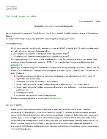 Opis działek i warunki sprzedaży Warszawa, dnia 17.11.2014r. OPIS NIERUCHOMOŚCI I WARUNKI SPRZEDAŻY Zarząd Spółdzielni Mieszkaniowej "Osiedle Zacisze" oferuje do sprzedaży 2 działki budowlane położone w Warszawie na Zaciszu. Na przeprowadzenie sprzedaży Zarząd Spółdzielni otrzymał zgodę Walnego Zgromadzenia. Przedmiot sprzedaży: Przedmiotem sprzedaży są dwie działki budowlane o numerach 46 i 47 w obrębie 4-09-10 położone w Warszawie, przy ulicy Wyspowej, o powierzchni odpowiednio: 1. Działka oznaczona numerem ewidencyjnym nr 46 o powierzchni 772 m2 2. Działka oznaczona numerem ewidencyjnym nr 47 o powierzchni 811 m2 Na każdej z wymienionych powyżej działek przewiduje się budowę dwóch domów bliźniaczych wg identycznego projektu o powierzchni użytkowej segmentu 187,30 m2. Koncepcję lokalizacji domków na działkach zawiera Załącznik nr 2. Sprzedający w proponowanej cenie zawarł dotychczas poniesione koszty inwestycji w kwocie 113 230,34 zł brutto, w zamian za przeniesienie na nabywającego/nabywających praw wynikających z uzyskanych już dokumentów, na które składają się: 1. Projekt budowlany dwóch domów w zabudowie bliźniaczej o powierzchni użytkowej 183 m2 każdy z 4 segmentów wraz z wizualizacją. 2. Pozwolenie na budowę ww. domów na ww. działkach. 3. Umowy o przyłączenie do instalacji gazowej (4 umowy na 4 przyłącza po 1 dla każdego domku). 4. Umowy o przyłączenie do instalacji elektrycznej (1 umowa na prąd budowlany i 1 umowa o przyłączenie na prąd docelowy). 5. Inwentaryzacja drzew. 6. Oznaczenie punktów granicznych działek w terenie. Projekty domów oraz wizualizacje zawarte są w Załącznikach nr 3. Stan prawny działek: Działki znajdują się w użytkowaniu wieczystym od m.st. Warszawy do 28 stycznia 2034 roku. Umowa o ustanowienie użytkowania wieczystego jest do wglądu na żądanie. W związku z tym, że użytkowanie wieczyste ustanowione było przed uchwaleniem planu miejscowego, zaistniała konieczność dostsowania zapisów umowy do zapisów planu, w tym w szczególności w zakresie sposobu zagospodarowania działek. Procedura dostosowania umowy oraz wydłużenia jej trwania do 99 lat jest w końcowej fazie. Przewiduje się finalizację do końca roku 2014. Opłata za zmianę umowy wynosi 175.000 zł. W zależności od Kupującego Spółdzielnia może doprowadzić procedurę do końca, bądź odstąpić pozostawiając stan prawny nieruchomości bez zmian w momencie przeniesienia własności na kupującego. Ostatnia aktualizacja opłaty rocznej za użytkowanie wieczyste miała miejsce 1 stycznia 2003 roku i od tamtej pory opłata wynosi 1,82 zł/m2 gruntu, płatne jednorazowo do 30 marca każdego roku. Działki mają założoną Księgę Wieczystą WA3M/00184196/1 prowadzoną przez Sąd Rejonowy dla Warszawy Mokotowa w Warszawie. Odpis z KW oraz wypis z Rejestru Gruntów stanowią Załącznik nr 4 do Zapytania ofertowego. Działki przylegają bezpośrednio do drogi publicznej. Nabywcy działek będą mieli możliwość podpisania umowy cywilno-prawnej ze Spółdzielnią na korzystanie z wyjazdu przez drogę osiedlową i na korzystanie z infrastruktury osiedla. W przypadku, gdy nabywcy działek nie będą chcieli korzystać z wjazdu przez drogę Spółdzielni, dojazd do nieruchomości jest zapewniony od ulicy Wyspowej. Działki objęte są prawem pierwokupu przez M.st. Warszawy. I. Szczegółowe warunki 1. Preferuje się nabywcę, który wybuduje na zakupionej nieruchomości 2 domy w zabudowie bliźniaczej według zatwierdzonych projektów budowlanych i pozwolenia na budowę bądź 2 domów jednorodzinnych, na które złożą się maksymalnie parter, 1 piętro i poddasze. 2. Każdą z 2 działek może nabyć jedna lub więcej osób fizycznych lub prawnych. W przypadku nabycia działki przez kilka osób zainteresowanych budową wspólnego domu bliźniaczego - składają one jedną wspólną ofertę. 3. Przedstawione przez Spółdzielnię warunki podlegają negocjacji. 4. Spółdzielnia zakłada, iż wszystkie informacje udzielone przez Oferentów są prawdziwe. W przypadku wykrycia rozbieżności udzielonych informacji w stosunku do stanu faktycznego, Spółdzielnia zastrzega sobie prawo do wykluczenia Oferenta. 5. Oferent ma prawo zadawać pytania przed upływem terminu składania ofert. Pytania należy kierować na adres e-mail: [email protected] lub telefonicznie pod nr 668 842 126. II. Składanie ofert 1. Druk formularza oferty należy wydrukować ze strony internetowej Spółdzielni www.osiedlezacisze.pl/sprzedaż działek - Załącznik 1. 2. Oferty należy składać w zamkniętych kopertach do dnia 12 stycznia 2015 roku do godz. 16 osobiście lub pocztą na adres: SEKAN s.c. ul. Radzymińska 129B 03-560 Warszawa Za datę wpływu uznaje się datę doręczenia oferty na ww. adres. Koperta powinna być opatrzona napisem "Oferta na zakup działek od Spółdzielni Mieszkaniowej "Osiedle Zacisze" - "NIE OTWIERAĆ PRZED SESJĄ ROZPATRYWANIA OFERT". Na kopertach musi być umieszczona informacja umożliwiająca identyfikację Oferenta - imię, nazwisko i adres. 3. Złożenie dwóch lub więcej ofert z różnymi cenami przez jednego oferenta stanowi podstawę do wykluczenia takiego oferenta. 4. Każda złożona oferta zostanie zarejestrowana w Rejestrze Korespondencji Spółdzielni z imieniem i nazwiskiem oferenta oraz zostanie oznaczona datą i godziną wpływu. III. Rozstrzygnięcie 1. Kryterium oceny ofert będą: cena wyrażona w PLN za 1 m2 gruntu, sposób finansowania w tym w szczególności płatność całej ceny przy zakupie bez rozkładania na raty, zwrot poniesionych kosztów oraz planowane zagospodarowanie. 2. O ocenie ofert oferenci zostaną poinformowani przez Spółdzielnię telefonicznie, mailowo lub w trakcie bezpośredniego spotkania. 3. W przypadku niezłożenia żadnej ważnej oferty ogłoszenie o sprzedaży może zostać wycofane, przedłużone, bądź zmienione. 4. W przypadku zaistnienia s