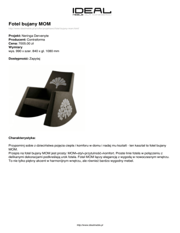 Fotel bujany MOM http://www.idealmeble.pl/pl/offer/projektanci/fotel-bujany-mom.html/ Projekt: Neringa Dervenyte Producent: Contraforma Cena: 7005.00 zł Wymiary wys. 990 x szer. 840 x gł. 1080 mm Dostępność: Zapytaj Charakterystyka: Przypominj sobie z dzieciństwa pojęcia ciepła i komforu w domu i nadaj mu kształt - ten kaształ to fotel bujany MOM. Przepis na fotel bujany MOM jest prosty: MOM=styl+przytulność+komfort. Proste linie fotela w połączeniu z delikanymi dekoracjami podkreślają urok fotela. Fotel MOM łączy elegancję z wygodą w nowoczesnym wnętrzu. To nie tylko piękny akcent w harmonijnym wnętrzu, ale również bardzo wygodny mebel. http://www.idealmeble.pl http://www.idealmeble.pl Zdjęcia produktu: http://www.idealmeble.pl Powered by TCPDF (www.tcpdf.org)