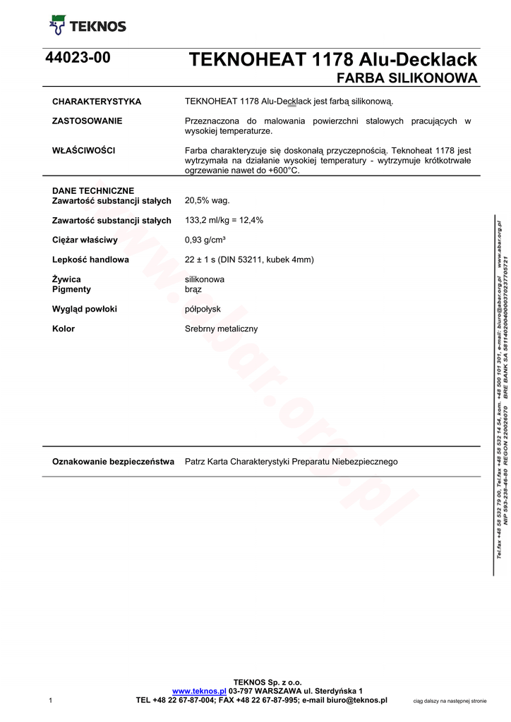 44023-00 TEKNOHEAT 1178 Alu-Decklack FARBA SILIKONOWA CHARAKTERYSTYKA TEKNOHEAT 1178 Alu-Decklack jest farbą silikonową. ZASTOSOWANIE Przeznaczona do malowania powierzchni stalowych pracujących w wysokiej temperaturze. WŁAŚCIWOŚCI Farba charakteryzuje się doskonałą przyczepnością. Teknoheat 1178 jest wytrzymała na działanie wysokiej temperatury - wytrzymuje krótkotrwałe ogrzewanie nawet do +600°C. DANE TECHNICZNE Zawartość substancji stałych 20,5% wag. Zawartość substancji stałych 133,2 ml/kg = 12,4% Ciężar właściwy 0,93 g/cm³ Lepkość handlowa 22 ± 1 s (DIN 53211, kubek 4mm) Żywica Pigmenty silikonowa brąz Wygląd powłoki półpołysk Kolor Srebrny metaliczny Oznakowanie bezpieczeństwa Patrz Karta Charakterystyki Preparatu Niebezpiecznego 1 TEKNOS Sp. z o.o. www.teknos.pl 03-797 WARSZAWA ul. Sterdyńska 1 TEL +48 22 67-87-004; FAX +48 22 67-87-995; e-mail [email protected] ciąg dalszy na następnej stronie TEKNOHEAT 1178 Alu-Decklack 44023-00 strona 2 SPOSÓB STOSOWANIA Możliwe kombinacje Np. TEKNOHEAT 1179 Alu-Grundlack, 44022-00 Stosowanie z innymi materiałami Nie testowano Przygotowanie podłoża Powierzchnię należy oczyścić z tłuszczu i zabrudzeń. Powierzchnia do malowania musi być sucha. Rozcieńczalnik 8461-01 Aplikacja Za pomocą natrysku pneumatycznego Lepkość podczas aplikacji Ok. 22 s (DIN 53211, kubek 4 mm) Zalecana grubość powłoki Ok. 15 µm Wydajność 8,0 m2/kg przy grubości 15 µm Schnięcie Suche na dotyk: w temp. 20oC – 30 min. Warunki podczas nakładania Temperatura otaczającego powietrza, malowanej powierzchni i farby powinna być wyższa niż +5oC. Przechowywanie Przechowywać w chłodnym i suchym pomieszczeniu, w szczelnie zamkniętych pojemnikach. Podczas nakładania farba powinna mieć temp. pokojową. Farba ma ograniczony okres przechowywania!! W fabrycznie zamkniętym pojemniku max 12 mies. Mycie sprzętu Za pomocą rozcieńczalnika np. 8461-01 Podane informacje podano w oparciu o temp. 20oC i wilgotność względną 6570%. 2 TEKNOS Sp. z o.o. www.teknos.pl 03-797 WARSZAWA ul. Sterdyńska 1 TEL +48 22 67-87-004; FAX +48 22 67-87-995; e-mail [email protected] ciąg dalszy na następnej stronie 3 TEKNOS Sp. z o.o. www.teknos.pl 03-797 WARSZAWA ul. Sterdyńska 1 TEL +48 22 67-87-004; FAX +48 22 67-87-995; e-mail [email protected] ciąg dalszy na następnej stronie