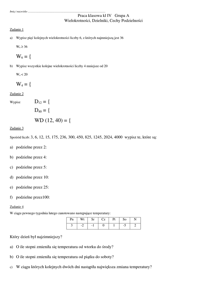 Praca klasowa "Wielokrotnaść i dzielniki. Cechy podzielności