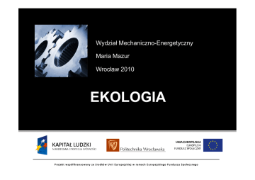 Wydział Mechaniczno-Energetyczny Maria Mazur Wrocław 2010 EKOLOGIA 1 KONSPEKT WYKŁADU 1. WPROWADZENIE (kosmiczna mapa śmieci, źródła zanieczyszczenia przestrzeni okołoziemskiej, kolizje w kosmosie i niekontrolowane „powroty” kosmicznego złomu na Ziemię - skutki, zagroŜenia i przeciwdziałanie) 2. EKOSYSTEM ZIEMI (ewolucja chemiczna i biologiczna Ziemi, ekosfera – systemy ekologiczne i pierwiastki Ŝycia, obieg azotu w przyrodzie, uproszczony schemat ziemskiego ekosystemu, ekosystem wodny, sieciowa budowa systemu, program BIOSFERA II, uniwersalne prawa ekologii) 3. MIGRACJA ZANIECZYSZCZEŃ W EKOSYSTEMACH (ogólny schemat migracji, emisja, imisja i transmisja zanieczyszczeń w ekosystemach, migracja zanieczyszczeń w atmosferze – wzajemne oddziaływanie, erupcje wulkanów, zanieczyszczenia antropogeniczne, migracja zanieczyszczeń w wodach i w łańcuchach troficznych, podsumowanie) 4. RELACJA CZŁOWIEK – ŚRODOWISKO (konflikt antroposfery i biosfery, reakcje ekosystemu na działalność ludzką, przykłady odwetu ekologicznego – nawoŜenie azotowe, nawadnianie terenów pustynnych, hydroenergetyka, „czyste” preparaty, introdukcja obcych gatunków, przykłady bumerangu ekologicznego – ochrona gatunkowa słoni, ochrona lasów przed poŜarami) 5. EKSPLOZJA DEMOGRAFICZNA (liczebność populacji – model S i model J, demografia – Polska, liczebność populacji oraz wskaźniki demograficzne – świat i jego regiony, zmiany liczebności populacji ludzi – ujęcie historyczne i prognozy, eksplozja demograficzna – skutki, megamiasta, zmiany w uŜytkowaniu gruntów) KONSPEKT WYKŁADU 6. PROBLEMY ENERGETYCZNE ŚWIATA (teoria ludnościowa Malthusa, nakłady energetyczne na produkcję Ŝywności, dynamika zmian produkcji rolnej, produkt krajowy brutto a zuŜycie energii elektrycznej w róŜnych regionach świata, zróŜnicowanie poziomu zuŜycia nośników energii pierwotnej na świecie, globalne zuŜycie nośników energii pierwotnej w perspektywie roku 2100, globalne zasoby i rezerwy surowców energetycznych, lokalizacja rezerw surowców energetycznych, destrukcyjne oddziaływanie spalania paliw na środowisko, energetyka jądrowa – perspektywy rozwoju, problem odpadów i wycofywania elektrowni z eksploatacji, energetyka termojądrowa, wpływ hydroenergetyki na środowisko, energetyka solarna dziś i w przyszłości, energetyka wiatrowa, fale i pływy, energetyka geotermalna) 7. EFEKT CIEPLARNIANY (widmo promieniowania docierającego do powierzchni Ziemi i emitowanego z powierzchni Ziemi, temperatura efektywna Ziemi, termiczny efekt istnienia atmosfery, dynamika zmian składu chemicznego atmosfery ziemskiej, wymuszenie radiacyjne – roczny indeks gazów cieplarnianych, globalne zmiany temperatury przy powierzchni Ziemi, zmiana profilu temperatury w atmosferze ziemskiej, czynniki wpływające na zmianę globalnej temperatury na Ziemi, - gazy cieplarniane, wulkany, aerozole kwasu siarkowego, aktywność Słońca, oceany jako regulator klimatu ziemskiego- cyrkulacja wód oceanu światowego i zakłócenia pionowej wymiany wód oceanu światowego, trendy klimatyczne, prognozy na II poł. XXI wieku - modele klimatyczne 8. OZONOSFERA (struktura atmosfery ziemskiej, koncentracja ozonu w atmosferze, ozon stratosferyczny – czym jest i jak powstaje, zmiany w ozonosferze nad Antarktydą, hipotezy zaniku ozonosfery - dynamika atmosfery, aktywność Słońca, chlor, freony - teoria Rowlanda i Moliny, Protokół Montrealski, prognozy) KONSPEKT WYKŁADU 9. ATMOSFERA (źródła zanieczyszczeń, standardy jakości powietrza, czynniki determinujące rozprzestrzenianie się zanieczyszczeń w powietrzu: meteorologiczne – prędkość i zmienność kierunku wiatru, pionowy gradient temperatury, czynniki topograficzne, emitory i transgraniczne przemieszczanie zanieczyszczeń, emisja zanieczyszczeń powietrza atmosferycznego z terenu Polski, główne kierunki ochrony atmosfery zmniejszenie energochłonności, recykling, zmiana struktury nośników energii pierwotnej, uszlachetnianie węgla, wzrost sprawności produkcji energii elektrycznej i cieplnej, odpylanie, odsiarczanie i odazotowanie gazów) 10. HYDROSFERA (zasoby wody, dynamika hydrosfery, wykorzystanie wody, źródła i mechanizmy degradacji wód powierzchniowych - substancje biogeniczne, detergenty, metale cięŜkie, pestycydy, oleje i polimery, pogrzewanie wód, sole mineralne, kategorie wód powierzchniowych, klasyfikacja jakości wód powierzchniowych i podziemnych, procesy samooczyszczania środowiska wodnego - rozcieńczanie, sedymentacja, adsorpcja, biologiczne usuwanie zanieczyszczeń, wymiana substancji pomiędzy powietrzem i dnem, oczyszczanie ścieków) 11. LITOSFERA (skały osadowe, czynniki glebotwórcze i ich funkcje, mechanizmy degradacji gleby - erozja wodna i eoliczna, przekształcenia geotechniczne, hydrologiczne i chemiczne, kryteria degradacji gleby, główne kierunki ochrony gleb, gospodarka odpadami – odzysk, utylizacja, gospodarka odpadami w Polsce, rekultywacja składowisk odpadów paleniskowych