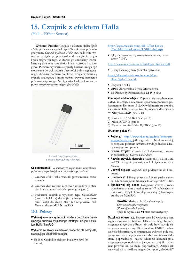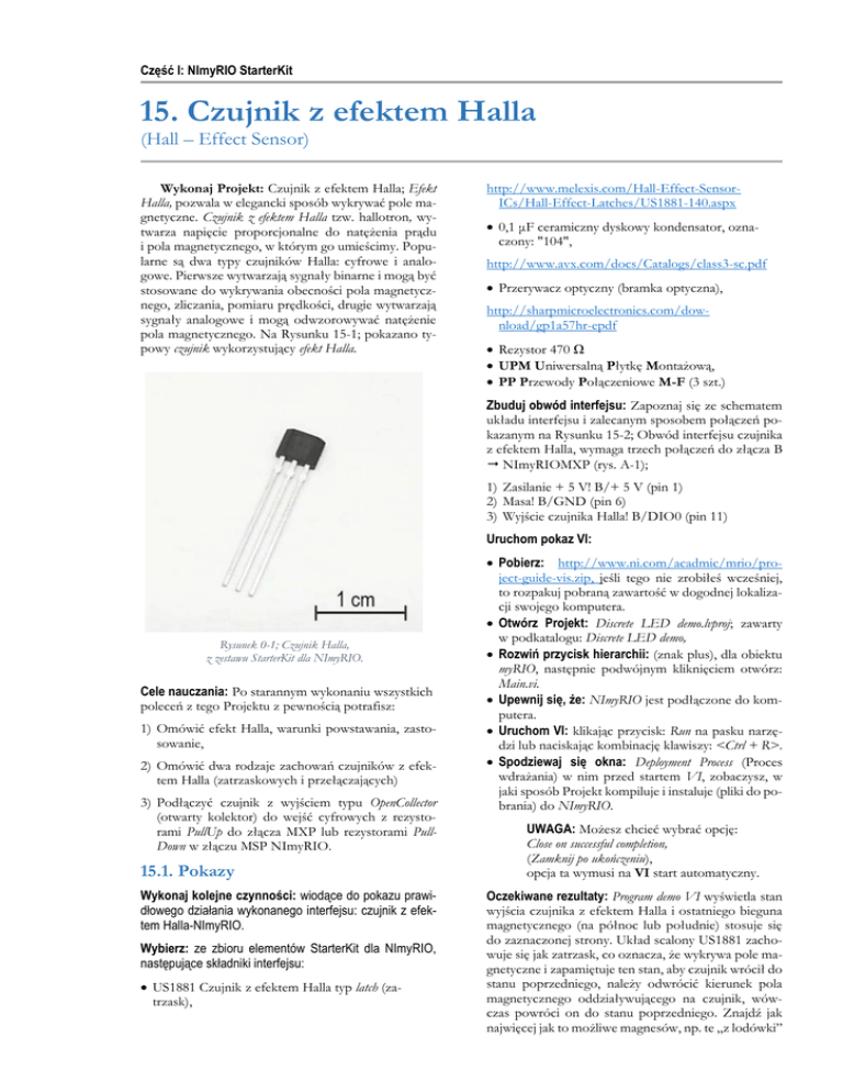Część I: NImyRIO StarterKit 15. Czujnik z efektem Halla (Hall – Effect Sensor) Wykonaj Projekt: Czujnik z efektem Halla; Efekt Halla, pozwala w elegancki sposób wykrywać pole magnetyczne. Czujnik z efektem Halla tzw. hallotron, wytwarza napięcie proporcjonalne do natężenia prądu i pola magnetycznego, w którym go umieścimy. Popularne są dwa typy czujników Halla: cyfrowe i analogowe. Pierwsze wytwarzają sygnały binarne i mogą być stosowane do wykrywania obecności pola magnetycznego, zliczania, pomiaru prędkości, drugie wytwarzają sygnały analogowe i mogą odwzorowywać natężenie pola magnetycznego. Na Rysunku 15-1; pokazano typowy czujnik wykorzystujący efekt Halla. http://www.melexis.com/Hall-Effect-SensorICs/Hall-Effect-Latches/US1881-140.aspx 0,1 μF ceramiczny dyskowy kondensator, oznaczony: "104", http://www.avx.com/docs/Catalogs/class3-sc.pdf Przerywacz optyczny (bramka optyczna), http://sharpmicroelectronics.com/download/gp1a57hr-epdf Rezystor 470 Ω UPM Uniwersalną Płytkę Montażową, PP Przewody Połączeniowe M-F (3 szt.) Zbuduj obwód interfejsu: Zapoznaj się ze schematem układu interfejsu i zalecanym sposobem połączeń pokazanym na Rysunku 15-2; Obwód interfejsu czujnika z efektem Halla, wymaga trzech połączeń do złącza B NImyRIOMXP (rys. A-1); 1) Zasilanie + 5 V! B/+ 5 V (pin 1) 2) Masa! B/GND (pin 6) 3) Wyjście czujnika Halla! B/DIO0 (pin 11) Uruchom pokaz VI: Rysunek 0-1; Czujnik Halla, z zestawu StarterKit dla NImyRIO. Cele nauczania: Po starannym wykonaniu wszystkich poleceń z tego Projektu z pewnością potrafisz: 1) Omówić efekt Halla, warunki powstawania, zastosowanie, 2) Omówić dwa rodzaje zachowań czujników z efektem Halla (zatrzaskowych i przełączających) 3) Podłączyć czujnik z wyjściem typu OpenCollector (otwarty kolektor) do wejść cyfrowych z rezystorami PullUp do złącza MXP lub rezystorami PullDown w złączu MSP NImyRIO. 15.1. Pokazy Wykonaj kolejne czynności: wiodące do pokazu prawidłowego działania wykonanego interfejsu: czujnik z efektem Halla-NImyRIO. Wybierz: ze zbioru elementów StarterKit dla NImyRIO, następujące składniki interfejsu: US1881 Czujnik z efektem Halla typ latch (zatrzask), Pobierz: http://www.ni.com/acadmic/mrio/project-guide-vis.zip, jeśli tego nie zrobiłeś wcześniej, to rozpakuj pobraną zawartość w dogodnej lokalizacji swojego komputera. Otwórz Projekt: Discrete LED demo.lvproj; zawarty w podkatalogu: Discrete LED demo, Rozwiń przycisk hierarchii: (znak plus), dla obiektu myRIO, następnie podwójnym kliknięciem otwórz: Main.vi. Upewnij się, że: NImyRIO jest podłączone do komputera. Uruchom VI: klikając przycisk: Run na pasku narzędzi lub naciskając kombinację klawiszy: <Ctrl + R>. Spodziewaj się okna: Deployment Process (Proces wdrażania) w nim przed startem VI, zobaczysz, w jaki sposób Projekt kompiluje i instaluje (pliki do pobrania) do NImyRIO. UWAGA: Możesz chcieć wybrać opcję: Close on successful completion, (Zamknij po ukończeniu), opcja ta wymusi na VI start automatyczny. Oczekiwane rezultaty: Program demo VI wyświetla stan wyjścia czujnika z efektem Halla i ostatniego bieguna magnetycznego (na północ lub południe) stosuje się do zaznaczonej strony. Układ scalony US1881 zachowuje się jak zatrzask, co oznacza, że wykrywa pole magnetyczne i zapamiętuje ten stan, aby czujnik wrócił do stanu poprzedniego, należy odwrócić kierunek pola magnetycznego oddziaływującego na czujnik, wówczas powróci on do stanu poprzedniego. Znajdź jak najwięcej jak to możliwe magnesów, np. te „z lodówki” Rysunek 0-2; Układ pokazowy interfejsu czujnika z efektem Halla, zalecany schemat połączeń do gniazda B NImyRIOMXP często nadają się do naszego Projektu. Magnesy „lodówkowe” dobrze działają i nadają się do eksperymentowania z czułością czujnika: jak blisko trzeba zbliżyć i odwrócić magnes, aby zmienić stan czujnika zatrzaskowego? Ile odrębnych biegunów magnetycznych można wykryć na magnesie? Odpowiedź jest zaskakująca! Kliknij przycisk: Stop lub wybierz z klawiatury komputera przycisk <Esc>, aby zatrzymać VI i zresetować NImyRIO; reset spowoduje powrót NImyRIO do trybu początkowego, czyli ustawień początkowych. W stanie reset, do pamięci układu nie muszą być wpisane same zera lub same jedynki w rejestrach, reset - to powrót układu do stanu początkowego. Wskazówki dotyczące rozwiązywania problemów: nie widzisz oczekiwanych rezultatów? Potwierdź prawdziwość poniższych zdarzeń: LED wskazująca poprawność zasilania w NImyRIO świeci jaskrawym światłem, Przycisk Run, na pasku narzędzi jest czarny, co oznacza, że VI jest w RunMode - trybie pracy, Prawidłowy wybór złącza B MPX, końcówek (pinów) i jakości połączeń PP (Przewodami Połączeniowymi). Prawidłową polaryzację czujnika w obwodzie interfejsu US1881!, Sprawdź patrząc z przodu na VDD po lewej stronie masz zasilanie VDD, w środku GND (ziemia, masa), a wyjście VOUT po prawej stronie układu. 15.2. Teoria interfejsu Obwód interfejsu: Elektrony przemieszczające się, w poprzecznym do kierunku ich ruchu polu magnetycznym, oddziaływają z nim. Zatem przepuszczając prąd elektryczny, przez przewodzącą płytkę umieszczoną w polu magnetycznym, zaobserwujemy ciekawe zjawisko: elektrony mają tendencję do odchylania się na bok płytki, pozostawiając ładunki dodatnie po jej drugiej stronie. Efekt ten, jako pierwszy wykrył amerykański fizyk Edwin Herbert Hall w 1879 roku. Efekt ten, na cześć odkrywcy nazywamy Efektem Halla. Kompletny czujnik wykorzystujący efekt Halla US1881 wykrywa przemieszczanie się ładunków elektrycznych i wytwarza na wyjściu napięcie Halla, ma wbudowany wzmacniacz, kształtujący odpowiednio to napięcie, pozwala wyznaczyć rodzaj bieguna magnetycznego, jako stan wyjścia open-drenowego odpowiedniego poziomu dla wejść cyfrowych. Jest układem scalonym, a nie tylko zwykłym czujnikiem