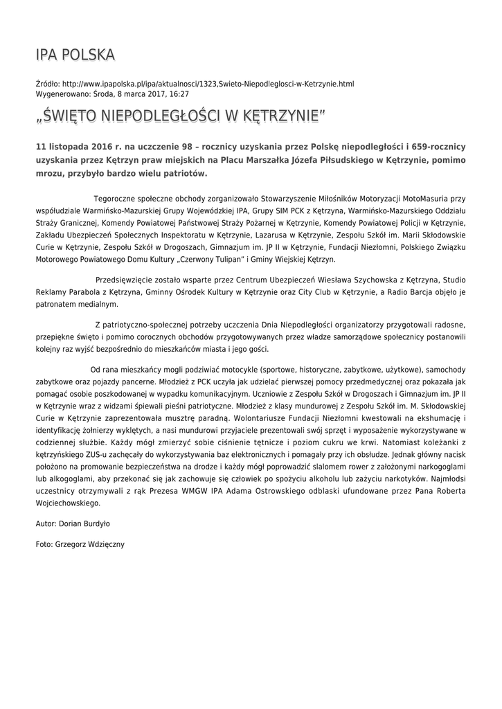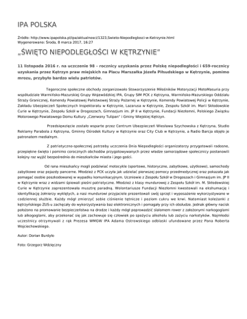 IPA POLSKA Źródło: http://www.ipapolska.pl/ipa/aktualnosci/1323,Swieto-Niepodleglosci-w-Ketrzynie.html Wygenerowano: Środa, 8 marca 2017, 16:27 „ŚWIĘTO NIEPODLEGŁOŚCI W KĘTRZYNIE” 11 listopada 2016 r. na uczczenie 98 – rocznicy uzyskania przez Polskę niepodległości i 659-rocznicy uzyskania przez Kętrzyn praw miejskich na Placu Marszałka Józefa Piłsudskiego w Kętrzynie, pomimo mrozu, przybyło bardzo wielu patriotów. Tegoroczne społeczne obchody zorganizowało Stowarzyszenie Miłośników Motoryzacji MotoMasuria przy współudziale Warmińsko-Mazurskiej Grupy Wojewódzkiej IPA, Grupy SIM PCK z Kętrzyna, Warmińsko-Mazurskiego Oddziału Straży Granicznej, Komendy Powiatowej Państwowej Straży Pożarnej w Kętrzynie, Komendy Powiatowej Policji w Kętrzynie, Zakładu Ubezpieczeń Społecznych Inspektoratu w Kętrzynie, Lazarusa w Kętrzynie, Zespołu Szkół im. Marii Skłodowskie Curie w Kętrzynie, Zespołu Szkół w Drogoszach, Gimnazjum im. JP II w Kętrzynie, Fundacji Niezłomni, Polskiego Związku Motorowego Powiatowego Domu Kultury „Czerwony Tulipan” i Gminy Wiejskiej Kętrzyn. Przedsięwzięcie zostało wsparte przez Centrum Ubezpieczeń Wiesława Szychowska z Kętrzyna, Studio Reklamy Parabola z Kętrzyna, Gminny Ośrodek Kultury w Kętrzynie oraz City Club w Kętrzynie, a Radio Barcja objęło je patronatem medialnym. Z patriotyczno-społecznej potrzeby uczczenia Dnia Niepodległości organizatorzy przygotowali radosne, przepiękne święto i pomimo corocznych obchodów przygotowywanych przez władze samorządowe społecznicy postanowili kolejny raz wyjść bezpośrednio do mieszkańców miasta i jego gości. Od rana mieszkańcy mogli podziwiać motocykle (sportowe, historyczne, zabytkowe, użytkowe), samochody zabytkowe oraz pojazdy pancerne. Młodzież z PCK uczyła jak udzielać pierwszej pomocy przedmedycznej oraz pokazała jak pomagać osobie poszkodowanej w wypadku komunikacyjnym. Uczniowie z Zespołu Szkół w Drogoszach i Gimnazjum im. JP II w Kętrzynie wraz z widzami śpiewali pieśni patriotyczne. Młodzież z klasy mundurowej z Zespołu Szkół im. M. Skłodowskiej Curie w Kętrzynie zaprezentowała musztrę paradną. Wolontariusze Fundacji Niezłomni kwestowali na ekshumację i identyfikację żołnierzy wyklętych, a nasi mundurowi przyjaciele prezentowali swój sprzęt i wyposażenie wykorzystywane w codziennej służbie. Każdy mógł zmierzyć sobie ciśnienie tętnicze i poziom cukru we krwi. Natomiast koleżanki z kętrzyńskiego ZUS-u zachęcały do wykorzystywania baz elektronicznych i pomagały przy ich obsłudze. Jednak główny nacisk położono na promowanie bezpieczeństwa na drodze i każdy mógł poprowadzić slalomem rower z założonymi narkogoglami lub alkogoglami, aby przekonać się jak zachowuje się człowiek po spożyciu alkoholu lub zażyciu narkotyków. Najmłodsi uczestnicy otrzymywali z rąk Prezesa WMGW IPA Adama Ostrowskiego odblaski ufundowane przez Pana Roberta Wojciechowskiego. Autor: Dorian Burdyło Foto: Grzegorz Wdzięczny Ocena: 5/5 (1) Tweetnij