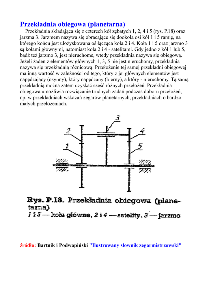 Przekładnia obiegowa (planetarna) Przekładnia składająca się z czterech kół zębatych 1, 2, 4 i 5 (rys. P.18) oraz jarzma 3. Jarzmem nazywa się obracające się dookoła osi kół 1 i 5 ramię, na którego końcu jest ułożyskowana oś łącząca koła 2 i 4. Koła 1 i 5 oraz jarzmo 3 są kołami głównymi, natomiast koła 2 i 4 - satelitami. Gdy jedno z kół 1 lub 5, bądź też jarzmo 3, jest nieruchome, wtedy przekładnia nazywa się obiegową. Jeżeli żaden z elementów głównych 1, 3, 5 nie jest nieruchomy, przekładnia nazywa się przekładnią różnicową. Przełożenie tej samej przekładni obiegowej ma inną wartość w zależności od tego, który z jej głównych elementów jest napędzający (czynny), który napędzany (bierny), a który - nieruchomy. Tą samą przekładnią można zatem uzyskać sześć różnych przełożeń. Przekładnia obiegowa umożliwia rozwiązanie trudnych zadań podczas doboru przełożeń, np. w przekładniach wskazań zegarów planetarnych, przekładniach o bardzo małych przełożeniach. źródło: Bartnik i Podwapiński "Ilustrowany słownik zegarmistrzowski"