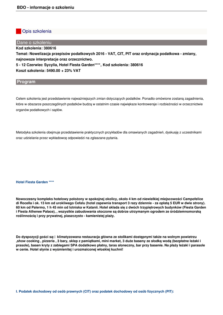 BDO - informacje o szkoleniu Opis szkolenia Dane o szkoleniu Kod szkolenia: 380616 Temat: Nowelizacja przepisów podatkowych 2016 - VAT, CIT, PIT oraz ordynacja podatkowa - zmiany, najnowsze interpretacje oraz orzecznictwo. 5 - 12 Czerwiec Sycylia, Hotel Fiesta Garden****, Kod szkolenia: 380616 Koszt szkolenia: 5490.00 + 23% VAT Program Celem szkolenia jest przedstawienie najważniejszych zmian dotyczących podatków. Ponadto omówione zostaną zagadnienia, które w obszarze poszczególnych podatków budzą w ostatnim czasie największe kontrowersje i rozbieżności w orzecznictwie organów podatkowych i sądów. Metodyka szkolenia obejmuje przedstawienie praktycznych przykładów dla omawianych zagadnień, dyskusję z uczestnikami oraz udzielanie przez wykładowcę odpowiedzi na zgłaszane pytania. Hotel Fiesta Garden **** Nowoczesny kompleks hotelowy położony w spokojnej okolicy, około 4 km od niewielkiej miejscowości Campofelice di Rocella i ok. 13 km od urokliwego Cefalu (hotel zapewnia transport 3 razy dziennie - za opłatą 5 EUR w dwie strony). 60 km od Palermo, 1 h 45 min od lotniska w Katanii. Hotel składa się z dwóch trzypiętrowych budynków (Fiesta Garden i Fiesta Athenee Palace), , wszystkie zabudowania otoczone są dobrze utrzymanym ogrodem ze śródziemnomorską roślinnością i przy prywatnej, piaszczysto - kamienistej plaży. Do dyspozycji gości są: klimatyzowana restauracja główna ze stolikami dostępnymi także na wolnym powietrzu ,show cooking , pizzeria , 3 bary, sklep z pamiątkami, mini market, 3 duże baseny ze słodką wodą (bezpłatne leżaki i prasole), basen kryty z zabiegami SPA dodatkowo płatny, taras słoneczny, bar przy basenie. Na plaży leżaki i parasole w cenie. Hotel słynie z wyśmienitej i urozmaiconej włoskiej kuchni! I. Podatek dochodowy od osób prawnych (CIT) oraz podatek dochodowy od osób fizycznych (PIT): BDO - informacje o szkoleniu 1. Przychody podatkowe: a) Wydanie rzeczy, zbycie prawa majątkowego, wykonanie usługi a dostawa towarów i świadczenie usług - CIT a VAT podobieństwa i różnice, b) Usługi rozliczana w okresach rozliczeniowych - jakie usługi mogą być rozliczane w okresach rozliczeniowych? c) Zaliczka - CIT a VAT - podobieństwa i różnice - kiedy przychód nie stanowiący przychodów podatkowych 2. Koszty uzyskania przychodów: a) Definicja. Podział na koszty bezpośrednio i pośrednio związane z przychodem. b) Rozliczanie kosztów w czasie. Czynsz inicjalny w przypadku umowy leasingu. Jednorazowo czy rozliczać w czasie - nowe interpretacje. 3. Korekta przychodów oraz kosztów uzyskania przychodów. Błąd rachunkowy, pomyłka, rabaty, upusty, bonifikaty, skonta, zwroty - kiedy korekta wsteczna, kiedy korekta bieżąca - nowa regulacja. 4. Świadczenia na rzecz pracowników jako koszt uzyskania przychodów oraz jako przychód. Świadczenia rzeczowe na rzecz pracowników - kiedy przychód ? imprezy integracyjne, nocleg pracowników nie będących w podróży służbowej, zapewnienie całodziennego i częściowego wyżywienia -kiedy przychód? 5. Koszty niestanowiące kosztów uzyskania przychodów: a) Reprezentacja. Kiedy reprezentacja? Kiedy koszty uzyskania przychodów? Usługi gastronomiczne, usługi cateringowe, artykuły spożywcze, prezenty, upominki, gadżety, strój, ubiór, imprezy masowe. b) Samochody osobowe. Amortyzacja. Ubezpieczenie. Najem. Czy czynsz jest limitowany przez ewidencję przebiegu pojazdu? Leasing. Samochody prywatne pracowników wykorzystywane na cele służbowe. Samochody służbowe wykorzystywane na cele prywatne - czy paliwo mieści się w ryczałcie? c) Wierzytelności. Przedawnione, umorzone, odpisy aktualizujące, odpisane jako nieściągalne, straty z tytułu zbycia wierzytelności. Czy strata z tytułu zbycia przedawnionej wierzytelności stanowi koszt? Zasady udokumentowania oraz uprawdopodobnienia po zmianach. d) Kary umowne, odszkodowania. Kiedy koszt uzyskania przychodów? Przypadek rozwiązania umowy najmu zawartej na czas określony. 6. Amortyzacja: a) Środki trwałe finansowane z dotacji. Korekta wsteczna czy bieżąca? b) Straty na środkach trwałych ze szczególnym uwzględnieniem strat na inwestycjach w obcych środkach trwałych. Konsekwencje w CIT oraz VAT. 7. Różnice kursowe. Różnice kursowe na przychodach i kosztach. Różnice kursowe od własnych środków wyrażonych w walutach obcych. Różnice kursowe na kredytach i pożyczkach. Kiedy kurs faktyczny a kiedy kurs średni NBP? Różnice kursowe od kwoty netto czy brutto? Jak postępować w przypadku przewalutowania? 8. Podatek u źródła. Wynajem samochodu, bilety lotnicze, zakup przez Internet. Certyfikat rezydencji. Kiedy ochrona? Oryginał, czy kopia? 9. Transakcje pomiędzy podmiotami powiązanymi. Nowa regulacja. Nowa definicja podmiotów powiązanych. Nowe założenia. Nowe limity dokumentacyjne. Nowe elementy dokumentacji. Informacja o grupie. Termin sporządzenia oraz termin przedłożenia dokumentacji. CIT-TP. II. Podatek od towarów i usług: BDO - informacje o szkoleniu 1. Odpłatna dostawa towarów, odpłatne świadczenie usług, WDT, WNT, eksport towarów, import usług. 2. Nieodpłatna dostawa towarów, nieodpłatne świadczenie usług. Kiedy VAT? 3. Miejsce dostawy towarów oraz miejsce świadczenia usług. 4. Odwrotne obciążenie jako wyjątek od reguły ogólnej. Odwrotne obciążenie w obrocie krajowym. Odwrotne obciążenie w obrocie międzynarodowym. Omówienie nowej regulacji. 5. Obowiązek podatkowy. Obowiązek podatkowy w dacie dostawy towarów oraz wykonania usług. Obowiązek podatkowy na zasadzie kasowej. Obowiązek podatkowy w dacie wystawienia faktury. Jak postępować w przypadku refakturowania. Obowiązek podatkowy w przypadku WDT oraz WNT. 6. Podstawa opodatkowania. Jak ustalać podstawę opodatkowania ? Koszty transportu, ubezpieczenia i inne koszty dodatkowe a podstawa opodatkowania. Czynsz i media. Podstawa opodatkowania w przypadku odwrotnego obciążenia. P