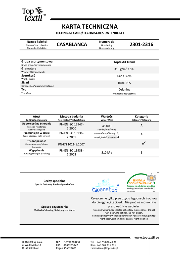 KARTA TECHNICZNA TECHNICAL CARD/TECHNISCHES DATENBLATT Nazwa kolekcji Name of the collection Name der Kollektion CASABLANCA Numeracja 2301-2316 Numbering Nummerierung Grupa asortymentowa Toptextil Trend Brand group/Sortimentgruppe Gramatura 310 g/m² ± 5% Weight/ Flächengewicht Szerokość 142 ± 3 cm Width/ Breite Skład 100% PES Composition/ Zusammensetzung Typ Dzianina Type/Typ knit fabric/das Gestrick Atest Metoda badania Wartość Kategoria Certificate/Zulassung Test metod/Prüfverfahren Value/Wert Category/Kategorie Odporność na ścieranie PN-EN ISO 129472:2000 PN-EN ISO 139362:2005 45 000 A suwów/rubs/Hübe Abrasion resistance/ Reibbeständigkeit Przesunięcie w szwie Seam slippage/ Naht versetzt Trudnopalność Flame retardant/Schwer brennbar Wypychanie Bursting strenght / Füllung osnowa/warp/Aufzug: 1, wątek/weft/Leitfaden: A PN-EN 1021-1:2007 PN-EN ISO 139381:2002 4 510 kPa B Cechy specjalne Special features/ Sondereigenschaften Sposób czyszczenia Method of cleaning/Reinigungsverfahren Czyszczenie tylko prze użyciu łagodnych środków do pielęgnacji tapicerki. Nie prać na mokro. Nie prasować. Nie wybielać. Cleaning with mild agents for upholstery maintenance. Do not wet-clean. Do not iron. Do not bleach. Reinigung unter Verwendung der milden Polsterreinigungsmittel. Nicht nass waschen. Nicht bügeln. Nicht bleichen.