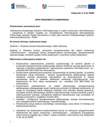WOJEWÓDZTWO PODKARPACKIE Załącznik nr 6 do SIWZ OPIS PRZEDMIOTU ZAMÓWIENIA Przedmiotem zamówienia jest: „Rozbudowa Szpitalnego Systemu Informatycznego w części medycznej i administracyjno - zarządczej w ramach projektu pn. Kompleksowa informatyzacja Samodzielnego Publicznego Zespołu Opieki Zdrowotnej w Lesku jako element Podkarpackiego Systemu Informacji Medycznej – PSIM ” W ramach którego realizowane będą: Zadanie 1- Dostawa serwera bazodanowego i półki dyskowej. Zadanie 2- Dostawa licencji, wdrożenie oprogramowania dla części medycznej i administracyjno - zarządczej, Zakup oprogramowania serwerowego, oprogramowania bazodanowego, drukarek opasek kodów paskowych i czytników kodów kreskowych. Wykonawca zobowiązany będzie do: • • • • • • 1 Dostarczenia zaświadczenia podmiotu uprawnionego do kontroli jakości iż producent oprogramowania aplikacyjnego spełnia określone wymogi jakościowe co najmniej w zakresie projektowania i wykonywania systemów informatycznych, np.: certyfikat ISO 9001:2000 lub równoważny. Dostarczenia zaświadczenia podmiotu uprawnionego do kontroli jakości iż podmiot świadczący usługi wdrożenia i serwisu oprogramowania aplikacyjnego spełnia określone wymogi jakościowe odpowiednio do wykonywanych w trakcie zamówienia usług w zakresie wdrażania systemów informatycznych oraz świadczenia do nich usług serwisowych, np.: certyfikat ISO 9001:2000 lub równoważny. Dostarczenia zaświadczenia, że całość oferowanego oprogramowania aplikacyjnego obsługującego część medyczną pochodzi od jednego producenta. (Z uwagi na wymaganą pełną integrację modułów oraz jednolity sposób gwarancji, wszystkie moduły oferowanego systemu informatycznego muszą umożliwić pracę z wykorzystaniem jednego rozwiązania platformy bazodanowej oraz pochodzić od jednego producenta z wyjątkiem modułu ISO). Instalacji i konfiguracji oprogramowania aplikacyjnego, sprzętu komputerowego oraz oprogramowania operacyjnego i bazodanowego. Świadczenia usługi nadzoru autorskiego i serwisowego przez okres 12 miesięcy od dostarczenia licecncji. Udzielenia lub dostarczenia bezterminowej licencji na wdrożone oprogramowanie dziedzinowe dla części medycznej i administracyjno – zarządczej Szczegółowy wykaz licencji znajduje się w Tabeli 1 wykaz modułów i ilość licencji oraz Załączniku nr 6a, 6b do SIWZ WOJEWÓDZTWO PODKARPACKIE • Zamawiający zastrzega sobie prawo do zaproszenia Wykonawców, którzy złożyli oferty na prezentację probki oferowanego oprogramowania aplikacyjnego. Szczegółowe wymagania w Załączniku nr 7 do SIWZ Wymagania dt. próbki oraz przeprowadzenia prezentacji oferowanego ZSI. Stwierdzenie jakiejkolwiek niezgodności z deklarowaną przez Wykonawców w ofercie w zakresie wymagań i parametrów skutkować będzie odrzuceniem oferty (podstawa prawna: art. 14 ustawy z dnia 16 kwietnia 1993 r. „o zwalczaniu nieuczciwej konkurencji).” W ramach realizacji przedmiotu zamówienia do Wykonawcy należeć będzie: Zadanie 1 Dostawa serwera bazodanowego i półki dyskowej: • Serwer bazodanowy– 1 szt. • Półka dyskowa – 1 szt. wraz z instalacją i konfiguracją w zakresie: • Instalacja serwera w szafie RACK, • Podłączenie serwera bazy danych do macierzy dyskowej z wykorzystaniem połączeń FC, • Prezentacja danych z macierzy dyskowej dla serwera bazy danych, • Implementacja polityki backupu dla bazy danych w trybie Online w istniejącym systemie kopiowania i odtwarzania danych (EMC NetWorker jaki Zamawiający posiada), rozbudowa istniejącej macierzy dyskowej o dodatkową półkę dyskową: • Instalacja półki dyskowej w szafie RACK, • Podłączenie oraz inicjalizacja półki w macierzy dyskowej, • Definicja grup RAID10 na nowej przestrzeni dyskowej, • Definicja dysków logicznych (LUN) dla przestrzeni bazy danych. Wymagania minimalne serwera bazodanowego i półki dyskowej znajdują się w Załączniku nr 5 do SIWZ. Zadanie 2 • System operacyjny serwerowy – 4 licencje dla podmiotów administracji publicznej wraz z obsługą w domenie urządzeń klienckich (komputerów) – 20 CAL . • Licencja bazy danych Szpital Oprogramowanie Bazy Danych (licencje na procesor) - bez asysty technicznej - 1 licencja. Wymagania minimalne na System Operacyjny Serwerowy i Motor Bazy Danych opisany w Załączniku nr 6c do SIWZ. • Dostawa drukarek opasek kodów paskowych i czytników kodów kreskowych Wymagania minimalne opisane w Załączniku nr 6d do SIWZ. • Dostawa licencji, wdrożenie oprogramowania dla części medycznej i administracyjno - zarządczej, Wymagania minimalne na ZSI znajduje się w Załącznikach nr: 6a, 6b do SIWZ 2 WOJEWÓDZTWO PODKARPACKIE Rodzaje modułów i liczba licencji zaplanowane do zakupu: lp. Moduły, aplikacje Liczba licencji 1 Wsparcie budżetowania 1 2 Kalkulacja kosztów leczenia 1 3 Sprzedaż usług medycznych 1 4 Gospodarka majątkiem trwałym 1 5 System Informowania Kierownictwa (BI) 1 6 Grafiki 8 7 Zamówienia publiczne 1 8 Apteczka Oddziałowa 7 9 Ruch Chorych 28 10 Zlecenia 10 11 Dokumentacja formularzowa 1 12 Blok Operacyjny 3 13 Zakażenia zakładowe 1 14 Rejestracja Przchodnia 10 15 Gabinet lekarski 18 16 Gabinet zabiegowy 4 17 Statystyka przychodni 1 18 Pracownia Diagnostyczna 8 19 Recepcja, gabinet rehabilitacja 2 20 Archiwum papierowej Dokumentacji Medycznej 1 21 Laboratorium z mikrobiologią (Bank krwi), Serologia 7 22 Punkt pobrań 7 23 Interfejsy urządzeń w laboratorium 4 24 System zarządzania jakością - ISO 1 26 Transport sanitarny 1 27 Ewidencja sprzętu i aparatury medycznej 1 28 System zgłoszeń (helpdesk) Tabela 1 wykaz modułów i ilość licencji 1 Wdrożenie i konfiguracja oprogramowania – część medyczna i administracyjnozarządcza. 1. Realizacja przedmiotu zamówienia będzie się odbywała w oparciu o Harmonogram rzeczowo – finansowy (HFR), który zostanie uzgodniony przez Wykonawcę i Zamawiającego w terminie 14 dni