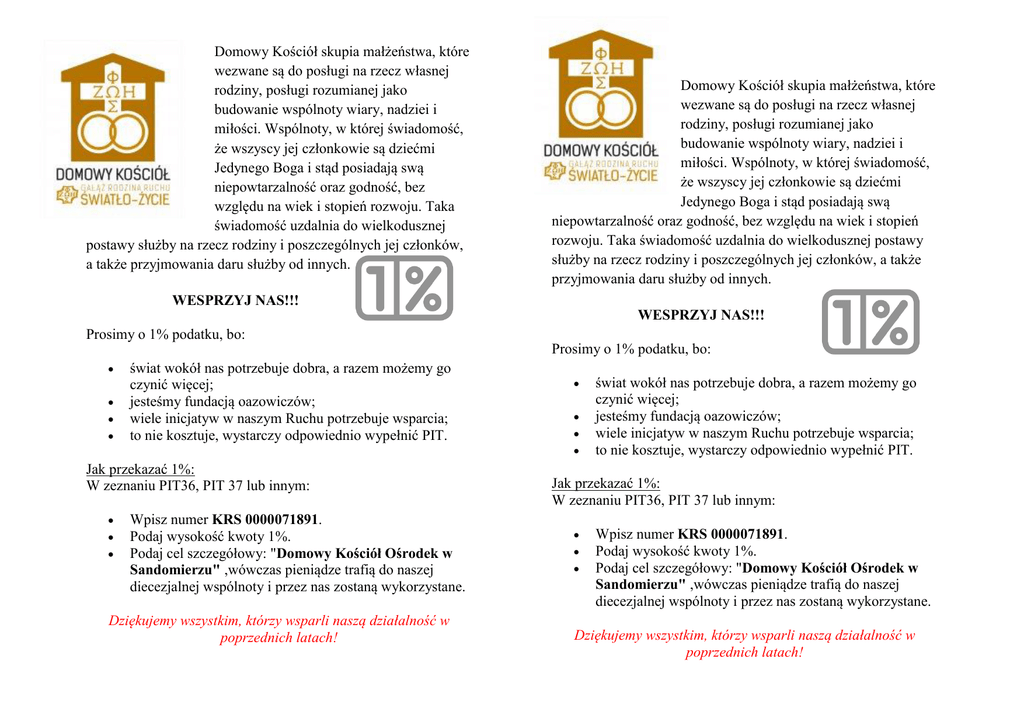 Domowy Kościół skupia małżeństwa, które wezwane są do posługi na rzecz własnej rodziny, posługi rozumianej jako budowanie wspólnoty wiary, nadziei i miłości. Wspólnoty, w której świadomość, że wszyscy jej członkowie są dziećmi Jedynego Boga i stąd posiadają swą niepowtarzalność oraz godność, bez względu na wiek i stopień rozwoju. Taka świadomość uzdalnia do wielkodusznej postawy służby na rzecz rodziny i poszczególnych jej członków, a także przyjmowania daru służby od innych. Domowy Kościół skupia małżeństwa, które wezwane są do posługi na rzecz własnej rodziny, posługi rozumianej jako budowanie wspólnoty wiary, nadziei i miłości. Wspólnoty, w której świadomość, że wszyscy jej członkowie są dziećmi Jedynego Boga i stąd posiadają swą niepowtarzalność oraz godność, bez względu na wiek i stopień rozwoju. Taka świadomość uzdalnia do wielkodusznej postawy służby na rzecz rodziny i poszczególnych jej członków, a także przyjmowania daru służby od innych. WESPRZYJ NAS!!! WESPRZYJ NAS!!! Prosimy o 1% podatku, bo: Prosimy o 1% podatku, bo: świat wokół nas potrzebuje dobra, a razem możemy go czynić więcej; jesteśmy fundacją oazowiczów; wiele inicjatyw w naszym Ruchu potrzebuje wsparcia; to nie kosztuje, wystarczy odpowiednio wypełnić PIT. Jak przekazać 1%: W zeznaniu PIT36, PIT 37 lub innym: Wpisz numer KRS 0000071891. Podaj wysokość kwoty 1%. Podaj cel szczegółowy: "Domowy Kościół Ośrodek w Sandomierzu" ,wówczas pieniądze trafią do naszej diecezjalnej wspólnoty i przez nas zostaną wykorzystane. Dziękujemy wszystkim, którzy wsparli naszą działalność w poprzednich latach! świat wokół nas potrzebuje dobra, a razem możemy go czynić więcej; jesteśmy fundacją oazowiczów; wiele inicjatyw w naszym Ruchu potrzebuje wsparcia; to nie kosztuje, wystarczy odpowiednio wypełnić PIT. Jak przekazać 1%: W zeznaniu PIT36, PIT 37 lub innym: Wpisz numer KRS 0000071891. Podaj wysokość kwoty 1%. Podaj cel szczegółowy: "Domowy Kościół Ośrodek w Sandomierzu" ,wówczas pieniądze trafią do naszej diecezjalnej wspólnoty i przez nas zostaną wykorzystane. Dziękujemy wszystkim, którzy wsparli naszą działalność w poprzednich latach!