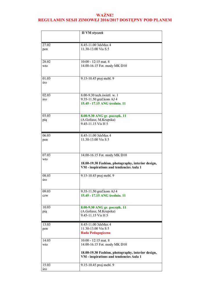 WAŻNE! REGULAMIN SESJI ZIMOWEJ 2016/2017 DOSTĘPNY POD PLANEM II VM styczeń 27.02 pon 8.45-11.00 3dsMax 4 11.30-13.00 Vis S 5 28.02 wto 10:00 - 12:15 mat. 8 14.00-16.15 Fot. mody MK D10 01.03 śro 9.15-10.45 proj mebl. 9 02.03 śro 8.00-9.30 tech.świetl. w. 1 9.35-11.50 graf.kom AJ 4 15.45 - 17.15 ANG średnio. 11 03.03 pią 8.00-9.30 ANG gr. początk. 11 (A.Goliasz, M.Krupska) 9.45-11.15 Vis H 5 06.03 pon 8.45-11.00 3dsMax 4 11.30-13.00 Vis S 5 07.03 wto 14.00-16.15 Fot. mody MK D10 18.00-19.30 Fashion, photography, interior design, VM - inspirations and tendencies Aula 1 08.03 śro 9.15-10.45 proj mebl. 9 09.03 czw 9.35-11.50 graf.kom AJ 4 15.45 - 17.15 ANG średnio. 11 10.03 pią 8.00-9.30 ANG gr. początk. 11 (A.Goliasz, M.Krupska) 9.45-11.15 Vis H 5 13.03 pon 8.45-11.00 3dsMax 4 11.30-13.00 Vis S 5 Rada Pedagogiczna 14.03 wto 10:00 - 12:15 mat. 8 14.00-16.15 Fot. mody MK D10 18.00-19.30 Fashion, photography, interior design, VM - inspirations and tendencies Aula 1 15.03 śro 9.15-10.45 proj mebl. 9 16.03 czw 8.00-9.30 tech.świetl. w. 1 9.35-11.50 graf.kom AJ 4 15.45 - 17.15 ANG średnio. 11 17.03 pią 8.00-9.30 ANG gr. początk. 11 (A.Goliasz, M.Krupska) 9.45-11.15 Vis H 5 20.03, pon 8.45-11.00 3dsMax 4 11.30-13.00 Vis S 5 21.03 wt 14.00-16.15 Fot. mody MK D10 18.00-19.30 Fashion, photography, interior design, VM - inspirations and tendencies Aula 1 22.03 śr 9.15-10.45 proj mebl. 9 23.03 czw 9.35-11.50 graf.kom AJ 4 15.45 - 17.15 ANG średnio. 11 24.03 pią 8.00-9.30 ANG gr. początk. 11 (A.Goliasz, M.Krupska) 9.45-11.15 Vis H 5 27.03 pon 8.45-11.00 3dsMax 4 11.30-13.00 Vis S 5 28.03 wt 10:00 - 12:15 mat. 8 14.00-16.15 Fot. mody MK D10 18.00-19.30 Fashion, photography, interior design, VM - inspirations and tendencies Aula 1 29.03 śr 9.15-10.45 proj mebl. 9 30.03 czw 8.00-9.30 tech.świetl. w. 1 9.35-11.50 graf.kom AJ 4 15.45 - 17.15 ANG średnio. 11 31.03 pią 8.00-9.30 ANG gr. początk. 11 (A.Goliasz, M.Krupska) 9.45-11.15 Vis H 5 Poprawki Materiałoznawstwo Fotografia B.Nastaborska M.Kolarz wtorek, 28.02, godz. 16.00-16.45 wtorek, 07.03, godz. 18.35-19.20, D10 3dsMax, proj.wnętrz proj.mebla G.Garcarz A.Marek poniedziałek, 06.03, godz 18.20-19.05, s.4 środa, 08.03, godz 12.30-13.15, s.9 Grafika kom Vis S Vis H J.angielski A.Janik W.Skulski M.Harłacz A.Chorosiński czwartek, 09.03, godz. 14.15-15.00, s. 4 poniedziałek, 06.03, godz. 13.00-13.45, s.5 piątek, 03.03, godz. 11.15-12.00, s.5 czwartek, 02.03, godz. 18.30-19.15, s.11 REGULAMIN SESJI SEMESTRALNEJ Złożenie indeksu wraz z kartą egzaminacyjną oraz kompletem zaliczeń w terminie określonym przez Szkołę jest obowiązkiem każdego Słuchacza, warunkującym rozliczenie semestru. DZIAŁ NAUCZANIA NIE PRZYJMUJE INDEKSÓW BEZ KART ORAZ KOMPLETU WPISÓW Termin oddania indeksu dzienni 10.03.2017 r. zaoczni 12.03.2017 r. Po upływie terminu złożenia indeksu Słuchacz zobowiązany jest do uiszczenia opłaty za nieterminowe złożenie indeksu w wysokości 100 zł na indywidualny numer rachunku bankowego. Do Działu Nauczania indeks musi być złożony z kartą egzaminacyjną, kompletem wpisów i potwierdzeniem wpłaty za nieterminowe złożenie indeksu. Rada Pedagogiczna 13.03.2017 r. 1. DOPUSZCZENIE DO SESJI EGZAMINACYJNEJ Do sesji mogą przystąpić wyłącznie Słuchacze, którzy uregulowali opłaty za czesne wraz z odsetkami i odebrali kartę egzaminacyjną z Działu Nauczania. Osobom z nieopłaconym czesnym karta egzaminacyjna nie jest wydawana. Udział w konkursach nie zwalnia z terminowego podejścia do sesji egzaminacyjnej. Na zaliczenia należy zgłaszać się z własną grupą. 2. TERMINY PODSTAWOWE BEZPŁATNE a) Terminy podstawowe są obowiązkowe i bezpłatne. Nie zgłoszenie się na wyznaczony termin może skutkować oceną niedostateczną, która wpływa na średnią do oceny dyplomowej. b) Nie będą honorowane zaświadczenia lekarskie z wyjątkiem zaświadczeń o hospitalizacji. 3. TERMINY POPRAWKOWE PŁATNE a) Każdemu Słuchaczowi przysługuje jeden termin poprawkowy z danego przedmiotu b) Opłata za termin poprawkowy wynosi 50 zł od przedmiotu i musi być uregulowana na indywidualny numer konta Słuchacza przed podejściem do zaliczenia, c) W Dziale Nauczania należy okazać dowód wpłaty za termin poprawkowy oraz odebrać potwierdzenie dopuszczenia do poprawki, bez którego wykładowcy nie przyjmują Słuchaczy d) Osoby, które w podstawowych terminach zaliczeń przebywały w szpitalu otrzymują w Dziale Nauczania dopuszczenie do bezpłatnego terminu poprawkowego po okazaniu odpowiedniego dokumentu e) Nie zgłoszenie się na termin poprawkowy jest równoznaczne z otrzymaniem oceny niedostatecznej (wyjątek hospitalizacja) f) Osoby studiujące na innych uczelniach mają prawo do nieodpłatnego przełożenia egzaminu na terminy poprawkowe wyłącznie z następujących przedmiotów: SAPU – historia ubioru, projektowanie obuwia SKF – historia fotografii SWP – podstawy projektowania (tylko wykład), historia wnętrz W tym celu należy złożyć odpowiednie podanie z zaświadczeniem z innej uczelni w Dziale Nauczania Szkoły. 5. TERMINY KOMISYJNE Słuchaczowi, który otrzymał ocenę niedostateczna w terminie podstawowym i poprawkowym przysługuje prawo do jednego terminu komisyjnego. Opłata za termin komisyjny wynosi 200 zł od przedmiotu. 6. RADA PEDAGOGICZNA W stosunku do Słuchacza, który nie zaliczył SEMESTRU, Dyrekcja szkoły na wniosek Rady Pedagogicznej wydaje decyzję o : a. zezwoleniu na powtarzanie tego okresu nauki b. warunkowym zezwoleniu na podjęcie nauki w następnym okresie c. skreśleniu z listy słuchaczy 7. WPIS WARUNKOWY W wyjątkowych wypadkach Słuchacz może uzyskać warunkowy wpis na następny semestr przy braku jednego zaliczenia. Odpowiednie podanie i indeks wraz z kartą należy złożyć w Dziale Nauczania w terminach: dzienni 10.03.2017, zaoczni 12.03.2017. Warunkiem uzyskania wpisu warunkowego jest również uiszczenie opłaty w wysokości 150 zł. Brakujące zal