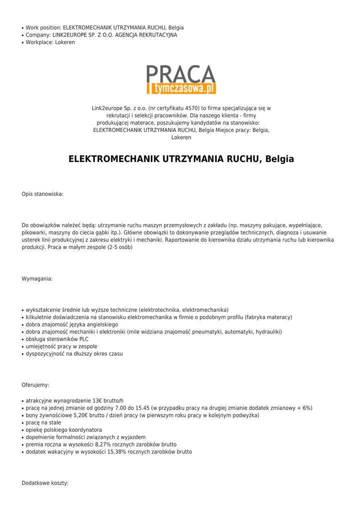 ● ● ● Work position: ELEKTROMECHANIK UTRZYMANIA RUCHU, Belgia Company: LINK2EUROPE SP. Z O.O. AGENCJA REKRUTACYJNA Workplace: Lokeren Link2europe Sp. z o.o. (nr certyfikatu 4570) to firma specjalizująca się w rekrutacji i selekcji pracowników. Dla naszego klienta - firmy produkującej materace, poszukujemy kandydatów na stanowisko: ELEKTROMECHANIK UTRZYMANIA RUCHU, Belgia Miejsce pracy: Belgia, Lokeren ELEKTROMECHANIK UTRZYMANIA RUCHU, Belgia Opis stanowiska: Do obowiązków należeć będą: utrzymanie ruchu maszyn przemysłowych z zakładu (np. maszyny pakujące, wypełniające, pikowarki, maszyny do ciecia gąbki itp.). Główne obowiązki to dokonywanie przeglądów technicznych, diagnoza i usuwanie usterek linii produkcyjnej z zakresu elektryki i mechaniki. Raportowanie do kierownika działu utrzymania ruchu lub kierownika produkcji. Praca w małym zespole (2-5 osób) Wymagania: ● ● ● ● ● ● ● wykształcenie średnie lub wyższe techniczne (elektrotechnika, elektromechanika) kilkuletnie doświadczenia na stanowisku elektromechanika w firmie o podobnym profilu (fabryka materacy) dobra znajomość języka angielskiego dobra znajomość mechaniki i elektroniki (mile widziana znajomość pneumatyki, automatyki, hydrauliki) obsługa sterowników PLC umiejętność pracy w zespole dyspozycyjność na dłuższy okres czasu Oferujemy: ● ● ● ● ● ● ● ● atrakcyjne wynagrodzenie 13€ brutto/h pracę na jednej zmianie od godziny 7.00 do 15.45 (w przypadku pracy na drugiej zmianie dodatek zmianowy + 6%) bony żywnościowe 5,20€ brutto / dzień pracy (w pierwszym roku pracy w kolejnym podwyżka) pracę na stałe opiekę polskiego koordynatora dopełnienie formalności związanych z wyjazdem premia roczna w wysokości 8,27% rocznych zarobków brutto dodatek wakacyjny w wysokości 15,38% rocznych zarobków brutto Dodatkowe koszty: ● ● zakwaterowanie: 80€ tygodniowo ubezpieczenie płatne przez pracownika około 7,5 € miesięcznie Informacje dodatkowe: Wszystkie zainteresowane osoby proszę o aplikowanie w języku polskim oraz angielskim (wraz ze zdjęciem, z dokładnym opisem obowiązków na każdym zajmowanym stanowisku) poprzez naszą stronę internetową: www.link2europe.pl Prosimy o umieszczenie w CV klauzuli o treści: "Zgodnie z ustawą z dnia 29 sierpnia 1997 r. o ochronie danych osobowych (Dz. U. nr 133 poz. 883, z póżn.zm.) niniejszym oświadczam, że wyrażam zgodę na przetwarzanie moich danych osobowych dla potrzeb niezbędnych do realizacji procesu rekrutacji prowadzonej obecnie oraz w przypadku nieskorzystania z mojej oferty dla celów niniejszej rekrutacji również w przyszłych procesach rekrutacji prowadzonych przez Link2europe Sp. z o.o” CV bez klauzuli nie będą brane pod uwagę! Polub nas na facebooku: http://www.facebook.com/Link2europe Aplikuj Dane kontaktowe: LINK2EUROPE SP. Z O.O. AGENCJA REKRUTACYJNA Send Save Print Tweet
