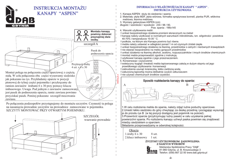 INFORMACJA O WŁAŚCIWOŚCIACH KANAPY “ ASPEN” . INSTRUKCJA UŻYTKOWANIA INSTRUKCJA MONTAŻU KANAPY “ASPEN” Montażu kanapy powinny dokonać przynajmiej dwie osoby. szczegół A Pasek do podnoszenia oparcia Montaż polega na połączeniu części oparciowej z częścią stałą. W celu połączenia obu części wysuwamy siedzisko jak pokazano na rys. Przykładamy oparcie w pozycji pionowej do tylnej części pojemnika i przykręcamy do ramion zawiasów śrubami 6 x 30 przy pomocy klucza imbusowego. Uwaga. Pod jednym z zawiasów zamocowany jest pasek do podnoszenia oparcia, ramie zawiasu powinno przyciskać pasek. Poniżej pokazano szczegół mocowania zawiasu. Po połączeniu podzespołów przystępujemy do montażu szczytów. Czynność ta polega na nasunięciu prowadnic szczytów na prowadnice zamocowane w pojemniku. SZCZYTY MONTOWAĆ PRZY OTWARTYM POJEMNIKU. SZCZEGÓŁ wsuwanie prowadnic WERSJA 4 Przykręcić śruby 4 szt. x 6 x 30 1. Kanapa ASPEN służy do siedzenia i spania. 2. Materiały: płyta MDF, płyta wiórowa, formatka sprężynowa bonnell, pianka PUR, włóknina meblowa, tkanina meblowa. 3. Wymiary gabarytowe ASPEN (cm) długość / szerokość / wysokość: 234 / 98 / 90, Pow. spania : 196x145 4. Warunki użytkowania mebli: 8unikać bezpośredniego działania promieni słonecznych na mebel 8kanapę należy użytkować w normalnych warunkach mikroklimatu, tzn. wilgotności powietrza o 40-70% i temperaturze 10-35 C. 8podłoże, na którym stoi Kanapa powinno być równe. 8meble należy ustawiać w odległości ponad 1 m od czynnych źródeł ciepła 8unikać bezpośredniego działania na tkaninę, przedmiotów o ostrych i nierównych krawędziach 8nie stawiać bezpośrednio na meblu gorących przedmiotów 8unikać działania na tkaninę alkoholi, acetonu, rozpuszczalników i innych środków chemicznych 8montaż mebla przeprowadzić zgodnie z instrukcją 8użytkować kanapę zgodnie z jego przeznaczeniem. 5. Konserwacja i czyszczenie: 8estetyczny wygląd i trwałość mebla tapicerowanego zależą w dużym stopniu od jego prawidłowego użytkowania i konserwacji 8zabrudzenia usunąć ściereczką, lekko zwilżoną wodą 8zakurzoną tapicerkę można delikatnie czyścić odkurzaczem 8nie używać chemicznych środków czystości. Sposób rozkładania kanapy do spania: B A 1.W celu rozłożenia mebla do spania, należy zdjąć luźne poduchy oparciowe. 2.Unieść lekko siedzisko do góry chwytając za deskę przednią i pociągając wysunąć je do przodu rys B (w tej pozycji dostępny jest pojemnik na pościel) . 3.Przewrócić oparcie (przytrzymując luźny pasek) w celu uzyskania pełnej powierzchni spania. Po rozłożeniu kanapy uchwyt paska powinien się znajdować miedzy siedziskiem a oparciem. Składanie przeprowadzamy w odwrotnej kolejności. Okucia 1.śruby 6 x 30 2.klucz imbusowy 8 szt. 1 szt. ŻYCZYMY UŻYTKOWNIKOM ZADOWOLENIA Z NASZYCH WYROBÓW Meblarska Spółdzielnia Pracy “DĄB” 81-960 Gdynia, ul. B. Krzywoustego 3 Telefon: (058) 667 22 00 www.dab.gdynia.pl -1- -2-