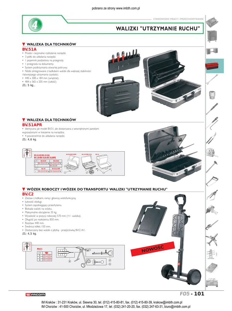 section 04PL_NOIR 28/02/05 14:59 Page 101 pobrano ze strony www.imbth.com.pl STANOWISKO PRACY I PRZECHOWYWANIE WALIZKI "UTRZYMANIE RUCHU" ▼ WALIZKA DLA TECHNIKÓW BV.51A • Proste i racjonalne rozłożenie narzędzi. • 3 półki do układania narzędzi. • 1 pojemnik podzielony na przegrody. • 1 przegroda na dokumenty. • System podtrzymania otwartej pokrywy. • Nóżki zintegrowane z kadłubem walizki dla większej stabilności i łatwiejszego utrzymania czystości. • 440 x 308 x 184 mm (wnętrze). • 484 x 365 x 205 mm (całość). D: 5 kg.. ▼ WALIZKA DLA TECHNIKÓW BV.51APR • Identyczna jak model BV.51, ale dostarczana z wewnętrznymi panelami wyposażonymi w kieszenie na narzędzia. • 4 powierzchnie do układania narzędzi. D: 4,6 kg. 1 2 1 ▼ WÓZEK ROBOCZY I WÓZEK DO TRANSPORTU WALIZKI "UTRZYMANIE RUCHU" BV.C2 • Zestaw z kółkami, ramą i głowicą wielofunkcyjną. • Łatwość obsługi. • System zapobiegający przechylaniu. • Blokada walizki na wózku. • Maksymalne obciążenie: 35 kg. • Wysokość w pozycji roboczej: 570 mm (+/– walizka). • Długość po rozłożeniu: 850 mm. • Rozstaw: 440 mm. • Średnica kółek: 150 mm. • Dostarczony bez walizki z płytką - przejściówką BV.C1A1. D: 4,5 kg. OŚĆ NOW BV.C1 F 1 2 3 BV.C1SE1 BV.C1SE2 BV.C1SE3 3 2 1 Katalog elektroniczny na www.facom.com F05 - 101 IM Kraków : 31-231 Kraków, ul. Siewna 30, tel. (012) 415-80-81, fax. (012) 415-80-39, [email protected] IM Chorzów : 41-500 Chorzów, ul. Młodzieżowa 17, tel. (032) 241-20-20, fax. (032) 247-63-31, [email protected]