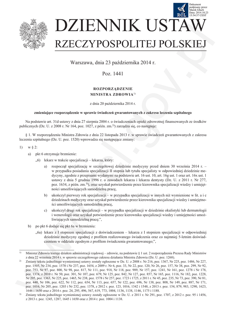 Dokument podpisany przez Marek Głuch Data: 2014.10.23 15:54:57 CEST DZIENNIK USTAW v.p l RZECZYPOSPOLITEJ POLSKIEJ Warszawa, dnia 23 października 2014 r. Poz. 1441 Rozporządzenie Ministra Zdrowia 1) .go z dnia 20 października 2014 r. zmieniające rozporządzenie w sprawie świadczeń gwarantowanych z zakresu leczenia szpitalnego Na podstawie art. 31d ustawy z dnia 27 sierpnia 2004 r. o świadczeniach opieki zdrowotnej finansowanych ze środków publicznych (Dz. U. z 2008 r. Nr 164, poz. 1027, z późn. zm.2)) zarządza się, co następuje: § 1. W rozporządzeniu Ministra Zdrowia z dnia 22 listopada 2013 r. w sprawie świadczeń gwarantowanych z zakresu leczenia szpitalnego (Dz. U. poz. 1520) wprowadza się następujące zmiany: 1) w § 2: a) pkt 6 otrzymuje brzmienie: w. rcl „6) lekarz w trakcie specjalizacji – lekarza, który: a)rozpoczął specjalizację w szczegółowej dziedzinie medycyny przed dniem 30 września 2014 r. – w przypadku posiadania specjalizacji II stopnia lub tytułu specjalisty w odpowiedniej dziedzinie medycyny, zgodnie z przepisami wydanymi na podstawie art. 16 ust. 10, art. 16g ust. 1 oraz art. 16x ust. 1 ustawy z dnia 5 grudnia 1996 r. o zawodach lekarza i lekarza dentysty (Dz. U. z 2011 r. Nr 277, poz. 1634, z późn. zm.3)), oraz uzyskał potwierdzenie przez kierownika specjalizacji wiedzy i umiejętności umożliwiających samodzielną pracę, b)ukończył pierwszy rok specjalizacji – w przypadku specjalizacji w innych niż wymienione w lit. a i c dziedzinach medycyny oraz uzyskał potwierdzenie przez kierownika specjalizacji wiedzy i umiejętności umożliwiających samodzielną pracę, c)ukończył drugi rok specjalizacji – w przypadku specjalizacji w dziedzinie okulistyki lub dermatologii i wenerologii oraz uzyskał potwierdzenie przez kierownika specjalizacji wiedzy i umiejętności umożliwiających samodzielną pracę;”, b) po pkt 6 dodaje się pkt 6a w brzmieniu: ww „6a)lekarz z I stopniem specjalizacji z doświadczeniem – lekarza z I stopniem specjalizacji w odpowiedniej dziedzinie medycyny zgodnej z profilem realizowanego świadczenia oraz co najmniej 5-letnim doświadczeniem w oddziale zgodnym z profilem świadczenia gwarantowanego;”, Minister Zdrowia kieruje działem administracji rządowej – zdrowie, na podstawie § 1 ust. 2 rozporządzenia Prezesa Rady Ministrów z dnia 22 września 2014 r. w sprawie szczegółowego zakresu działania Ministra Zdrowia (Dz. U. poz. 1268). 2) Zmiany tekstu jednolitego wymienionej ustawy zostały ogłoszone w Dz. U. z 2008 r. Nr 216, poz. 1367, Nr 225, poz. 1486, Nr 227, poz. 1505, Nr 234, poz. 1570 i Nr 237, poz. 1654, z 2009 r. Nr 6, poz. 33, Nr 22, poz. 120, Nr 26, poz. 157, Nr 38, poz. 299, Nr 92, poz. 753, Nr 97, poz. 800, Nr 98, poz. 817, Nr 111, poz. 918, Nr 118, poz. 989, Nr 157, poz. 1241, Nr 161, poz. 1278 i Nr 178, poz. 1374, z 2010 r. Nr 50, poz. 301, Nr 107, poz. 679, Nr 125, poz. 842, Nr 127, poz. 857, Nr 165, poz. 1116, Nr 182, poz. 1228, Nr 205, poz. 1363, Nr 225, poz. 1465, Nr 238, poz. 1578 i Nr 257, poz. 1723 i 1725, z 2011 r. Nr 45, poz. 235, Nr 73, poz. 390, Nr 81, poz. 440, Nr 106, poz. 622, Nr 112, poz. 654, Nr 113, poz. 657, Nr 122, poz. 696, Nr 138, poz. 808, Nr 149, poz. 887, Nr 171, poz. 1016, Nr 205, poz. 1203 i Nr 232, poz. 1378, z 2012 r. poz. 123, 1016, 1342 i 1548, z 2013 r. poz. 154, 879, 983, 1290, 1623, 1646 i 1650 oraz z 2014 r. poz. 24, 295, 496, 567, 619, 773, 1004, 1136, 1138, 1146, 1175 i 1188. 3) Zmiany tekstu jednolitego wymienionej ustawy zostały ogłoszone w Dz. U. z 2011 r. Nr 291, poz. 1707, z 2012 r. poz. 95 i 1456, z 2013 r. poz. 1245, 1287, 1645 i 1650 oraz z 2014 r. poz. 1004 i 1138. 1) Dziennik Ustaw –2– Poz. 1441 c) po pkt 13 dodaje się pkt 14 w brzmieniu: 2) v.p l „14)psychoonkolog – osobę z wykształceniem psychologicznym lub medycznym, która ukończyła studia wyższe i uzyskała tytuł magistra lub równorzędny oraz ukończyła studia podyplomowe z psychoonkologii.”; po § 4 dodaje się § 4a w brzmieniu: „§ 4a. 1. Świadczeniodawca udzielający świadczeń gwarantowanych, w trybie hospitalizacji i hospitalizacji planowej, realizujący leczenie onkologiczne, o którym mowa w art. 32a ustawy, oraz na warunkach określonych w załączniku nr 3 do rozporządzenia, powinien spełniać następujące warunki: 1) posiadać procedurę postępowania i organizacji udzielania świadczeń zapewniającą: a)wyodrębnienie planującego i koordynującego proces leczenia wielodyscyplinarnego zespołu terapeutycznego składającego się co najmniej z lekarzy specjalistów w dziedzinie: –onkologii i hematologii dziecięcej – w przypadku leczenia dzieci albo hematologii – w przypadku leczenia nowotworów układu krwiotwórczego lub układu chłonnego, albo onkologii klinicznej – w pozostałych przypadkach, .go –radioterapii lub radioterapii onkologicznej albo medycyny nuklearnej – w przypadku nowotworów leczonych z wykorzystaniem medycyny nuklearnej, –chirurgii onkologicznej albo ogólnej, albo w innej dziedzinie zabiegowej odpowiedniej dla danego rodzaju lub umiejscowienia nowotworu (nie dotyczy nowotworów układu krwiotwórczego lub układu chłonnego), w przypadku leczenia dzieci – chirurgii dziecięcej, – rentgenodiagnostyki lub radiologii, lub radiodiagnostyki, lub radiologii i diagnostyki obrazowej, b)określenie sposobu postępowania terapeutycznego przez zespół, o którym mowa w lit. a, i podjęcie leczenia w terminie nie dłuższym niż 14 dni od dnia umieszczenia świadczeniobiorcy na liście oczekujących na udzielenie świadczenia, w. rcl c)wyznaczenie koordynatora, po określeniu sposobu postępowania terapeutycznego przez zespół, o którym mowa w lit. a, do którego zadań należy w szczególności udzielanie pacjentowi informacji o organizacji procesu leczenia oraz jego koordynacja, w tym zapewnienie współpracy między podmiotami w ramach kompleksowej opieki nad pacjentem; 2) zapewnić zaplanowanie 