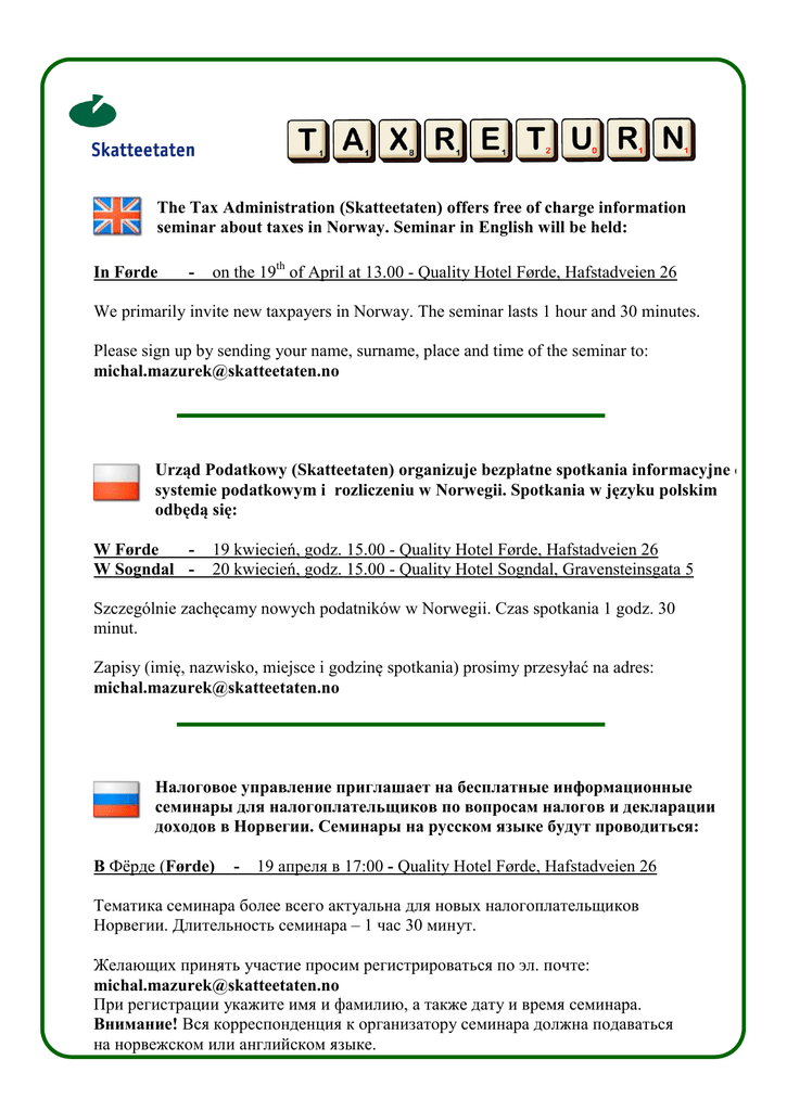 The Tax Administration (Skatteetaten) offers free of charge information seminar about taxes in Norway. Seminar in English will be held: In Førde - on the 19th of April at 13.00 - Quality Hotel Førde, Hafstadveien 26 We primarily invite new taxpayers in Norway. The seminar lasts 1 hour and 30 minutes. Please sign up by sending your name, surname, place and time of the seminar to: [email protected] Urząd Podatkowy (Skatteetaten) organizuje bezpłatne spotkania informacyjne o systemie podatkowym i rozliczeniu w Norwegii. Spotkania w języku polskim odbędą się: W Førde W Sogndal - 19 kwiecień, godz. 15.00 - Quality Hotel Førde, Hafstadveien 26 20 kwiecień, godz. 15.00 - Quality Hotel Sogndal, Gravensteinsgata 5 Szczególnie zachęcamy nowych podatników w Norwegii. Czas spotkania 1 godz. 30 minut. Zapisy (imię, nazwisko, miejsce i godzinę spotkania) prosimy przesyłać na adres: [email protected] Налоговое управление приглашает на бесплатные информационные семинары для налогоплательщиков по вопросам налогов и декларации доходов в Норвегии. Семинары на русском языке будут проводиться: В Фёрде (Førde) - 19 апреля в 17:00 - Quality Hotel Førde, Hafstadveien 26 Тематика семинара более всего актуальна для новых налогоплательщиков Норвегии. Длительность семинара – 1 час 30 минут. Желающих принять участие просим регистрироваться по эл. почте: [email protected] При регистрации укажите имя и фамилию, а также дату и время семинара. Внимание! Вся корреспонденция к организатору семинара должна подаваться на норвежском или английском языке.