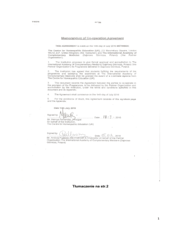 Tłumaczenie na str.2 1 Memorandum dotyczące umowy współpracy Umowa została sporządzona dnia 14 Lipca 2016 r miedzy: The Center for Homeopathic Education (UK) Bloomsbury Square, London WC1A2LP Wielka Brytania („Instytucja”) i Międzynarodowa Akademia Medycyny Komplementarnej (Dąbrowa Górnicza, Polska) („Organizacja Partnerska"). 1. Instytucja niniejszym formalnie zatwierdza i akredytuje Międzynarodową Akademię Medycyny Komplementarnej w Dąbrowie Górniczej, Polska (Organizacja Partnerska) program edukacyjny realizowany w Dąbrowie Górniczej, Polska. 2. Instytucja zgadza się udzielić prawo i przywilej do licencjackiego dyplomu The Center for Homeopathic Education (Wielka Brytania) studentom, którzy spełnią wszystkich wymagania programowe i egzaminatorów Międzynarodowej Akademii Medycyny Komplementarnej. 3. Ten dokument potwierdza umowę miedzy stronami dotyczącymi współpracy i wymagań programowych, zabezpieczonych przez Organizację Partnerską i akredytuje przez Instytucję zgodnie z warunkami wyszczególnionymi w tym dokumencie i jego Załączniku. 4. Umowa obowiązuje od dnia 14 lipca 2016 roku. 5. W celu uniknięcia wątpliwości podaje się, że Umowa zawiera stronę z podpisami i Załącznik. Dnia 14 lipca 2016 Podpisane przez Podpisane przez: Dzien 18-7-2016 Pan Marcus Fernandes Dyrektor W imieniu Instytucji The Center for Homeopathic Education (Wielka Brytania) Podpisane przez Dzien 15.07.2016 Pan Andrzej Podlasin, Przewodniczący i Kanclerz Organizacji Partnerskiej w imieniu Międzynarodowej Akademii Medycyny Komplementarnej ( Dąbrowa Górnicza, Polska) 2