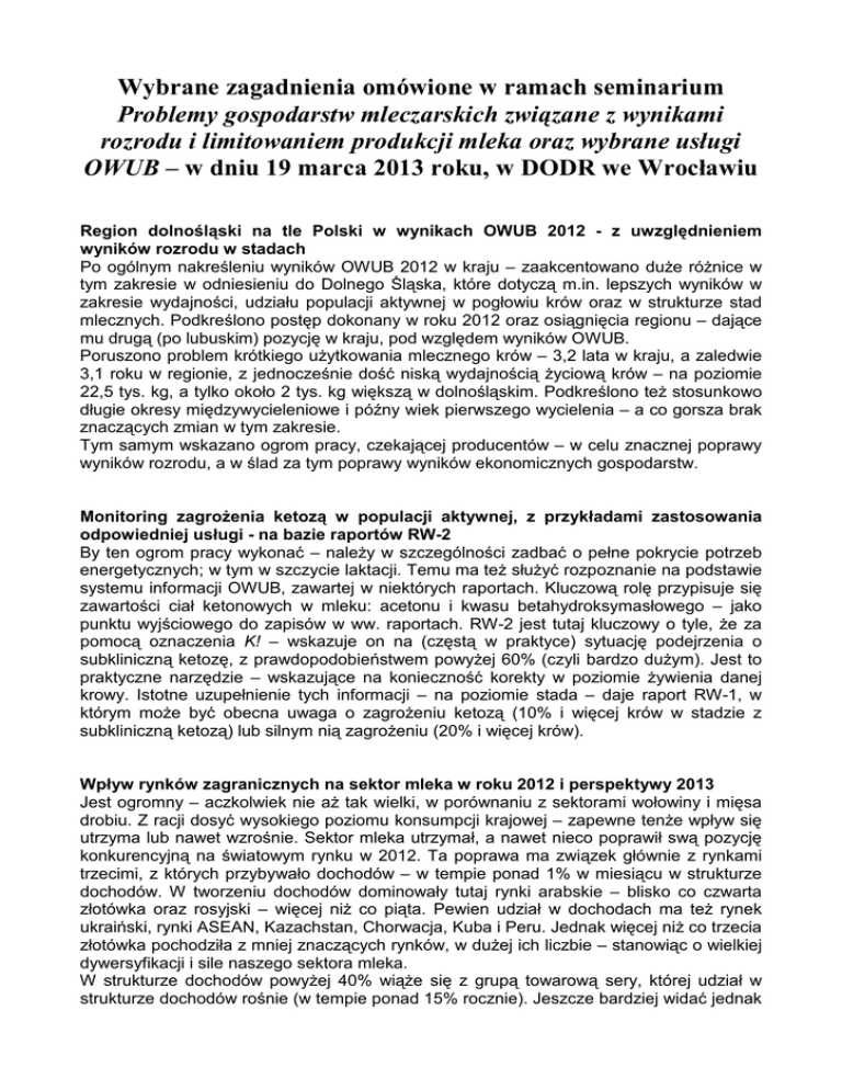 Wybrane zagadnienia omówione w ramach seminarium Problemy gospodarstw mleczarskich związane z wynikami rozrodu i limitowaniem produkcji mleka oraz wybrane usługi OWUB – w dniu 19 marca 2013 roku, w DODR we Wrocławiu Region dolnośląski na tle Polski w wynikach OWUB 2012 - z uwzględnieniem wyników rozrodu w stadach Po ogólnym nakreśleniu wyników OWUB 2012 w kraju – zaakcentowano duże różnice w tym zakresie w odniesieniu do Dolnego Śląska, które dotyczą m.in. lepszych wyników w zakresie wydajności, udziału populacji aktywnej w pogłowiu krów oraz w strukturze stad mlecznych. Podkreślono postęp dokonany w roku 2012 oraz osiągnięcia regionu – dające mu drugą (po lubuskim) pozycję w kraju, pod względem wyników OWUB. Poruszono problem krótkiego użytkowania mlecznego krów – 3,2 lata w kraju, a zaledwie 3,1 roku w regionie, z jednocześnie dość niską wydajnością życiową krów – na poziomie 22,5 tys. kg, a tylko około 2 tys. kg większą w dolnośląskim. Podkreślono też stosunkowo długie okresy międzywycieleniowe i późny wiek pierwszego wycielenia – a co gorsza brak znaczących zmian w tym zakresie. Tym samym wskazano ogrom pracy, czekającej producentów – w celu znacznej poprawy wyników rozrodu, a w ślad za tym poprawy wyników ekonomicznych gospodarstw. Monitoring zagrożenia ketozą w populacji aktywnej, z przykładami zastosowania odpowiedniej usługi - na bazie raportów RW-2 By ten ogrom pracy wykonać – należy w szczególności zadbać o pełne pokrycie potrzeb energetycznych; w tym w szczycie laktacji. Temu ma też służyć rozpoznanie na podstawie systemu informacji OWUB, zawartej w niektórych raportach. Kluczową rolę przypisuje się zawartości ciał ketonowych w mleku: acetonu i kwasu betahydroksymasłowego – jako punktu wyjściowego do zapisów w ww. raportach. RW-2 jest tutaj kluczowy o tyle, że za pomocą oznaczenia K! – wskazuje on na (częstą w praktyce) sytuację podejrzenia o subkliniczną ketozę, z prawdopodobieństwem powyżej 60% (czyli bardzo dużym). Jest to praktyczne narzędzie – wskazujące na konieczność korekty w poziomie żywienia danej krowy. Istotne uzupełnienie tych informacji – na poziomie stada – daje raport RW-1, w którym może być obecna uwaga o zagrożeniu ketozą (10% i więcej krów w stadzie z subkliniczną ketozą) lub silnym nią zagrożeniu (20% i więcej krów). Wpływ rynków zagranicznych na sektor mleka w roku 2012 i perspektywy 2013 Jest ogromny – aczkolwiek nie aż tak wielki, w porównaniu z sektorami wołowiny i mięsa drobiu. Z racji dosyć wysokiego poziomu konsumpcji krajowej – zapewne tenże wpływ się utrzyma lub nawet wzrośnie. Sektor mleka utrzymał, a nawet nieco poprawił swą pozycję konkurencyjną na światowym rynku w 2012. Ta poprawa ma związek głównie z rynkami trzecimi, z których przybywało dochodów – w tempie ponad 1% w miesiącu w strukturze dochodów. W tworzeniu dochodów dominowały tutaj rynki arabskie – blisko co czwarta złotówka oraz rosyjski – więcej niż co piąta. Pewien udział w dochodach ma też rynek ukraiński, rynki ASEAN, Kazachstan, Chorwacja, Kuba i Peru. Jednak więcej niż co trzecia złotówka pochodziła z mniej znaczących rynków, w dużej ich liczbie – stanowiąc o wielkiej dywersyfikacji i sile naszego sektora mleka. W strukturze dochodów powyżej 40% wiąże się z grupą towarową sery, której udział w strukturze dochodów rośnie (w tempie ponad 15% rocznie). Jeszcze bardziej widać jednak wzrost po stronie serwatki (ponad 27%). Inne grupy towarowe bardzo tracą na znaczeniu – przy czym prawidłowości ww. widać zwłaszcza w odniesieniu do rynków trzecich. Na tym tle podkreślono wielką rolę promocji naszych produktów mlecznych – prezentując zestawienie targów międzynarodowych w krajach pozaeuropejskich, w których producenci polscy powinni uczestniczyć – na okres od II do IV kwartału 2013 roku. Dolnośląski sektor mleka w roku kwotowym 2012/13 - wpływ limitowania produkcji Przypomniano historię – w sensie wysokości limitu; w tym podkreślono zmiany – w postaci większych limitów w miarę upływu okresu funkcjonowania SKM-u. Podkreślono kwestię zapobiegania nadprodukcji (i niższym cenom surowca), ale jednocześnie zwiększania możliwości produkcyjnych – znacznie powyżej 10% od początku funkcjonowania systemu. 1109 dostawców hurtowych na Dolnym Śląsku dysponuje 161,6 tys. kg – to stan na dzień 25 lutego 2013. Od początku integracji ubyło 58% dostawców hurtowych. 144,39 tys. kg – to aktualna średnia dolnośląska wysokość limitu na 1 dostawcę. O blisko ¾ (nawet więcej) spadła w okresie od integracji liczba dostawców bezpośrednich. Zagrożenie przekroczeniem limitu w b.r. kwotowym – na Dolnym Śląsku o tyle nie istnieje, że po 10 miesiącach wykorzystanie limitów było znacznie poniżej 90%; jednak transfery czynią sytuację nie tak wcale jasną. Zakres transferów w kraju (stan na 15 marca) wyniósł 0,22mld kg w postaci zbycia i 0,15mld kg w formie oddania w używanie, a do tego 0,07mld kg w postaci konwersji. Przedmiotem rozważań była też rezerwa krajowa i praktyka w tym zakresie, ale też i to że rezerwa nie była mogła zaspokoić potrzeb rosnącej produkcji – w zakresie około 0,15mld kg. Na Dolnym Śląsku funkcjonuje obecnie 8 podmiotów skupujących mleko (czyli najmniej obok opolskiego); w tym 3 spółdzielcze. Uzupełnia je aż 21 podmiotów pozadolnośląskich, które dysponują blisko ¾ kwot i to one stanowią o kształcie dolnośląskiego sektora mleka. Dolny Śląsk wyróżnia szczególna dynamika restrukturyzacyjna – mająca związek z SKMem. Po styczniu 2013 roku mieliśmy w regionie 150 producentów zagrożonych przekroczeniem limitu w b.r. kwotowym – niemniej po zakończeniu sezonu transferowego ta liczba może się znacząco zmniejszyć. Podsumowując – pewien wpływ limitowania na wielkość prod
