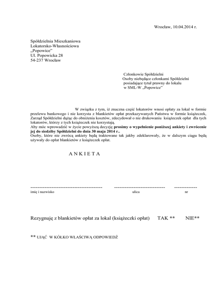 Wrocław, 10.04.2014 r. Spółdzielnia Mieszkaniowa Lokatorsko-Własnościowa „Popowice” Ul. Popowicka 28 54-237 Wrocław Członkowie Spółdzielni Osoby niebędące członkami Spółdzielni posiadające tytuł prawny do lokalu w SML-W „Popowice” W związku z tym, iż znaczna część lokatorów wnosi opłaty za lokal w formie przelewu bankowego i nie korzysta z blankietów opłat przekazywanych Państwu w formie książeczek, Zarząd Spółdzielni dążąc do obniżenia kosztów, zdecydował o nie drukowaniu książeczek opłat dla tych lokatorów, którzy z tych książeczek nie korzystają. Aby móc wprowadzić w życie powyższą decyzję prosimy o wypełnienie poniższej ankiety i zwrócenie jej do siedziby Spółdzielni do dnia 30 maja 2014 r.. Osoby, które nie zwrócą ankiety będą traktowane tak jakby zdeklarowały, że w dalszym ciągu będą używały do opłat blankietów z książeczek opłat. ANKIETA ----------------------------------------- ----------------------------- imię i nazwisko Rezygnuję z blankietów opłat za lokal (książeczki opłat) ** UJĄĆ W KÓŁKO WŁAŚCIWĄ ODPOWIEDŹ ------------- ulica nr TAK ** NIE**