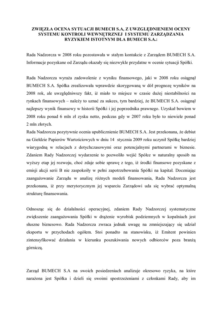 ZWIĘZŁA OCENA SYTUACJI BUMECH S.A, Z UWZGLĘDNIENIEM OCENY SYSTEMU KONTROLI WEWNĘTRZNEJ I SYSTEMU ZARZĄDZANIA RYZYKIEM ISTOTNYM DLA BUMECH S.A.: Rada Nadzorcza w 2008 roku pozostawała w stałym kontakcie z Zarządem BUMECH S.A. Informacje pozyskane od Zarządu okazały się niezwykle przydatne w ocenie sytuacji Spółki. Rada Nadzorcza wyraża zadowolenie z wyniku finansowego, jaki w 2008 roku osiągnął BUMECH S.A. Spółka zrealizowała wprawdzie skorygowaną w dół prognozę wyników na 2008 rok, ale uwzględniwszy fakt, iż miało to miejsce w czasie dużej niestabilności na rynkach finansowych – należy to uznać za sukces, tym bardziej, że BUMECH S.A. osiągnął najlepszy wynik finansowy w historii Spółki i jej poprzednika prawnego. Uzyskał bowiem w 2008 roku ponad 6 mln zł zysku netto, podczas gdy w 2007 roku było to niewiele ponad 2 mln złotych. Rada Nadzorcza pozytywnie ocenia upublicznienie BUMECH S.A. Jest przekonana, że debiut na Giełdzie Papierów Wartościowych w dniu 14 stycznia 2009 roku uczynił Spółkę bardziej wiarygodną w relacjach z dotychczasowymi oraz potencjalnymi partnerami w biznesie. Zdaniem Rady Nadzorczej wydarzenie to pozwoliło wejść Spółce w naturalny sposób na wyższy etap jej rozwoju, choć zdaje sobie sprawę z tego, iż środki finansowe pozyskane z emisji akcji serii B nie zaspokoiły w pełni zapotrzebowania Spółki na kapitał. Doceniając zaangażowanie Zarządu w analizę różnych modeli finansowania, Rada Nadzorcza jest przekonana, iż przy merytorycznym jej wsparciu Zarządowi uda się wybrać optymalną strukturę finansowania. Odnosząc się do działalności operacyjnej, zdaniem Rady Nadzorczej systematyczne zwiększenie zaangażowania Spółki w drążenie wyrobisk podziemnych w kopalniach jest słuszne biznesowo. Rada Nadzorcza zwraca jednak uwagę na zmniejszający się udział eksportu w przychodach ogółem. Stoi ponadto na stanowisku, iż Emitent powinien zintensyfikować działania w kierunku poszukiwania nowych odbiorców poza branżą górniczą. Zarząd BUMECH S.A na swoich posiedzeniach analizuje okresowo ryzyka, na które narażona jest Spółka i dzieli się swoimi spostrzeżeniami z członkami Rady, aby im przeciwdziałać. Przedmiotem analizy najczęściej są następujące ryzyka: kredytowe (wynikające z utraty zdolności kredytowej dłużników – odbiorców); otoczenia (związane ze zmianami sytuacji gospodarczej, zmianami na rynkach zbytu i zaopatrzenia, działaniami konkurencji) oraz płynności. Emitent stosuje systemy kontroli wewnętrznej w zakresie prowadzenia rachunkowości i sprawozdawczości finansowej, które zapewniają rzetelne i jasne przedstawienie jej sytuacji majątkowej i finansowej. Spółka posiada dokumentację opisującą przyjęte zasady rachunkowości, określające metody wyceny aktywów i pasywów oraz ustalenia wyniku finansowego, a także sposób prowadzenia ksiąg rachunkowych i systemu ochrony danych i ich zbiorów. Sprawozdania finansowe Emitenta są poddawane badaniu przez podmiot uprawniony, wybrany uchwałą Rady Nadzorczej. BUMECH S.A. prowadzi księgi rachunkowe w systemie informatycznym, który posiada zabezpieczenia hasłowe przed dostępem osób nieuprawnionych oraz funkcyjne ograniczenia dostępu. Funkcjonowanie BUMECH S.A. opiera się na zarządzaniu procesowym wynikającym z potwierdzonego przez zewnętrzną jednostkę certyfikującą DET NORSKE VERITAS systemu zarządzania jakością ISO 9001:2000 w zakresie: Remont, montaż i serwis maszyn górniczych oraz wykonawstwo ich elementów i części zamiennych. Wykonawstwo elementów konstrukcji. Ponadto w Spółce występuje sformalizowany tryb zawierania, ewidencjonowania przechowywania umów oraz przekazywania informacji. Na dzień sporządzenia niniejszego sprawozdania BUMECH SA. jest w wysoce zaawansowanej fazie wdrażania systemu budżetowania i controllingu. Rada bardzo pozytywnie ocenia ten proces, gdyż usprawni to w dużej mierze kontrolę kosztów i przychodów.