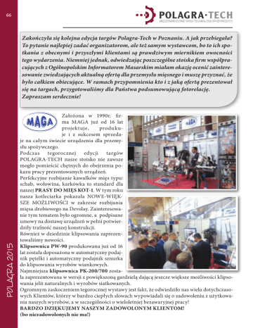 66 Polagra 2015 Zakończyła się kolejna edycja targów Polagra-Tech w Poznaniu. A jak przebiegała? To pytanie najlepiej zadać organizatorom, ale też samym wystawcom, bo to ich spotkania z obecnymi i przyszłymi klientami są prawdziwym miernikiem owocności tego wydarzenia. Niemniej jednak, odwiedzając poszczególne stoiska firm współpracujących z Ogólnopolskim Informatorem Masarskim miałam okazję ocenić zainteresowanie zwiedzających aktualną ofertą dla przemysłu mięsnego i muszę przyznać, że było całkiem obiecujące. W ramach przypomnienia kto i z jaką ofertą prezentował się na targach, przygotowaliśmy dla Państwa podsumowującą fotorelację. Zapraszam serdecznie! Założona w 1990r. firma MAGA już od 16 lat projektuje, produkuje i z sukcesem sprzedaje na całym świecie urządzenia dla przemysłu spożywczego. Podczas tegorocznej edycji targów POLAGRA-TECH nasze stoisko nie zawsze mogło pomieścić chętnych do obejrzenia pokazu pracy prezentowanych urządzeń. Perfekcyjne rozbijanie kawałków mięs typu: schab, wołowina, karkówka to standard dla naszej PRASY DO MIĘS KOT-1. W tym roku nasza kotleciarka pokazała NOWE-WIĘKSZE MOŻLIWOŚCI w zakresie rozbijania mięsa drobiowego na Devolay. Zainteresowanie tym tematem było ogromne, a podpisane umowy na dostawę urządzeń w pełni potwierdziły trafność naszej konstrukcji. Również w dziedzinie klipsowania zaprezentowaliśmy nowości. Klipsownica PW-90 produkowana już od 16 lat została doposażona w automatyczny podajnik pętelki i automatyczny podajnik sznurka do klipsowania wyrobów wiankowych. Najmniejsza klipsownica PK-200/700 została zaprezentowana w wersji z powiększoną gardzielą dającą jeszcze większe możliwości klipsowania jelit naturalnych i wyrobów siatkowanych. Ogromnym zaskoczeniem tegorocznej wystawy jest fakt, że odwiedziło nas wielu dotychczasowych Klientów, którzy w bardzo ciepłych słowach wypowiadali się o zadowoleniu z użytkowania naszych wyrobów, a w szczególności o wieloletniej bezawaryjnej pracy! BARDZO DZIĘKUJEMY NASZYM ZADOWOLONYM KLIENTOM! (bo niezadowolonych nie ma!) 67 Firma Inwestpol-Consulting istnieje na rynku od 1992 roku. Działalność Firmy obejmuje produkcję i sprzedaż urządzeń dla przemysłu spożywczego, ze szczególnym uwzględnieniem przetwórstwa mięsnego. Wyposażamy małe i średnie przedsiębiorstwa we wszelkie niezbędne urządzenia potrzebne do produkcji produktów mięsnych. Nasze urządzenia pracują na całym świecie, między innymi w Rosji, Białorusi, Ukrainie, Kazachstanie, Meksyku, Chile, Republice Dominikany, Japonii, Chinach i na terenie UE. Nasza produkcja obejmuje: • Masownice o pojemności od 40 l. do 1500 l. z chłodzeniem lub bez chłodzenia, • Nastrzykiwarki - ręczne, półautomatyczne i z serwo-napędem, • Mieszalniki o pojemności od 30 l. do 1000 l. - z mieszadłami łopatkowymi lub spiralnymi, • Wilki – modele: standardowy i kątowy, • Komory wędzarnicze, • Urządzenia higieniczno-sanitarne – stacje higieny, myjki i suszarki butów, sterylizatory, etc. Oprócz urządzeń, oferujemy również całą gamę akcesoriów, takich jak: wózki, noże, fartuchy ochronne, termometry, klipsy, dodatki do żywności i wiele innych. Maszyny i urządzenia prezentowane na targach POLAGRA-TECH 2015: NOWOŚĆ - Komora KW 2, NOWOŚĆ - Wilk PK 160, ponadto: Mieszalnik PW 160, Masownica MAL 40, Nastrzykiwarka AN 20, Nastrzykiwarka AN 31, Filtr solanki FS, Mieszalnik solanki SP, Wilk PK 130, Wilk PK 82, Urządzenie do Czyszczenia Igieł UDCI, Mieszalnik PW 90. Polagra 2015 Firma P.P.U.H. Karpowicz zajmuje się produkcją maszyn i urządzeń dla przetwórstwa mięsnego od 1990 r. Zaopatrujemy naszych klientów w nowoczesne urządzenia po przystępnych cenach. Produkujemy nastrzykiwarki, masownice próżniowe, kotły warzelne, mieszalniki solanki, myjki pojemników oraz wózków, wytwornice lodu łuskowego, transportery, dozowniki farszu, itp. Podczas tegorocznych targów Polagra-Tech zaprezentowaliśmy kilka nowych urządzeń, m. in.: 1. Opatentowana przez naszą firmę - Masownica próżniowa, wielokomorowa typ: MK-4x40PC, przeznaczona do prób laboratoryjnych. Klapy komór masujących wyposażone są w wzierniki, umożliwiające podgląd masowanego w próżni wsadu, bez konieczności przerywania procesu i otwierania pokrywy. 2. Masownica garmażeryjna typ: MKLg-70, o pojemności bębna V=70 l. Wymienne łopaty Polagra 2015 68 masujące umożliwiają szerokie zastosowanie urządzenia. 3. Masownica ze skośnie leżącym bębnem masującym typ: MKL. Boczna klapa umożliwia załadunek wsadu np. bezpośrednio z nastrzykiwarki. 4. Zmodernizowane Nastrzykiwarki typ: NK,NK-K i NK-s znacznie poprawiają proces nastrzyku w stosunku do konstrukcji starszego typu lub nastrzykiwarek innych producentów. Prezentowaliśmy także opatentowane technologie odzysku pełnowartościowego białka z porozbiorowych kości drobiowych i wieprzowych. Firma Walowsky Kraków jest obecna na rynku usług w zakresie przetwórstwa mięsnego od 1990 roku. Od początku swojego istnienia specjalizuje się w dostawie maszyn i urządzeń do przetwórstwa mięsnego, między innymi takich jak nadziewarki, kutry, klipsownice, nastrzykiwarki, pakowaczki, komory wędzarnicze i inne. Długoletnia obecność w branży i zdobyte doświadczenie sprawiają, że przedstawiciele firmy Walowsky Kraków, oprócz oferowania maszyn i urządzeń, są w stanie kompletnie doradzić potencjalnemu klientowi w wyborze rozwiązań sprzętowych najlepiej dostosowanych do specyfiki jego zakładu. Firma, realizując koncepcję trwałej obecności na rynku, w miarę rozszerzenia się palety oferowanych maszyn i urządzeń, nieustannie rozwija i doskonali świadczony serwis gwarancyjny i pogwarancyjny. W związku z tym w strategii działania firmy wiele uwagi poświęca się doskonaleniu zawodowemu pracowników serwisu, którzy systematycznie podnoszą i uzupełniają swo