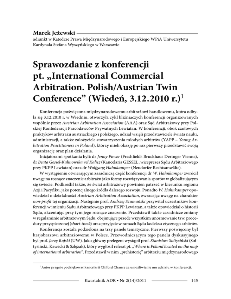 Marek Jeżewski adiunkt w Katedrze Prawa Międzynarodowego i Europejskiego WPiA Uniwersytetu Kardynała Stefana Wyszyńskiego w Warszawie Sprawozdanie z konferencji pt. „International Commercial Arbitration. Polish/Austrian Twin Conference” (Wiedeń, 3.12.2010 r.)1 Konferencja poświęcona międzynarodowemu arbitrażowi handlowemu, która odbyła się 3.12.2010 r. w Wiedniu, otworzyła cykl bliźniaczych konferencji organizowanych wspólnie przez Austrian Arbitration Association (AAA) oraz Sąd Arbitrażowy przy Polskiej Konfederacji Pracodawców Prywatnych Lewiatan. W konferencji, obok czołowych praktyków arbitrażu austriackiego i polskiego, udział wzięli przedstawiciele świata nauki, administracji, a także założyciele stowarzyszenia młodych arbitrów (YAPP – Young Arbitration Practitioners in Poland), którzy mieli okazję po raz pierwszy przedstawić swoją organizację oraz plan działania. Inicjatorami spotkania byli: dr Jenny Power (Freshfields Bruckhaus Deringer Vienna), dr Beata Gessel-Kalinowska vel Kalisz (Kancelaria GESSEL, wiceprezes Sądu Arbitrażowego przy PKPP Lewiatan) oraz dr Wolfgang Hahnkamper (Neudorfer Rechtsanwälte). W wystąpieniu otwierającym zasadniczą część konferencji dr W. Hahnkamper zwrócił uwagę na rosnące znaczenie arbitrażu jako formy rozwiązywania sporów w globalizującym się świecie. Podkreślił także, że świat arbitrażowy powinien patrzeć w kierunku regionu Azji i Pacyfiku, jako potencjalnego źródła dalszego rozwoju. Ponadto W. Hahnkamper opowiedział o działalności Austrian Arbitration Association, zwracając uwagę na charakter non-profit tej organizacji. Następnie prof. Andrzej Szumański przywitał uczestników konferencji w imieniu Sądu Arbitrażowego przy PKPP Lewiatan, a także opowiedział o historii Sądu, akcentując przy tym jego rosnące znaczenie. Przedstawił także zasadnicze zmiany w regulaminie arbitrażowym Sądu, obejmujące przede wszystkim unormowanie tzw. procedury przyspieszonej (short-track) oraz przyjęcie w ramach Sądu kodeksu etycznego arbitrów. Konferencja została podzielona na trzy panele tematyczne. Pierwszy poświęcony był krajobrazowi arbitrażowemu w Polsce. Przewodniczącym tego panelu dyskusyjnego był prof. Jerzy Rajski (UW). Jako główny prelegent wystąpił prof. Stanisław Sołtysiński (Sołtysiński, Kawecki & Szlęzak), który wygłosił referat pt. „Where is Poland located on the map of international arbitration”. Przedstawił w nim „prehistorię” arbitrażu międzynarodowego 1 Autor pragnie podziękować kancelarii Clifford Chance za umożliwienie mu udziału w konferencji. Kwartalnik ADR • Nr 2(14)/2011 145 Jeżewski w Polsce i zwrócił uwagę, że Część piąta KPC, zawierająca regulację polskiego postępowania arbitrażowego, w 80% ma swoje źródło w prawie austriackim, natomiast w 20% w prawie niemieckim. Temat referatu stał się okazją do omówienia podstawowych cech polskiego arbitrażu, w tym reguł zapewniających równość stron czy dotyczących zdatności arbitrażowej. Profesor S. Sołtysiński poświęcił również kilka uwag arbitrażowi inwestycyjnemu, który odgrywa coraz większą rolę w polskiej praktyce arbitrażowej. Prelegent zawarł w swoim wystąpieniu szereg uwag krytycznych pod adresem tej formy arbitrażu zwracając uwagę, że wbrew pierwotnej idei, nie tworzy ona równych szans inwestycyjnych, przyczynia się natomiast do dyskryminacji państw przyjmujących inwestycję. Kolejnym prelegentem w pierwszym panelu była dr Beata Gessel-Kalinowska vel Kalisz, która przedstawiła historyczny rozwój Sądu Arbitrażowego przy PKPP Lewiatan. W ujęciu statystycznym rozwój ten polega przede wszystkim na geometrycznym przyroście spraw, zarówno skierowanych do Sądu (46 spraw), jak i zakończonych wyrokiem arbitrażowym (18 wyroków). Jeśli chodzi o średnią wartość sporu, to sięga ona kwoty 1,5 mln zł. Referentka zwróciła także uwagę na zaangażowanie Sądu w promocję arbitrażu jako najbardziej przychylnej przedsiębiorcom metody rozwiązywania sporów. Podkreśliła też, że liczne wydarzenia związane z arbitrażem organizowane przez Sąd cieszą się dużą popularnością. Sąd może się pochwalić m.in. organizacją międzynarodowej konferencji pt. „Dispute Resolution in M&A Transactions: Tactics, Challenges, Defences”, a także rozpoczęciem cyklu Warsztatów Arbitrażowych dla Pełnomocników we współpracy z londyńskim Chartered Institute of Arbitrators. Kolejna część pierwszego panelu była poświęcona zagadnieniu dominacji mężczyzn w świecie arbitrażu i przyczynom takiego zjawiska. W tej sesji udział wzięli: r. pr. Monika Hartung (Wardyński & Wspólnicy), adw. Mirèze Philippe (Międzynarodowa Izba Handlowa w Paryżu) oraz Krzysztof Stefanowicz (Salans). Uczestnicy zwrócili uwagę, że natura arbitrażu, jako polubownej metody rozwiązywania sporów mogłaby w większym stopniu uwzględniać czynnik feministyczny. Niedostatkom w tym zakresie miałaby zaradzić organizacja ArbitralWomen, w której działalność zaangażowane są obie współorganizujące konferencję instytucje. Następnie dr Rafał Morek (K&L Gates) zaprezentował jedną z najcenniejszych inicjatyw Sądu Arbitrażowego przy PKPP Lewiatan, tj. e-Przegląd Arbitrażowy, wydawany jako kwartalnik w językach polskim i angielskim. Jako dodatkowe zalety e-Lewiatana wymienił jego elektroniczny charakter, zapewniający szerszy dostęp, a tym samym większą promocję Sądu i arbitrażu. Bardzo ciekawe było wystąpienie prof. Gerharda Wegena (Gleiss Lutz), który temat miejsca Polski na mapie arbitrażowej przedstawił z perspektywy niemieckiej. Prelegent przychylnie odniósł się do oparcia polskiego prawa arbitrażowego na modelu UNCITRAL z 1985 r. Ponadto zwrócił także uwagę na rosnące znaczenie Polski jako coraz istotniejszego punktu na mapie arbitrażu międzynarodowego. Pierwszy panel został podsumowany