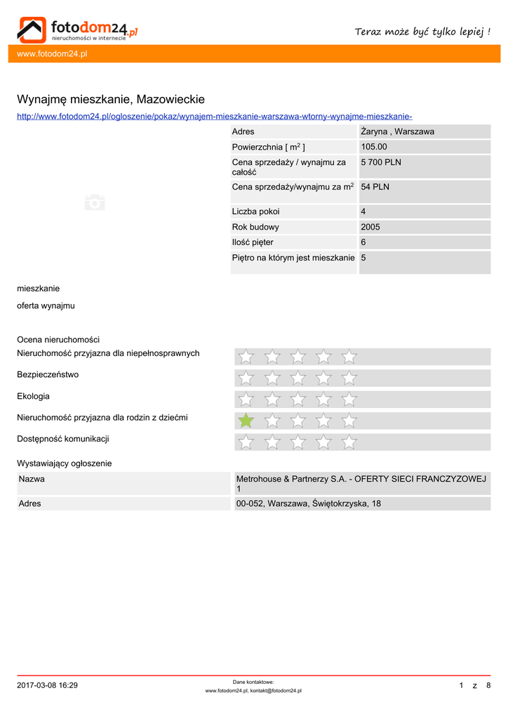 Teraz może być tylko lepiej ! www.fotodom24.pl Wynajmę mieszkanie, Mazowieckie http://www.fotodom24.pl/ogloszenie/pokaz/wynajem-mieszkanie-warszawa-wtorny-wynajme-mieszkanieAdres Żaryna , Warszawa Powierzchnia [ m2 ] 105.00 Cena sprzedaży / wynajmu za całość 5 700 PLN Cena sprzedaży/wynajmu za m2 54 PLN Liczba pokoi 4 Rok budowy 2005 Ilość pięter 6 Piętro na którym jest mieszkanie 5 mieszkanie oferta wynajmu Ocena nieruchomości Nieruchomość przyjazna dla niepełnosprawnych Bezpieczeństwo Ekologia Nieruchomość przyjazna dla rodzin z dziećmi Dostępność komunikacji Wystawiający ogłoszenie Nazwa Metrohouse & Partnerzy S.A. - OFERTY SIECI FRANCZYZOWEJ 1 Adres 00-052, Warszawa, Świętokrzyska, 18 2017-03-08 16:29 Dane kontaktowe: www.fotodom24.pl, [email protected] 1 z 8 Teraz może być tylko lepiej ! www.fotodom24.pl Lokalizacja Adres Województwo mazowieckie Miejscowość Warszawa Dzielnica Warszawa Ulica Żaryna 2017-03-08 16:29 Dane kontaktowe: www.fotodom24.pl, [email protected] 2 z 8 Teraz może być tylko lepiej ! www.fotodom24.pl Parametry Media Internet (stałe łącze) TAK Dane szczegółowe Powierzchnia całkowita [ m2 ] 105 Wysokość pomieszczeń [cm] 290 Liczba pokoi 4 Liczba pięter 6 Piętro 5 Rok budowy 2005 Balkon NIE Taras NIE Piwnica NIE Umeblowanie pełne Liczba poziomów jeden poziom 2017-03-08 16:29 Dane kontaktowe: www.fotodom24.pl, [email protected] 3 z 8 Teraz może być tylko lepiej ! www.fotodom24.pl Udogodnienia Bezpieczeństwo Ochrona na osiedlu TAK Dla rodziń z dziećmi Pomieszczenie na wózki 2017-03-08 16:29 TAK Dane kontaktowe: www.fotodom24.pl, [email protected] 4 z 8 Teraz może być tylko lepiej ! www.fotodom24.pl Opłaty Cena wynajmu Opłata dla wynajmującego 5 700 PLN (do negocjacji) NIE 2017-03-08 16:29 Dane kontaktowe: www.fotodom24.pl, [email protected] 5 z 8 Teraz może być tylko lepiej ! www.fotodom24.pl Opis Do wynajęcia piękny, czteropokojowy apartament zlokalizowany na prestiżowym osiedlu EKO-Park Quatro. Apartament o wysokim standardzie wykończenia i w pełni umeblowany. Główne atuty nieruchomości: prestiżowa lokalizacja, doskonała komunikacja z centrum, wysoki standard wykończeń. Nieruchomość złożona z: kuchnia otwarta z oknem 12 m.kw, salon 25 m.kw, sypialnia 16 m.kw, sypialnia 16 m.kw, gabinet 12 m.kw, garderoba 3,5 m.kw, łazienka 6 m.kw, łazienka 5 m.kw, wc 1,5 m.kw, hall 8 m.kw. W skład nieruchomości wchodzi też miejsce parkingowe. Ogrzewanie miejskie. Własność własność. W skład nieruchomości wchodzą: salon z bezpośrednim wyjściem na obszerną loggię z ekspozycją na południe, w pełni wyposażoną kuchnię w sprzęt najwyższej jakości, dwie sypialnie, gabinet, dwie łazienki, garderobę, oddzielny WC oraz hol. Mieszkanie zostało zaprojektowane przez architekta, wykończone w wysokim standardzie z materiałów bardzo wysokiej jakości, charakteryzuje się ponadczasową elegancją. Na trenie osiedla znajdują się liczne sklepy, apteka, spa, bardzo dobra komunikacja. Bezpośrednio z osiedla można przejść na Pola Mokotowskie. Do mieszkania przynależy miejsce w parkingowe w garażu podziemnym dodatkowo płatne 300zł. Do ceny najmu należy doliczyć czynsz oraz opłaty licznikowe (ok 1000zł). Polecam i zapraszam do oglądania. ZADZWOŃ: 668 862 537. Zlecenie 2017-03-08 16:29 Dane kontaktowe: www.fotodom24.pl, [email protected] 6 z 8 Teraz może być tylko lepiej ! www.fotodom24.pl Galeria 2017-03-08 16:29 Dane kontaktowe: www.fotodom24.pl, [email protected] 7 z 8 Teraz może być tylko lepiej ! www.fotodom24.pl Notatki 2017-03-08 16:29 Dane kontaktowe: www.fotodom24.pl, [email protected] 8 z 8