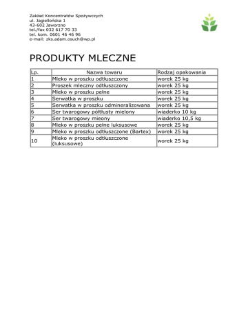 Zakład Koncentratów SpoŜywczych ul. Jagiellońska 1 43-602 Jaworzno tel./fax 032 617 70 33 tel. kom. 0601 46 46 96 e-mail: [email protected] PRODUKTY MLECZNE Lp. 1 2 3 4 5 6 7 8 9 10 Nazwa towaru Mleko w proszku odtłuszczone Proszek mleczny odtłuszczony Mleko w proszku pełne Serwatka w proszku Serwatka w proszku odmineralizowana Ser twarogowy półtłusty mielony Ser twarogowy mieony Mleko w proszku pełne luksusowe Mleko w proszku odtłuszczone (Bartex) Mleko w proszku odtłuszczone (luksusowe) Rodzaj opakowania worek 25 kg worek 25 kg worek 25 kg worek 25 kg worek 25 kg wiaderko 10 kg wiaderko 10,5 kg worek 25 kg worek 25 kg worek 25 kg