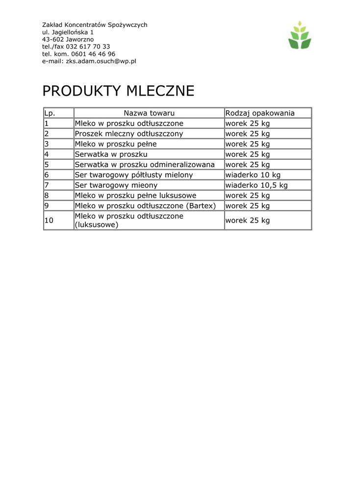 produkty mleczne - zakład koncentratów spożywczych jaworzno