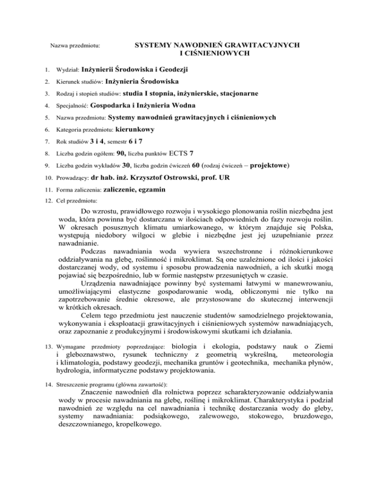 SYSTEMY NAWODNIEŃ GRAWITACYJNYCH I CIŚNIENIOWYCH Nazwa przedmiotu: InŜynierii Środowiska i Geodezji 1. Wydział: 2. Kierunek studiów: 3. Rodzaj i stopień studiów: 4. Specjalność: 5. Nazwa przedmiotu: 6. Kategoria przedmiotu: 7. Rok studiów 3 8. Liczba godzin ogółem: 9. Liczba godzin wykładów 30, liczba godzin ćwiczeń 60 (rodzaj ćwiczeń – 10. Prowadzący: InŜynieria Środowiska studia I stopnia, inŜynierskie, stacjonarne Gospodarka i InŜynieria Wodna Systemy nawodnień grawitacyjnych i ciśnieniowych kierunkowy i 4, semestr 6 i 7 90, liczba punktów ECTS 7 projektowe) dr hab. inŜ. Krzysztof Ostrowski, prof. UR 11. Forma zaliczenia: zaliczenie, egzamin 12. Cel przedmiotu: Do wzrostu, prawidłowego rozwoju i wysokiego plonowania roślin niezbędna jest woda, która powinna być dostarczana w ilościach odpowiednich do fazy rozwoju roślin. W okresach posusznych klimatu umiarkowanego, w którym znajduje się Polska, występują niedobory wilgoci w glebie i niezbędne jest jej uzupełnianie przez nawadnianie. Podczas nawadniania woda wywiera wszechstronne i róŜnokierunkowe oddziaływania na glebę, roślinność i mikroklimat. Są one uzaleŜnione od ilości i jakości dostarczanej wody, od systemu i sposobu prowadzenia nawodnień, a ich skutki mogą pojawiać się bezpośrednio, lub w formie następstw przesuniętych w czasie. Urządzenia nawadniające powinny być systemami łatwymi w manewrowaniu, umoŜliwiającymi elastyczne gospodarowanie wodą, obliczonymi nie tylko na zapotrzebowanie średnie okresowe, ale przystosowane do skutecznej interwencji w krótkich okresach. Celem tego przedmiotu jest nauczenie studentów samodzielnego projektowania, wykonywania i eksploatacji grawitacyjnych i ciśnieniowych systemów nawadniających, oraz zapoznanie z produkcyjnymi i środowiskowymi skutkami ich działania. przedmioty poprzedzające: biologia i ekologia, podstawy nauk o Ziemi i gleboznawstwo, rysunek techniczny z geometrią wykreślną, meteorologia i klimatologia, podstawy geodezji, mechanika gruntów i geotechnika, mechanika płynów, hydrologia, informatyczne podstawy projektowania. 13. Wymagane 14. Streszczenie programu (główna zawartość): Znaczenie nawodnień dla rolnictwa poprzez scharakteryzowanie oddziaływania wody w procesie nawadniania na glebę, roślinę i mikroklimat. Charakterystyka i podział nawodnień ze względu na cel nawadniania i technikę dostarczania wody do gleby, systemy nawadniania: podsiąkowego, zalewowego, stokowego, bruzdowego, deszczownianego, kropelkowego. 15. Program przedmiotu z rozplanowaniem godzinowym: Semestr 6 wykłady (15 h) 1. Rola nawodnień w rolnictwie i ich podział ze względu na cel nawadniania. 2. Działanie wody w procesie nawadniania – na glebę, mikroklimat i roślinność. 3. Klasyfikacja techniczna nawodnień. 4. Zasadnicze elementy sieci nawadniającej. 5. Doprowadzenie wody na obiekt nawadniany i budowle na sieci doprowadzającej. Rodzaje doprowadzalników ich trasa i profil podłuŜny. 6. Sprawność działania i straty przepływu na sieci doprowadzającej. Współczynnik sprawności doprowadzalników. 7. Projektowanie przekroju poprzecznego doprowadzalników. 8. Obliczanie zapotrzebowania wody do nawodnień zwilŜających. Wyznaczanie jednorazowych dawek polewowych. 9. Nawodnienia podsiąkowe i przesiąkowe- warunki stosowania. 10. Obliczanie nawodnień podsiąkowych ze stałym piętrzeniem, ze zmiennym piętrzeniem, w tym w warunkach gleb organicznych. 11. Systemy nawodnień zalewowych. 12. Obliczanie nawodnień zalewowych w warunkach płytkiego i głębokiego zalegania wód gruntowych. Współczynniki wykorzystania wody. 13. Systemy nawodnień stokowych. Obliczanie nawodnień stokowych. 14. Nawadnianie bruzdowe – warunki stosowania i zasady obliczeń. 15. Kryteria wyboru systemu nawodnień i budowle na sieci rozdzielczej i szczegółowej. Stan i perspektywy rozwoju nawodnień na świecie. Pogląd na kierunki melioracji nawadniających w Polsce oraz zarys ich rozwoju. − 1 godz. 1 godz. 1 godz. 1 godz. 1 godz. 1 godz. 1 godz. 1 godz. 1 godz. 1 godz. 1 godz. 1 godz. 1 godz. 1 godz. 1 godz. ćwiczenia (30 h) Harmonogram ćwiczeń: Projekt nawadniania podsiąkowego uŜytków zielonych. Wydanie i wstępne omówienie tematu projektu. Obliczenie przepływów dyspozycyjnych do nawadniania. Określenie głębokości i rozstawy rowów odwadniająco-nawadniajacych. Obliczenie jednorazowej dawki polewowej netto. Obliczenie dawki sezonowej netto – ustalenie potrzeb wodnych roślin metodą opadów optymalnych, metodą higrometrycznego współczynnika parowania terenowego, metodą termicznego współczynnika parowania terenowego, obliczenie niedoborów wodnych. Ustalenie ilości nawodnień. 6. Obliczenie czasu trwania i niezbędnych dopływów jednostkowych w poszczególnych fazach realizacji nawadniania w warunkach gleb mineralnych i organicznych. 7. Wybór schematu eksploatacyjnego nawadniania. 8. Zasady projektowania tras rowów głównych. Zasady rozmieszczania zastawek piętrzących. Wykreślenie profili podłuŜnych rowów głównych. 9. Wykreślenie przekrojów poprzecznych rowów głównych. 10. Zaprojektowanie rzędnych dna i głębokości rowów odwadniająconawadniających. Wykonanie przekroju przez obiekt nawadniany. 11. Obliczenie światła zastawki piętrzącej. 1. 2. 3. 4. 5. 2 godz. 2 godz. 2 godz. 2 godz. 4 godz. 2 godz. 2 godz. 2 godz. 2 godz. 2 godz. 2 godz. 12. Zestawienie kubatury rowów głównych i rowów odwadniająconawadniających. Zestawienie rodzajów i ilości budowli. 13. Rysunki robocze projektowanych budowli 14. Sprawozdanie techniczne zawierające: wiadomości wstępne, połoŜenie obiektu, warunki geognostyczne i hydrograficzne, uzasadnienie wykonania inwestycji, opis zaprojektowanych rozwiązań, metody konserwacji urządzeń melioracyjnych. Omówienie formy opracowania końcowego projektu 2 godz. 2 godz. 2 godz. Semestr 7 − wykłady (15 h) 1. Przyrodnicze, rolnicze i ekonomi