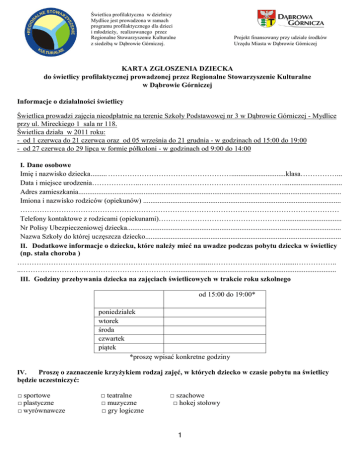 Świetlica profilaktyczna w dzielnicy Mydlice jest prowadzona w ramach programu profilaktycznego dla dzieci i młodzieży, realizowanego przez Regionalne Stowarzyszenie Kulturalne z siedzibą w Dąbrowie Górniczej. Projekt finansowany przy udziale środków Urzędu Miasta w Dąbrowie Górniczej KARTA ZGŁOSZENIA DZIECKA do świetlicy profilaktycznej prowadzonej przez Regionalne Stowarzyszenie Kulturalne w Dąbrowie Górniczej Informacje o działalności świetlicy Świetlica prowadzi zajęcia nieodpłatnie na terenie Szkoły Podstawowej nr 3 w Dąbrowie Górniczej - Mydlice przy ul. Mireckiego 1 sala nr 118. Świetlica działa w 2011 roku: - od 1 czerwca do 21 czerwca oraz od 05 września do 21 grudnia - w godzinach od 15:00 do 19:00 - od 27 czerwca do 29 lipca w formie półkoloni - w godzinach od 9:00 do 14:00 I. Dane osobowe Imię i nazwisko dziecka ......... ……………………………………………..............................klasa……………... Data i miejsce urodzenia………………..……………………………………………………................................ Adres zamieszkania................................................................................................................................................. Imiona i nazwisko rodziców (opiekunów) ............................................................................................................. …………………………………………………………………………………………………………………… Telefony kontaktowe z rodzicami (opiekunami)……………………………………………................................. Nr Polisy Ubezpieczeniowej dziecka...................................................................................................................... Nazwa Szkoły do której uczęszcza dziecko............................................................................................................ II. Dodatkowe informacje o dziecku, które należy mieć na uwadze podczas pobytu dziecka w świetlicy (np. stała choroba ) ………………………………………………………………….......…………………...……........…………….. ..……………………………………………………….......................................................................................... III. Godziny przebywania dziecka na zajęciach świetlicowych w trakcie roku szkolnego od 15:00 do 19:00* poniedziałek wtorek środa czwartek piątek *proszę wpisać konkretne godziny IV. Proszę o zaznaczenie krzyżykiem rodzaj zajęć, w których dziecko w czasie pobytu na świetlicy będzie uczestniczyć: □ sportowe □ plastyczne □ wyrównawcze □ teatralne □ muzyczne □ gry logiczne □ szachowe □ hokej stołowy 1 Informacje o odbieraniu dziecka ze świetlicy profilaktycznej 1. Dziecko będzie odbierane przez (imiona i nazwiska osób upoważnionych, nr dowodu osobistego, stopień pokrewieństwa) w załączeniu. 2. Dziecko może być zwolnione ze świetlicy tylko na podstawie pisemnej prośby rodziców (opiekunów). 3. Zwolnienia telefoniczne nie będą uwzględniane. 4. Rodzice, osoby upoważnione do odbioru dziecka, zobowiązane są do zabrania dziecka ze świetlicy do godziny 19:00. 5. Od godziny 19:00 odpowiedzialność za dziecko ponoszą rodzice (opiekunowie) dziecka. .................................................................. data, podpis rodzica, opiekuna Samodzielny powrót dziecka do domu Wyrażam zgodę na samodzielny powrót dziecka do domu o godzinie....................................................... ...................................................................... data, podpis rodzica, opiekuna ZOBOWIĄZUJĘ SIĘ DO: Podawania do wiadomości wszelkich zmian w podanych informacjach; Zapoznania i przestrzegania postanowień Regulaminu świetlicy. Pokrycia wszelkich szkód wyrządzonych przez dzciecko w czasie pobytu w świetlicy Niniejszym przyjmuję do wiadomości i wyrażam zgodę na gromadzenie, przetwarzanie i udostępnianie danych osobowych zawartych w karcie zgłoszenia dziecka w związku z realizacją zadania publicznego Gminy Dąbrowa Górnicza o nazwie: Program profilaktyczny realizowany w świetlicy profilaktycznej w dzielnicy Mydlice. Przetwarzanie danych odbywać się będzie zgodnie z ustawą o ochronie danych osobowych (Dz. U. z 2002 r. Nr 101, poz. 926 z późniejszymi zmianami). ......................................................................... data, podpis rodzica, opiekuna Zgoda rodziców na udział w wycieczce Wyrażam zgodę na udział mojego dziecka w wycieczkach organizowanych przez świetlicę. Zobowiązuję się do odpowiedzialności materialnej za szkody wyrządzone przez dziecko. ......................................................................... data, podpis rodzica, opiekuna Zgoda rodziców na publikacje wizerunku dziecka *niewłaściwe skreślić Wyrażam zgodę /Nie wyrażam zgody* na publikacje wizerunku dziecka na stronach internetowych: Regionalnego Stowarzyszenia Kulturalnego, Szkoły Podstawowej nr 3 w Dąbrowie Górniczej, Urzędu Miejskiego w Dąbrowie Górniczej w informacji o działalności świetlicy. ......................................................................... data, podpis rodzica, opiekuna Dziecko zakwalifikowano do Świetlicy ....................................................................................... 2 ANEKS DO KARTY ZGŁOSZENIA DZIECKA DO ŚWIETLICY Oświadczenie o odbieraniu dziecka ze świetlicy Imię i nazwisko dziecka ........................................................... Oświadczamy, iż będziemy osobiście odbierać własne dziecko ze świetlicy szkolnej …………………………… imię i nazwisko matki …………………………… nr telefonu …………………………… nr dowodu osobistego …………………………… imię i nazwisko ojca ……………