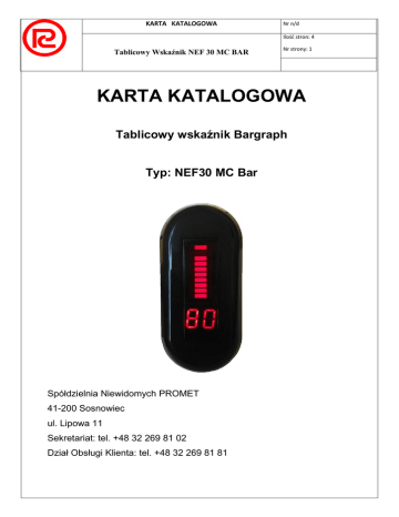 KARTA KATALOGOWA Nr n/d Ilość stron: 4 Tablicowy Wskaźnik NEF 30 MC BAR Nr strony: 1 KARTA KATALOGOWA Tablicowy wskaźnik Bargraph Typ: NEF30 MC Bar Spółdzielnia Niewidomych PROMET 41-200 Sosnowiec ul. Lipowa 11 Sekretariat: tel. +48 32 269 81 02 Dział Obsługi Klienta: tel. +48 32 269 81 81 SN PROMET Strona 2. Stron 4 Nr n/d PRZEZNACZENIE Cyfrowy wskaźnik NEF30 MC typu Bargraph stanowi wzornicze rozwinięcie serii NEF30 zawierającej dotychczas przyciski sterownicze, lampki i wskaźniki sygnalizacyjne. Cechy charakterystyczne wskaźnika serii NEF30 MC Bargraph to: montaż w standardowych otworach Ø 30mm zasilanie – 24V AC/DC Wskaźniki Bargraph zostały przewidziane do stosowania jako przemysłowe wskaźniki tablicowe wraz z pozostałymi aparatami serii NEF30. Lokalny odczyt wartości mierzonych jest możliwy dzięki przetwornikom montowanym w dowolnym miejscu instalacji pomiarowej. Wskaźnik wyposażony jest w dwie pełne cyfry oraz 10 punktową linijkę umożliwiające wyświetlenie wartości w zakresie 0 ÷ 99 jednostek procentowych i wizualnego zapełnienia zakresu pomiarowego. DANE TECHNICZNE Napięcie zasilające 24V AC/DC. Stopień ochrony IP 64 (od frontu), IP 20 (obudowa i zaciski). Pole odczytowe dwa wyświetlacze 7segmentowe LED oraz 10 segmentowa linijka LED. Temperatura pracy -20÷ +50 oC. Moc pobierana 0.3W max. Wilgotność względna max 90% bez kondensacji. Wysokość do 2000 m n.p.m. Max. przekrój przewodów 1.5mm2 przyłączeniowych Wymagania bezpieczeństwa wg. PN-EN 61010-1. Stopień zanieczyszczenia 2. Izolacja między obwodami podstawowa. Odporność na zakłócenia wg. PN-EN 61000-6-2. Emisja zakłóceń wg. PN-EN 61000-6-4. Błąd podstawowy 5% zakresu. SN PROMET Strona 3 Stron 4 Nr n/d MOCOWANIE MECHANICZNE / MONTAŻ Wskaźniki przystosowane są do montażu w standardowych otworach Ø 30.5mm. Zamocowanie wskaźnika NEF30 MC Bargraph pokazane jest na Rys. 1.a i Rys 1.b. 3 2 1 2 1 Rys. 1a Rys. 1b Wskaźnik cyfrowy (1) wkłada się do otworu montażowego od strony przedniej pulpitu (2) i dokręca się nakrętkę mocującą (3) pod pulpitem. OPIS OGÓLNY Widok wskaźnika i sposób mocowania przedstawia Rys. 2. Wskaźnik posiada dwa ukryte pod przednią maskownicą przyciski konfiguracyjne służące do (i) wyboru rodzaju wejścia (napięciowe, prądowe), (ii) ustawienia wartości wejścia. Dostęp do przycisków jest możliwy pod zdjęciu maskownicy za pomocą specjalnego narzędzia dostarczanego wraz ze wskaźnikiem. Widok wskaźnika od strony czołowej po zdjęciu maskownicy pokazano na Rys. 3. Strona 4 Stron 4 Nr n/d 38 SN PROMET 62 Nakrętka mocująca Uszczelka 16 Maskownica 84 Rys. 2 Widok ogólny wskaźnika. Przyciski programowania Rys. 3 Widok od strony czołowej po zdjęciu maskownicy.