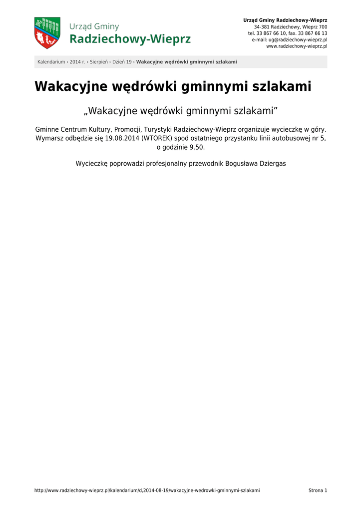 Urząd Gminy Radziechowy-Wieprz 34-381 Radziechowy, Wieprz 700 tel. 33 867 66 10, fax. 33 867 66 13 e-mail: [email protected] www.radziechowy-wieprz.pl Kalendarium › 2014 r. › Sierpień › Dzień 19 › Wakacyjne wędrówki gminnymi szlakami Wakacyjne wędrówki gminnymi szlakami „Wakacyjne wędrówki gminnymi szlakami” Gminne Centrum Kultury, Promocji, Turystyki Radziechowy-Wieprz organizuje wycieczkę w góry. Wymarsz odbędzie się 19.08.2014 (WTOREK) spod ostatniego przystanku linii autobusowej nr 5, o godzinie 9.50. Wycieczkę poprowadzi profesjonalny przewodnik Bogusława Dziergas http://www.radziechowy-wieprz.pl/kalendarium/d,2014-08-19/wakacyjne-wedrowki-gminnymi-szlakami Strona 1