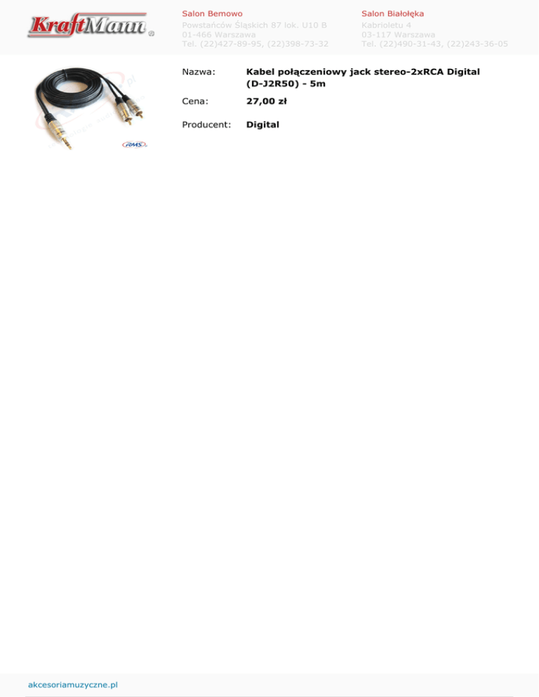 akcesoriamuzyczne.pl Salon Bemowo Salon Białołęka Powstańców Śląskich 87 lok. U10 B 01-466 Warszawa Tel. (22)427-89-95, (22)398-73-32 Kabrioletu 4 03-117 Warszawa Tel. (22)490-31-43, (22)243-36-05 Nazwa: Kabel połączeniowy jack stereo-2xRCA Digital (D-J2R50) - 5m Cena: 27,00 zł Producent: Digital