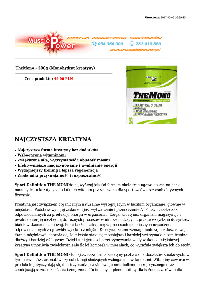 Utworzono: 2017-03-08 16:29:40 TheMono - 500g (Monohydrat kreatyny) Cena produktu: 49,00 PLN NAJCZYSTSZA KREATYNA ● ● ● ● ● ● Najczystsza forma kreatyny bez dodatków Wzbogacona witaminami Zwiększona siła, wytrzymałość i objętość mięśni Efektywniejsze magazynowanie i uwalnianie energii Wydajniejszy trening i lepsza regeneracja Znakomita przyswajalność i rozpuszcalność Sport Definition THE MONOto najwyższej jakości formuła około treningowa oparta na bazie monohydratu kreatyny z dodatkiem witamin przeznaczona dla sportowców oraz osób aktywnych fizycznie. Kreatyna jest związkiem organicznym naturalnie występującym w ludzkim organizmie, głównie w mięśniach. Podstawowym jej zadaniem jest wytwarzanie i przenoszenie ATP, czyli cząsteczek odpowiedzialnych za produkcję energii w organizmie. Dzięki kreatynie, organizm magazynuje i uwalnia energię niezbędną do różnych procesów w nim zachodzących, przede wszystkim do syntezy białek w tkance mięśniowej. Pełni także istotną rolę w procesach chemicznych organizmu odpowiedzialnych za prawidłowy skurcz mięśni. Kreatyna, zatem wzmaga budowę beztłuszczowej tkanki mięśniowej, sprawiając, że mięśnie stają się mocniejsze i bardziej wytrzymałe a sam trening dłuższy i bardziej efektywny. Dzięki umiejętności przetrzymywania wody w tkance mięśniowej kreatyna umożliwia zwielokrotnienie ilości komórek w mięśniach, co wyraźnie zwiększa ich objętość. Sport Definition THE MONO to najczystsza forma kreatyny pozbawiona dodatków smakowych, w tym barwników, aromatów czy substancji słodzących wzbogacona witaminami. Witaminy zawarte w produkcie przyczyniają się do utrzymania prawidłowego metabolizmu energetycznego oraz zmniejszają uczucie znużenia i zmęczenia. To idealny suplement diety dla każdego, zarówno dla profesjonalnego sportowca, jak i dla osoby aktywnej fizycznie. Zdecydowanie zwiększa siłę, wytrzymałość i objętość mięśni oraz przyspiesza regenerację po intensywnym treningu. Dzięki formule instant Sport Definition THE MONO znakomicie się rozpuszcza i błyskawicznie wchłania się do organizmu. Skład: Porcja: 3,5 g Porcji w opakowaniu: 143 Opakowanie: 500 g Skład w 3,5 g Witamina B6 1,4 mg (100%) Witamina B12 2,5 µg (100%) Niacyna 8 mg (50%) Monohydrat kreatyny 3400 mg Dawkowanie: Zmieszać 1 miarkę proszku (3,5 g) ze 150-200 ml wody. Spożywać przed lub bezpośrednio po treningu. Adres: http://www.muscle.trustnet.pl/ Telefon: 34 36 43 000, 782 010 880 Email: [email protected]
